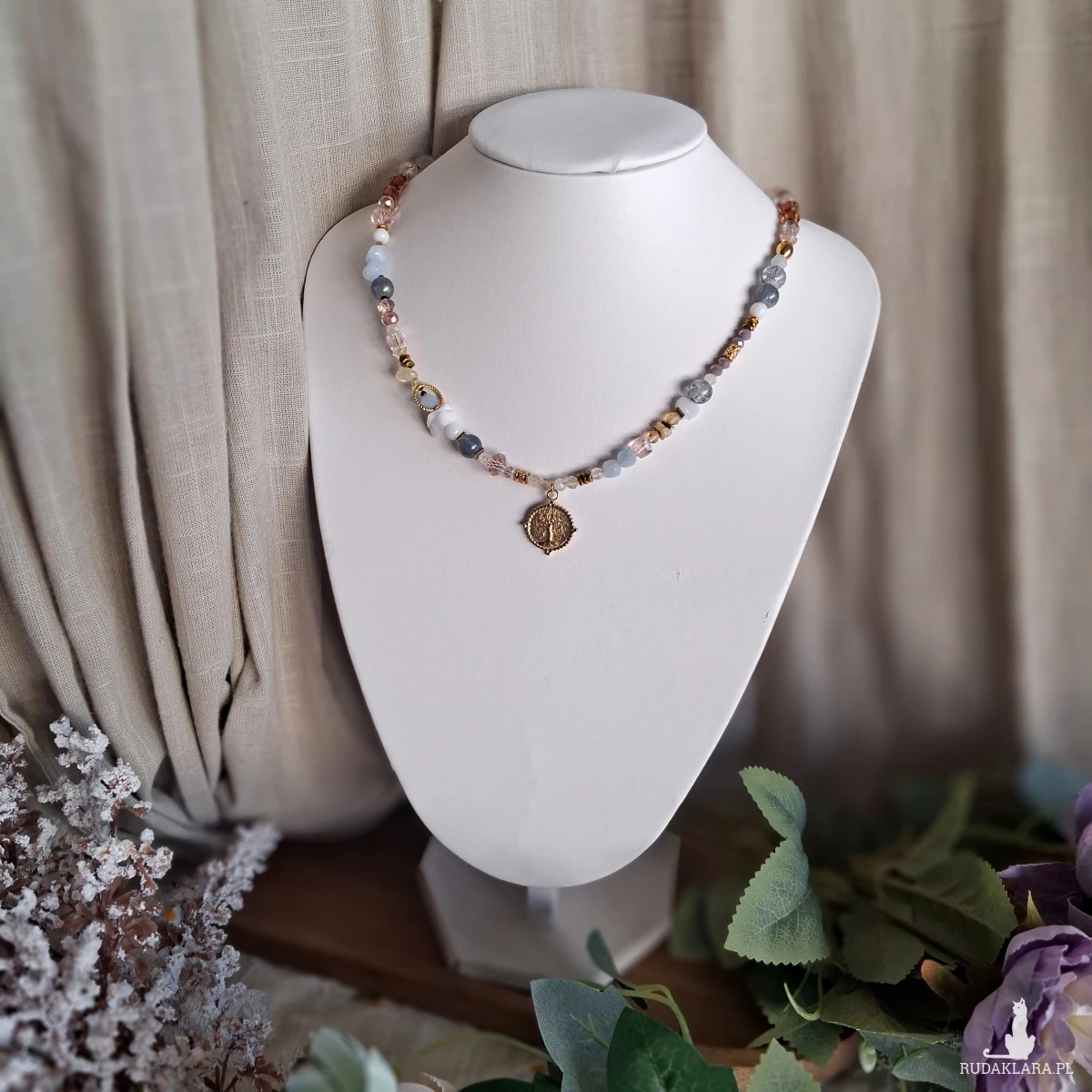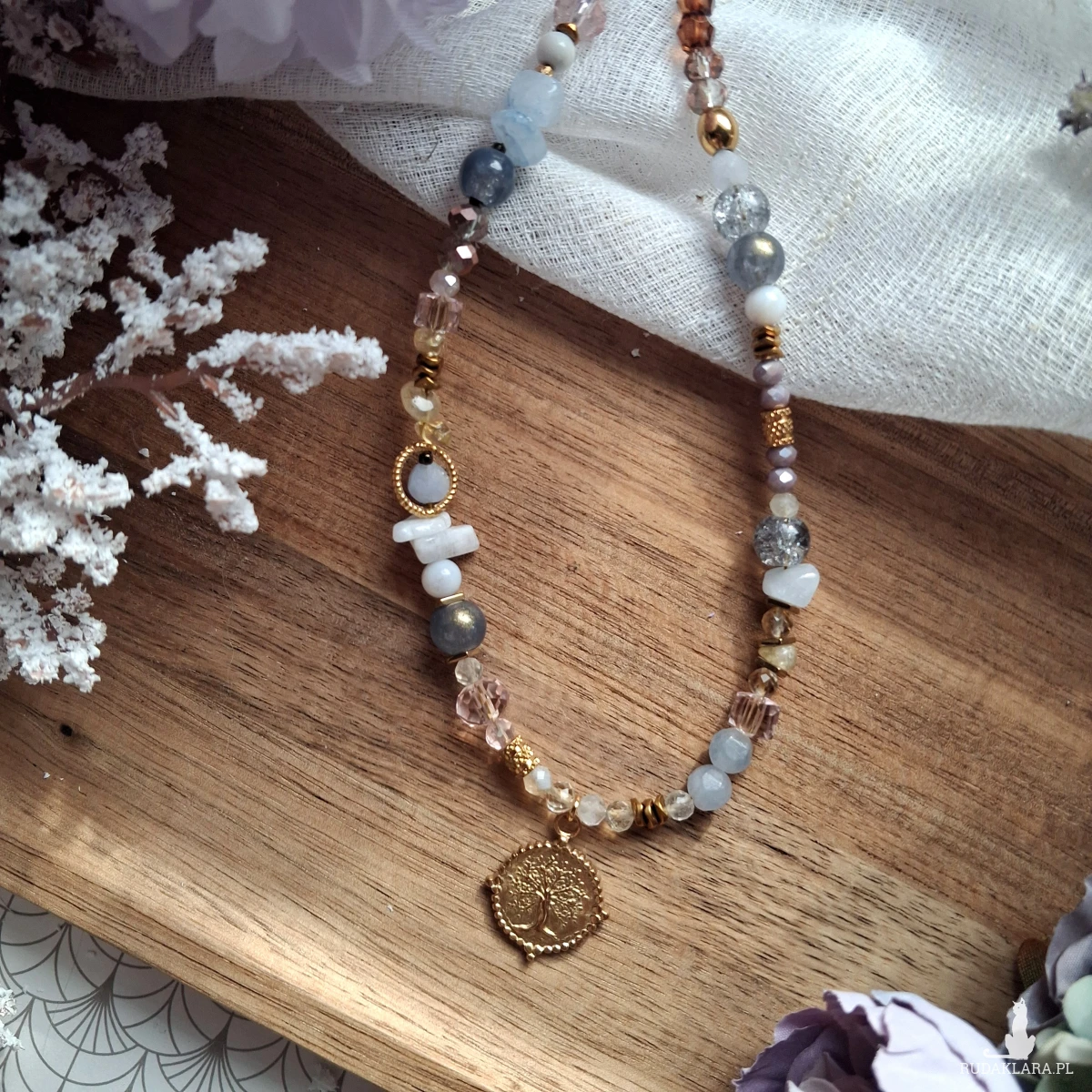 Naszyjnik wykonany ze stali nierdzewnej (jubilerskiej), akrylowych i szklanych koralików oraz kamieni naturalnych. Użyte kamienie: