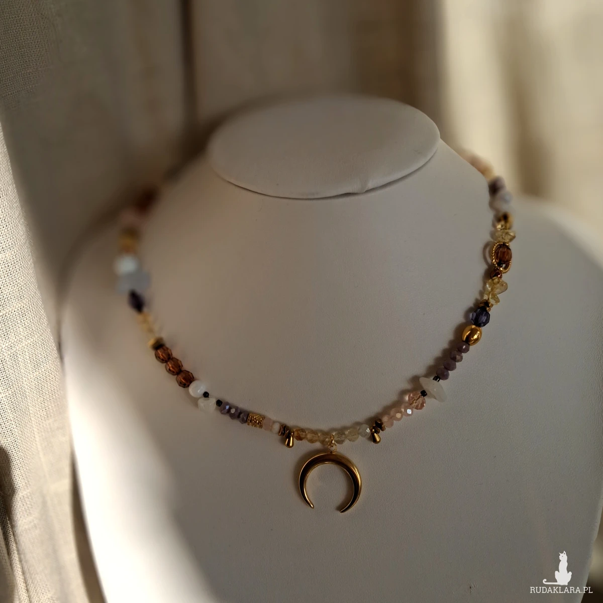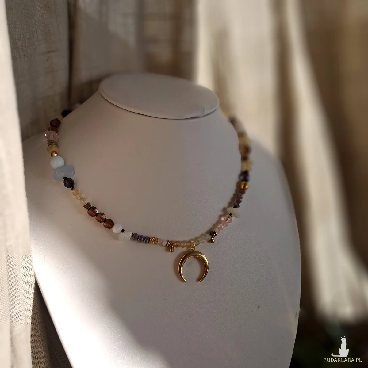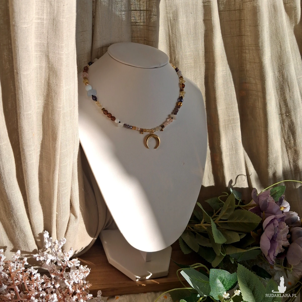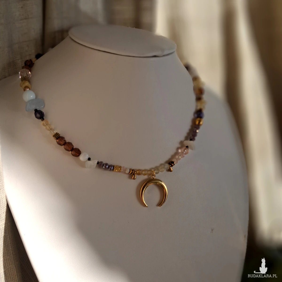 Naszyjnik wykonany ze stali nierdzewnej (jubilerskiej), akrylowych i szklanych koralików oraz kamieni naturalnych. Użyte kamienie:
