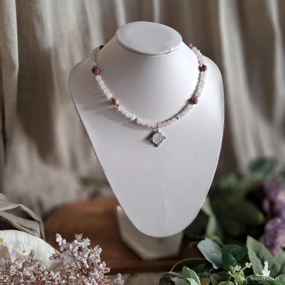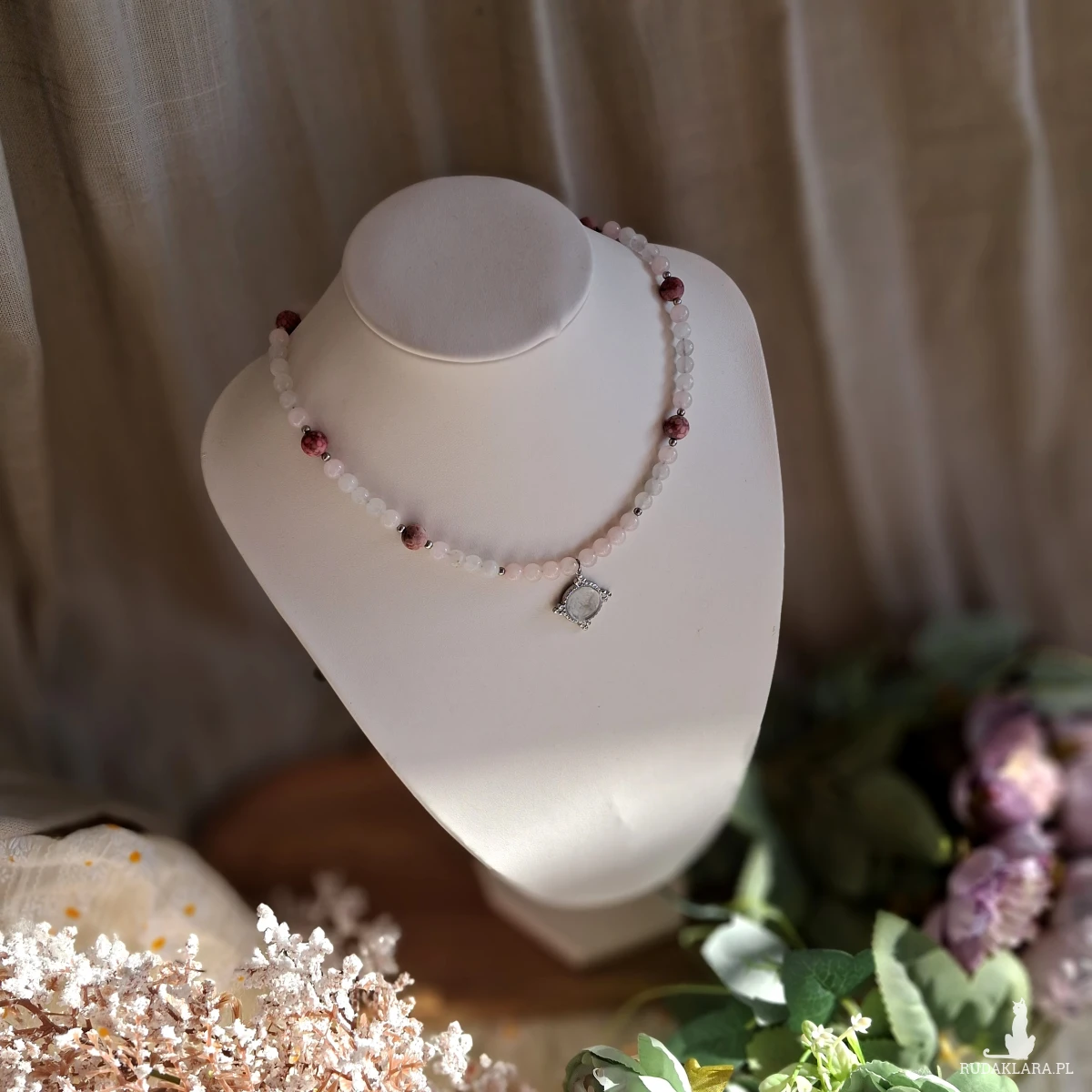 Naszyjnik wykonany z stali nierdzewnej (jubilerskiej) i kamieni naturalnych. Użyte kamienie:
