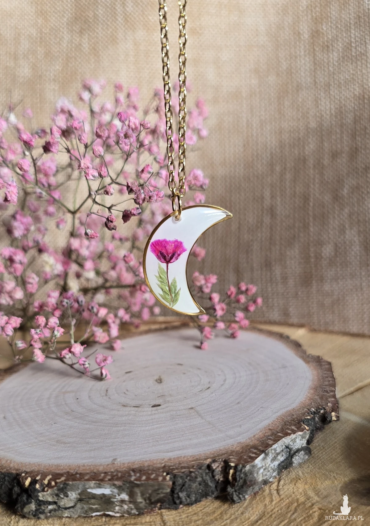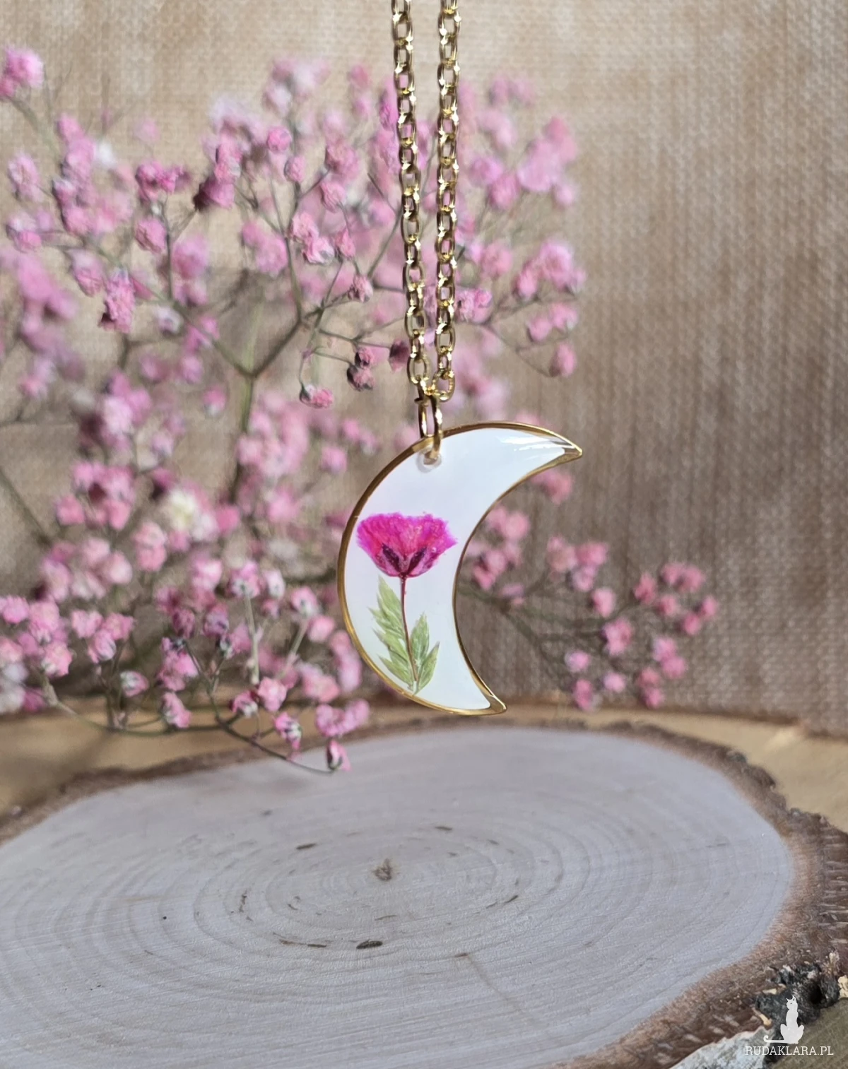 złota zawieszka złoty wisiorek naszyjnik żywica z żywicy kwiaty z kwiatami księżyc kwiaty żywica biżuteria gipsówka
