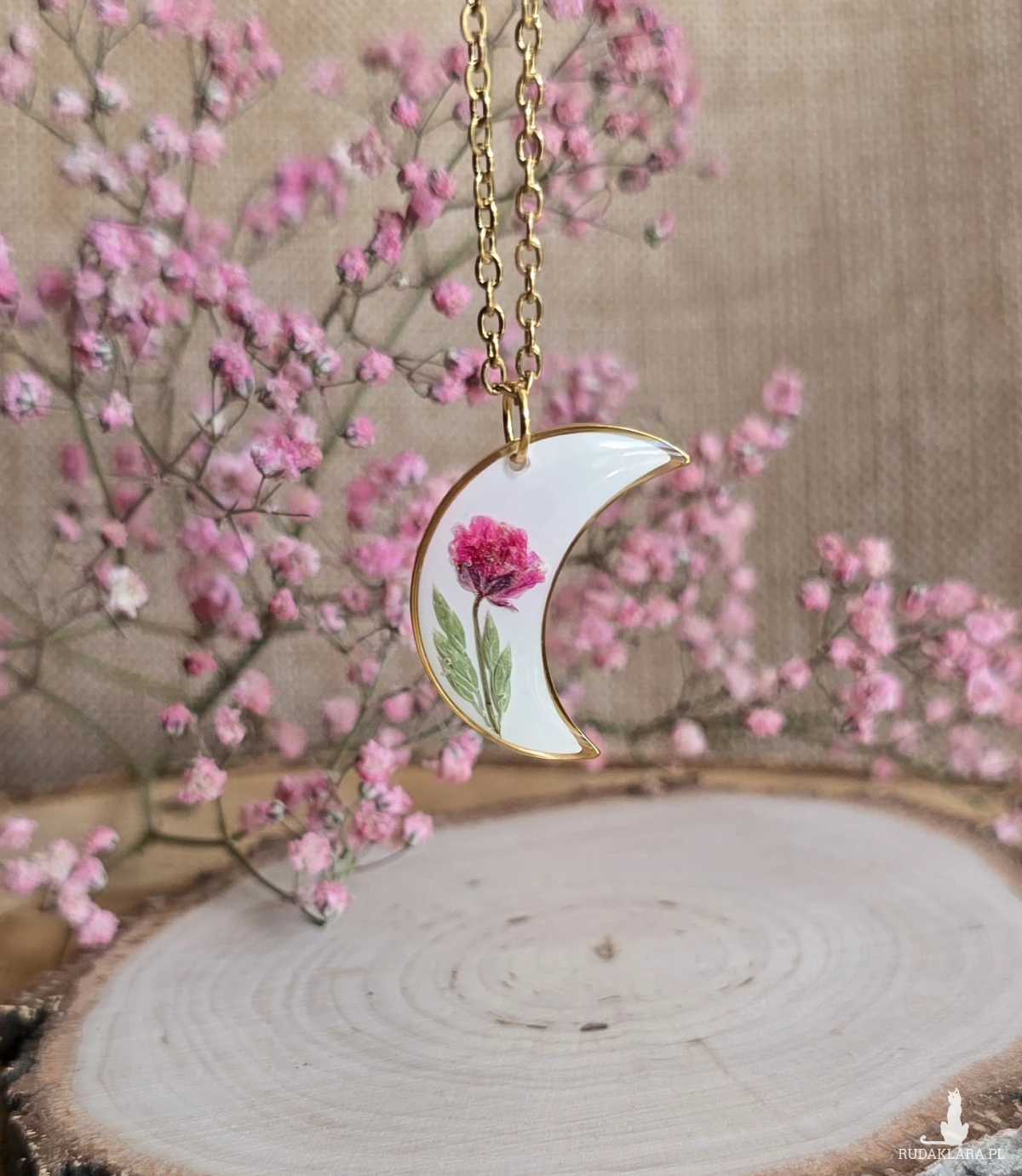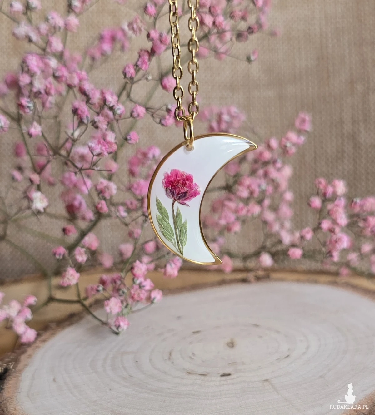 złota zawieszka złoty wisiorek naszyjnik żywica z żywicy kwiaty z kwiatami księżyc kwiaty żywica biżuteria gipsówka