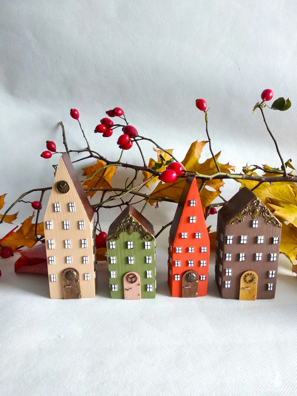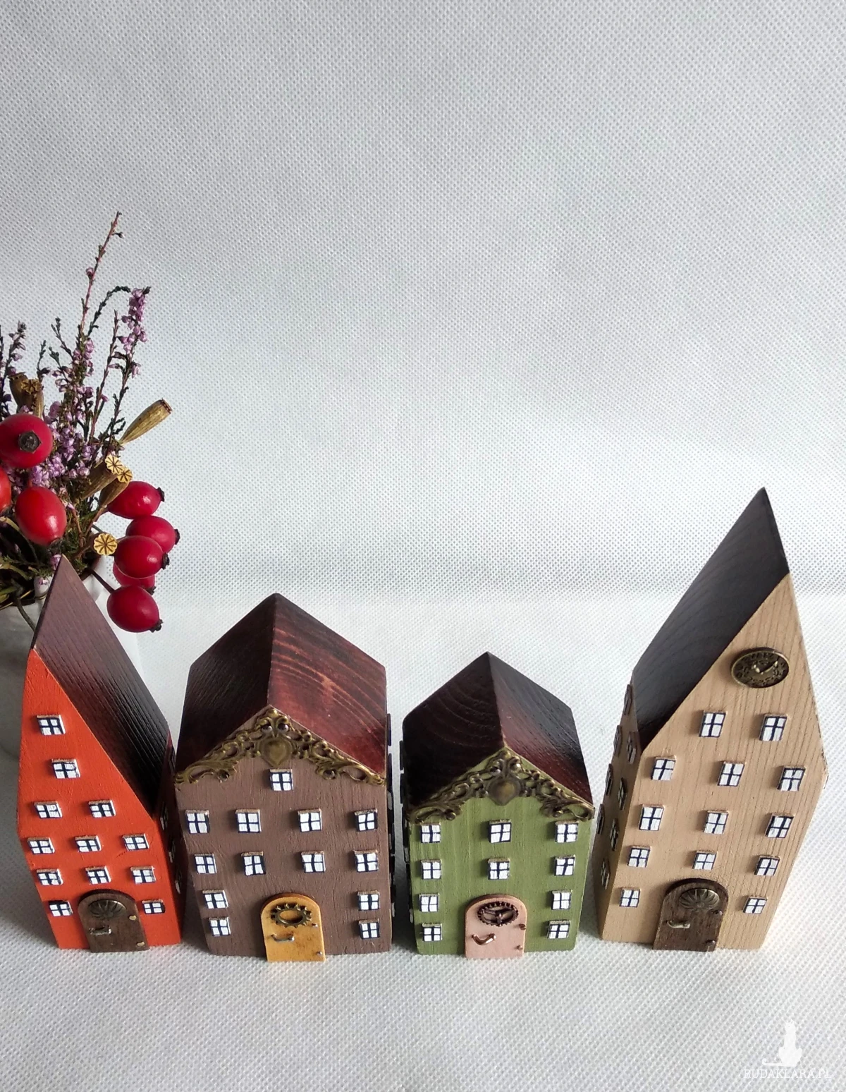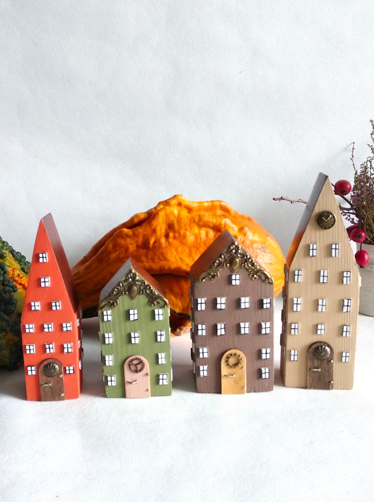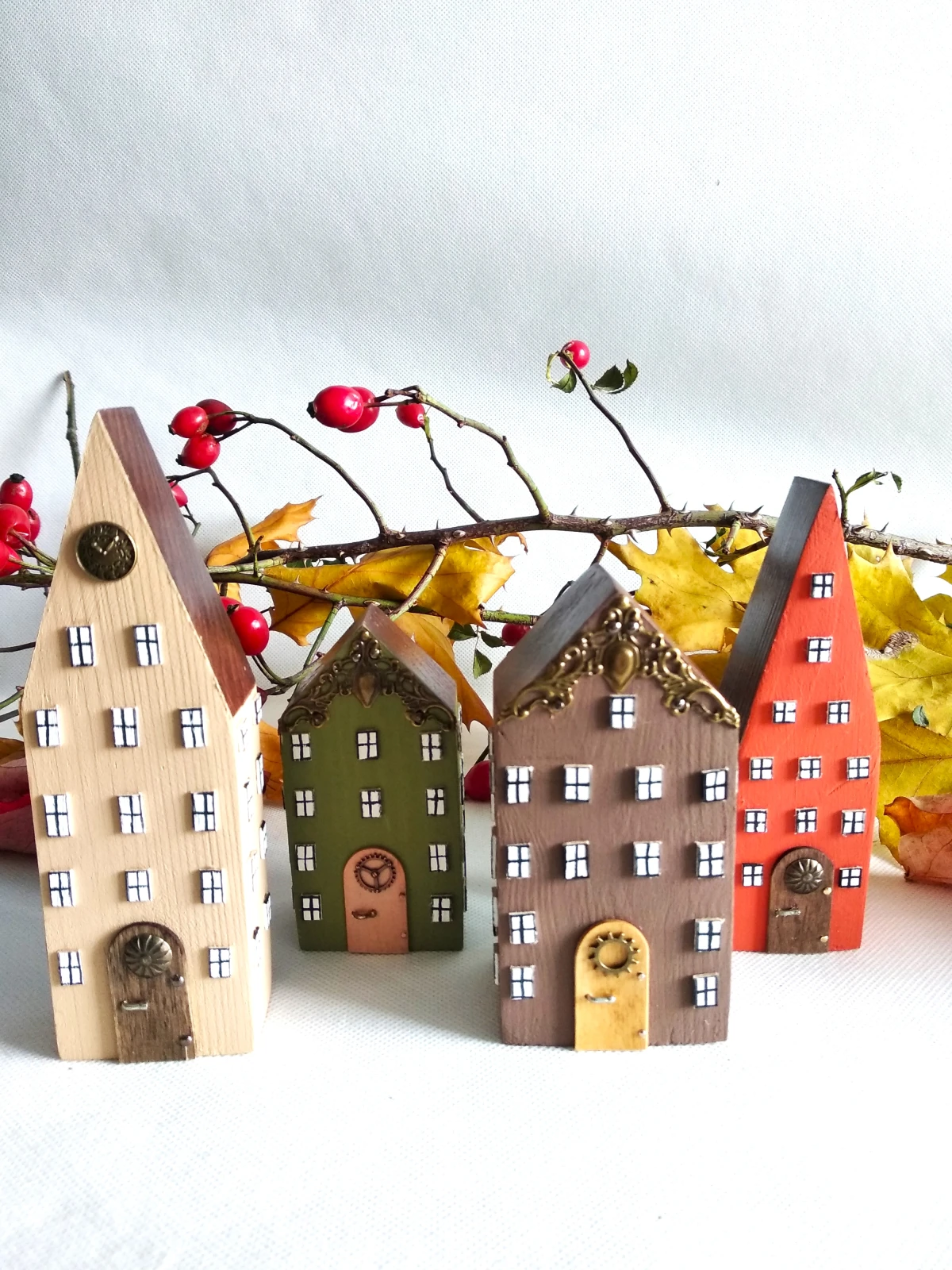 W samym sercu jesieni, gdy świat zwalnia tempo, a powietrze pachnie drewnem i liśćmi, rodzi się Jesienne Miasteczko, cztery drewniane domki, każdy w innym odcieniu tej pięknej pory roku. Razem tworzą harmonijną całość, która wnosi do wnętrza ciszę jesiennego dnia i nutkę nostalgii. Postaw je na parapecie, komodzie lub stole, by codziennie przypominały o tym, że jesień to czas zatrzymania, ciepła i prostych radości.