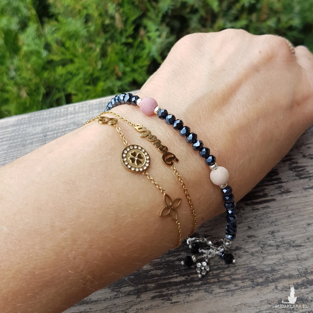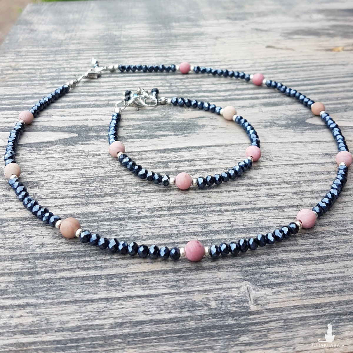 Komplet z kulek rodonitu w kolorze pudrowego różu i z koralików szklanych w kolorze hematytu. Koraliki szlifowane, drobne 4 mm, rodonit kulka 6 mm. Naszyjnik obj 46 cm, bransoletka obj. 21 cm