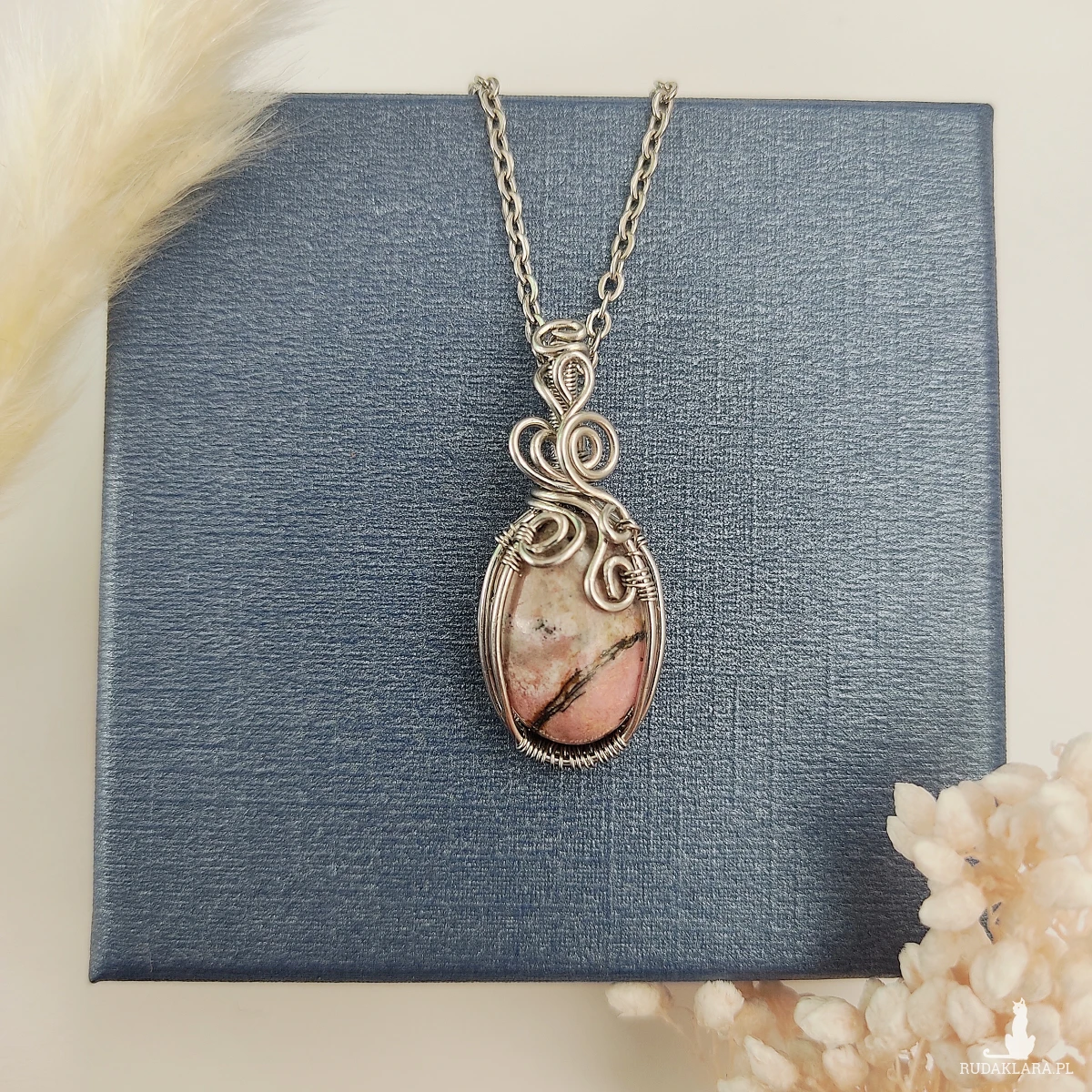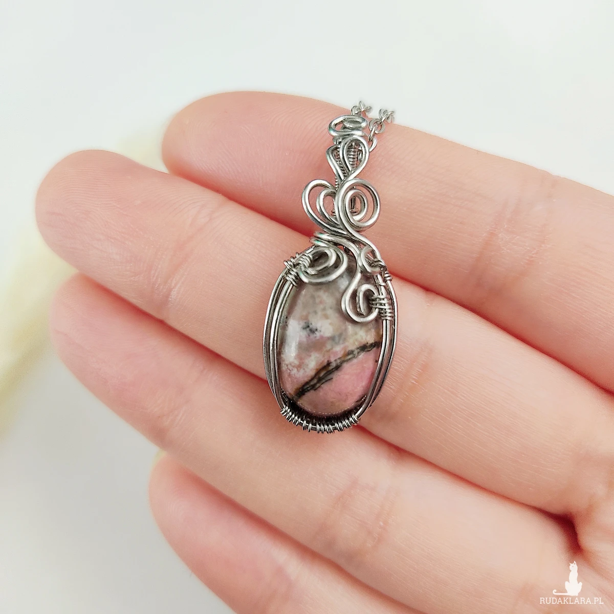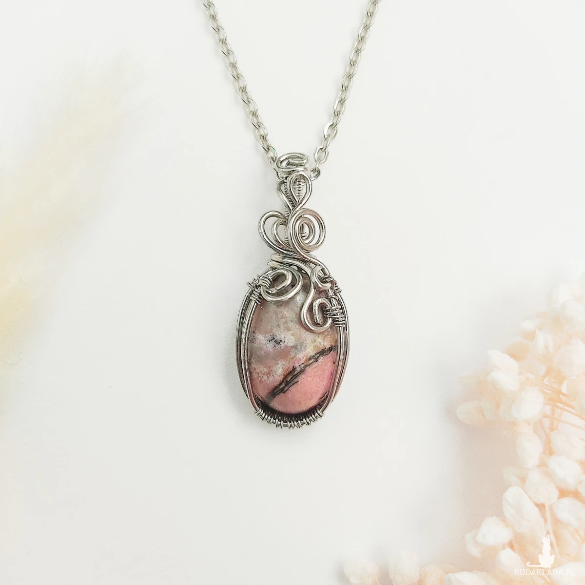 Naszyjnik Rodonit ręcznie robiony. Wykonany techniką wire wrapping z drutów ze stali chirurgicznej.