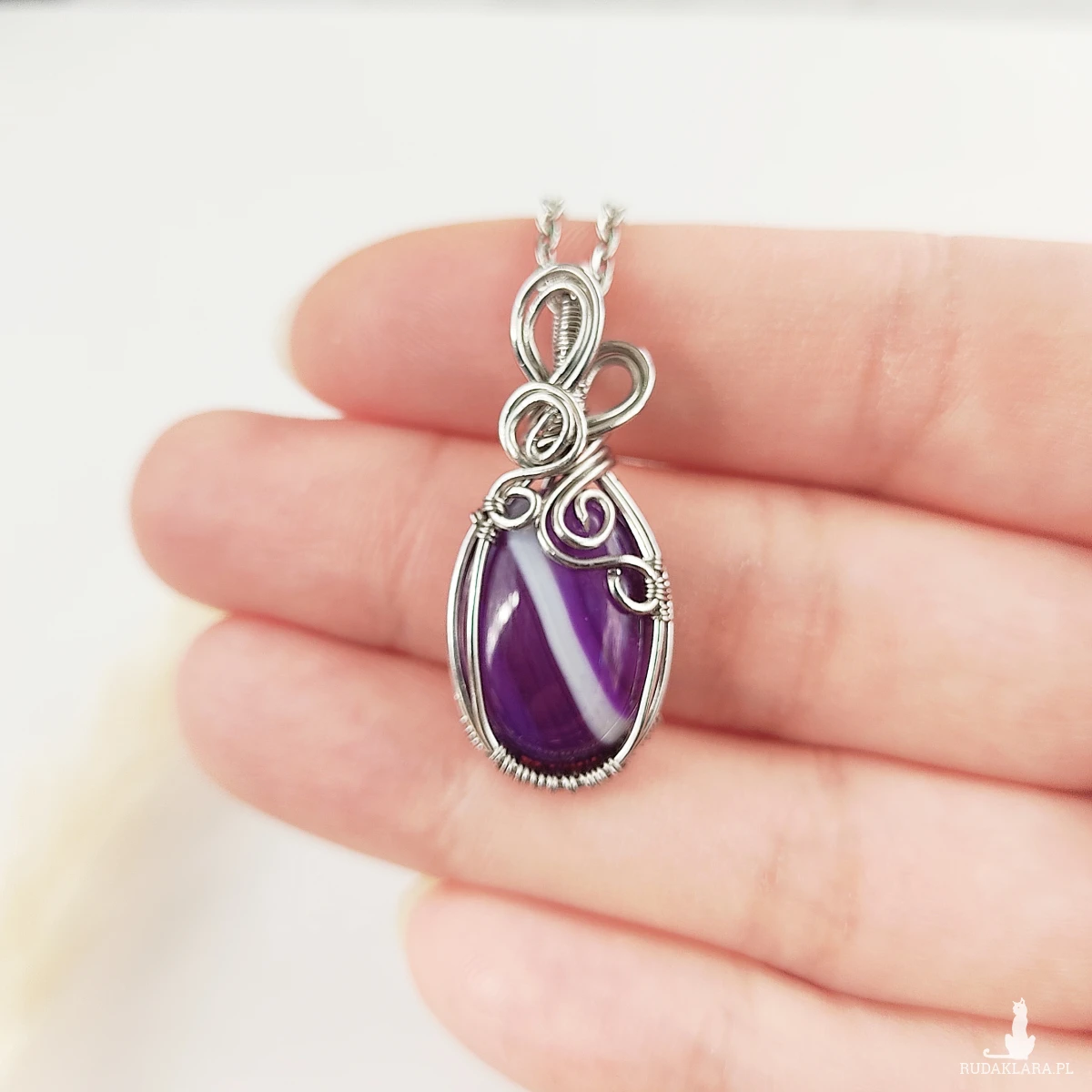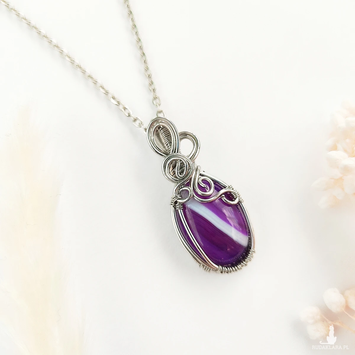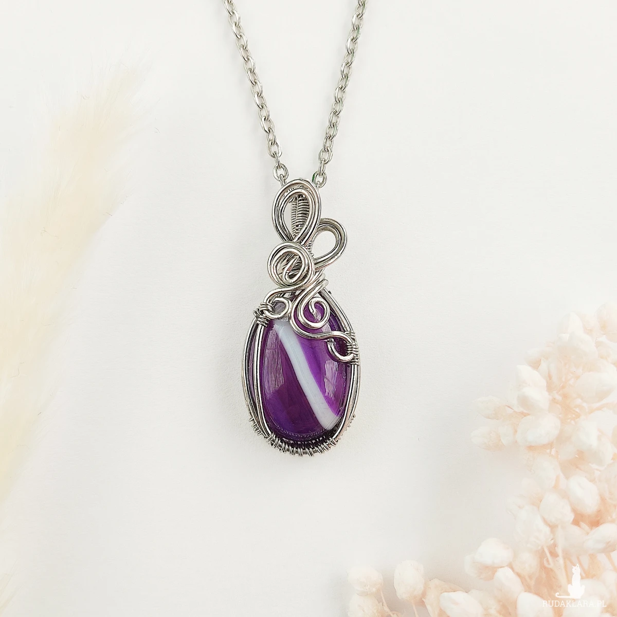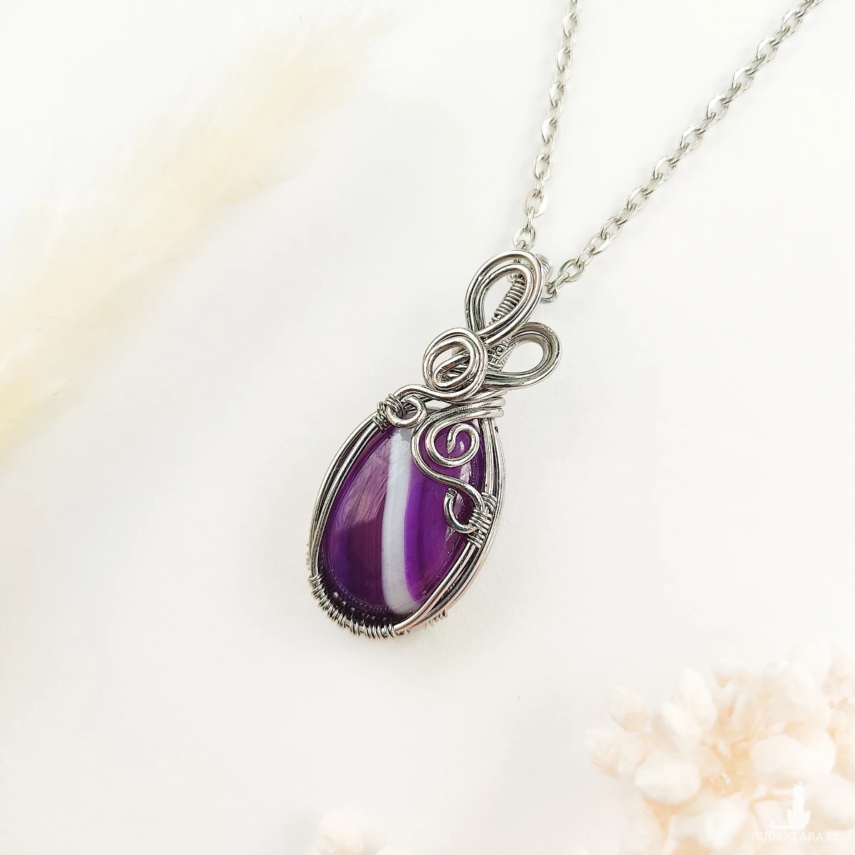 Naszyjnik Agat Fioletowy ręcznie robiony. Wykonany techniką wire wrapping z drutów ze stali chirurgicznej.