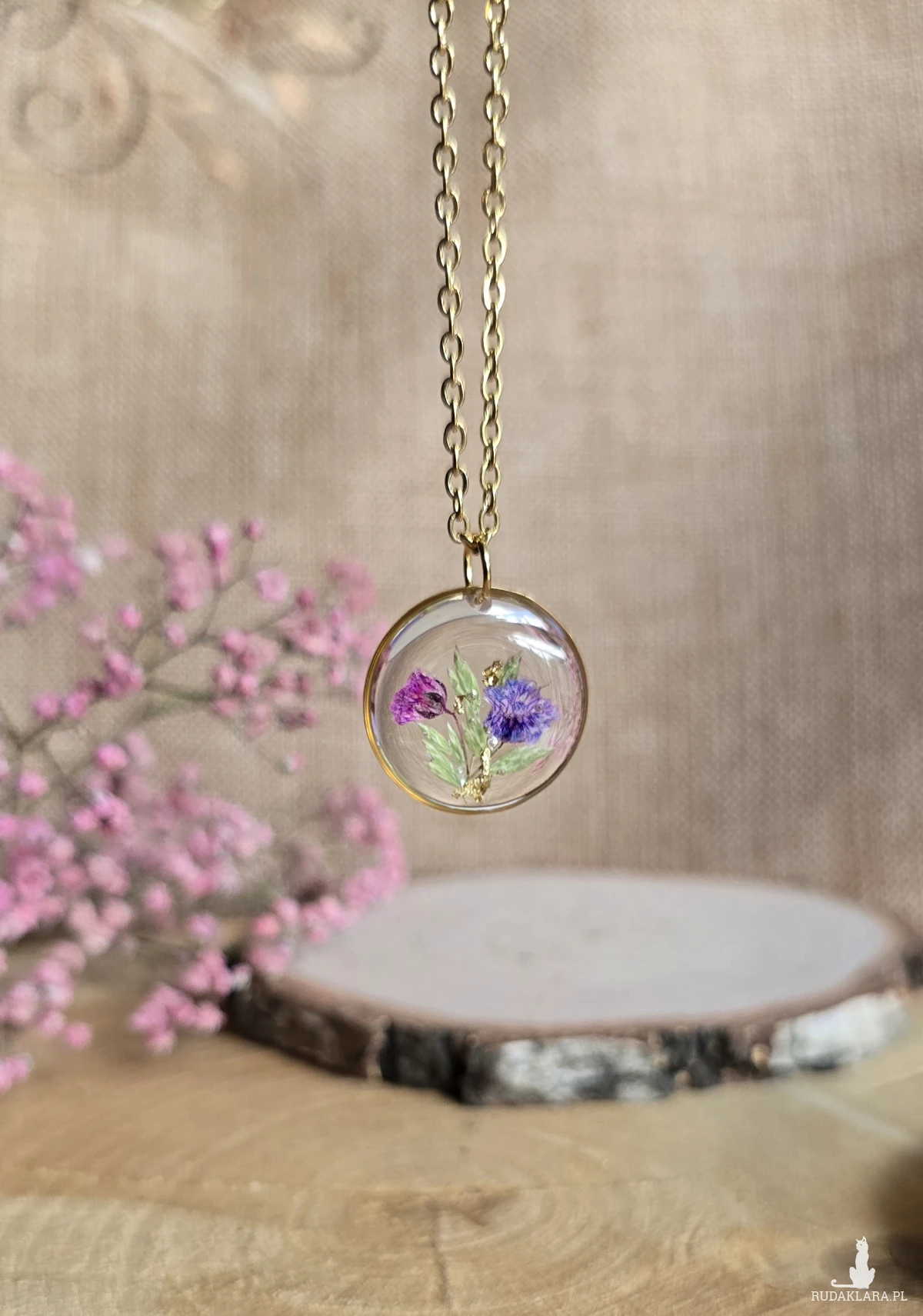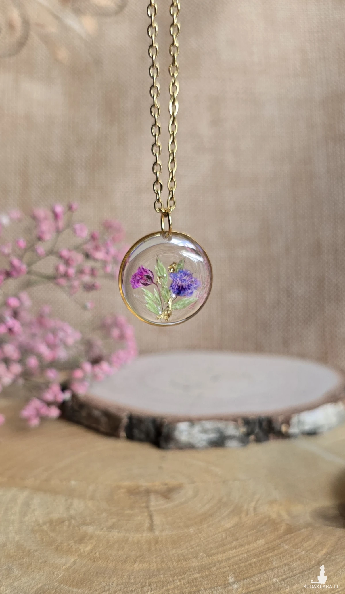 Oferuję Państwu unikalną biżuterię. Zawieszka jest wykonana z suszonych kwiatów i żywicy epoksydowej. Biżuteria jest wspaniałym i oryginalnym prezentem na lata.