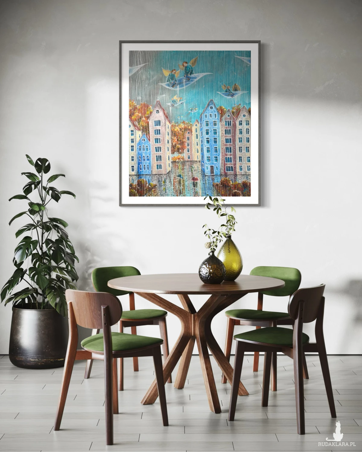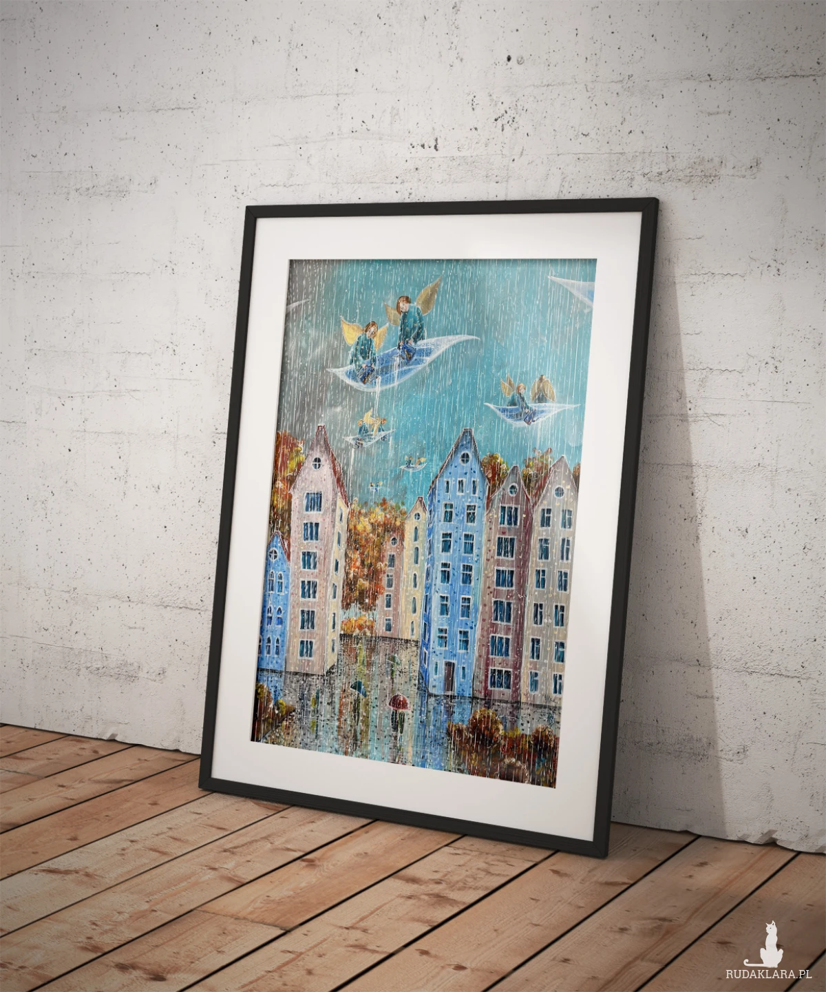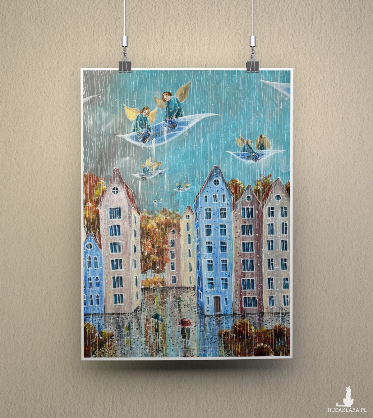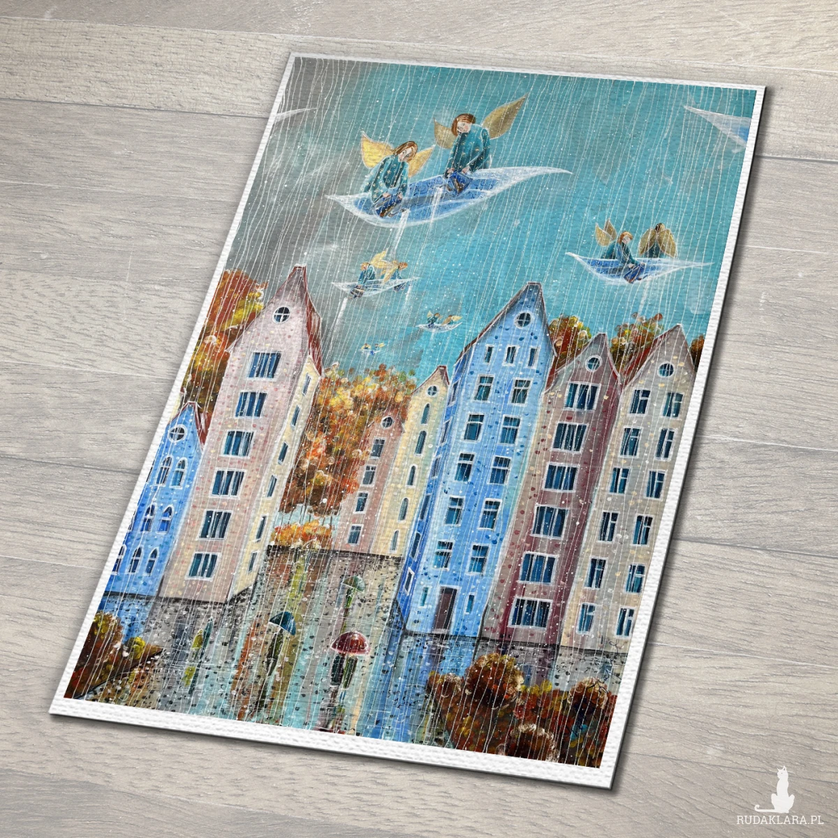 Reprodukcja pracy własnej pt. "Deszczowy dzień", wykonana na wysokiej jakości papierze satynowanym o gramaturze 200-220 g/m². Przy zainteresowaniu plakatami o innych wymiarach lub wykonaniu giclee, proszę o kontakt.