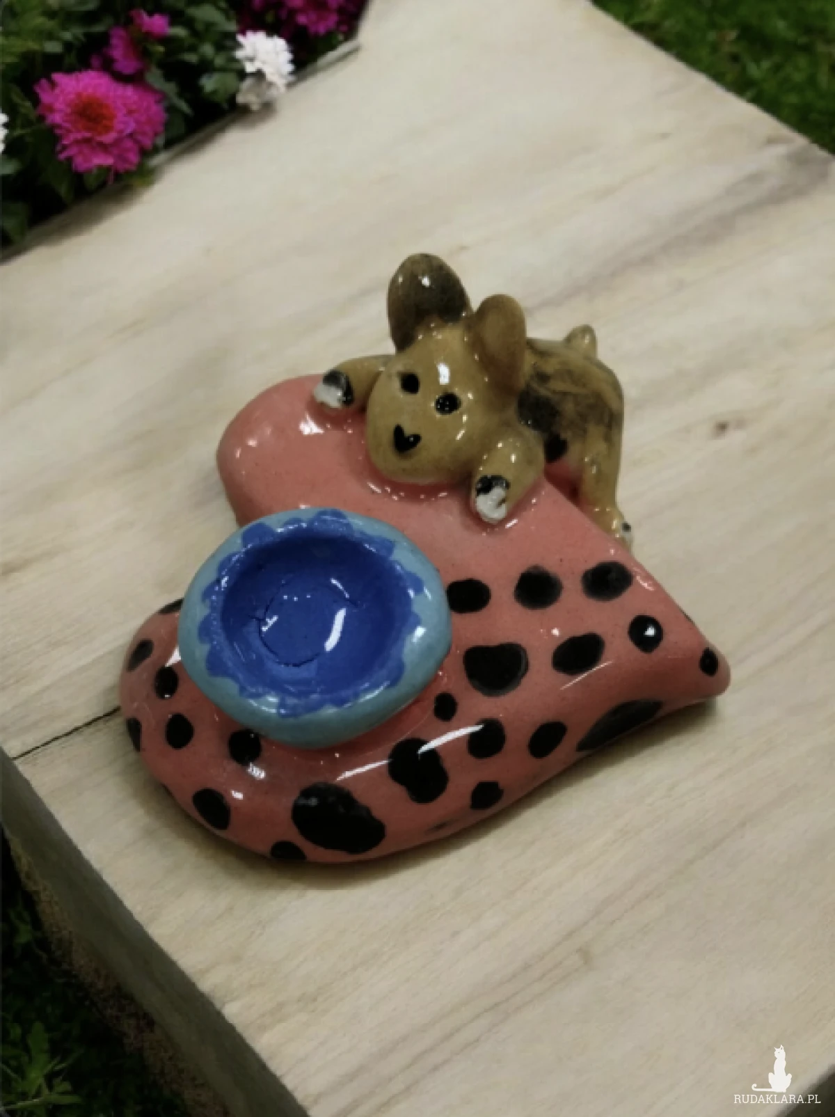 Ta ręcznie wykonana podstawka to pełna wdzięku i ciepła ozdoba, w której każdy detal – od łatek na różowym tle po błyszczące oczy – został ulepiony i pomalowany z sercem.