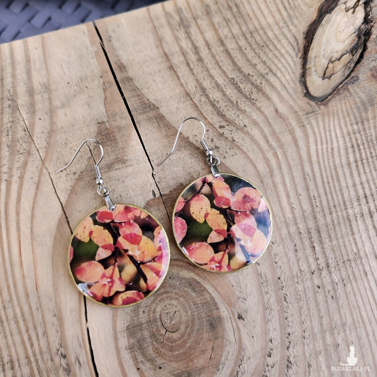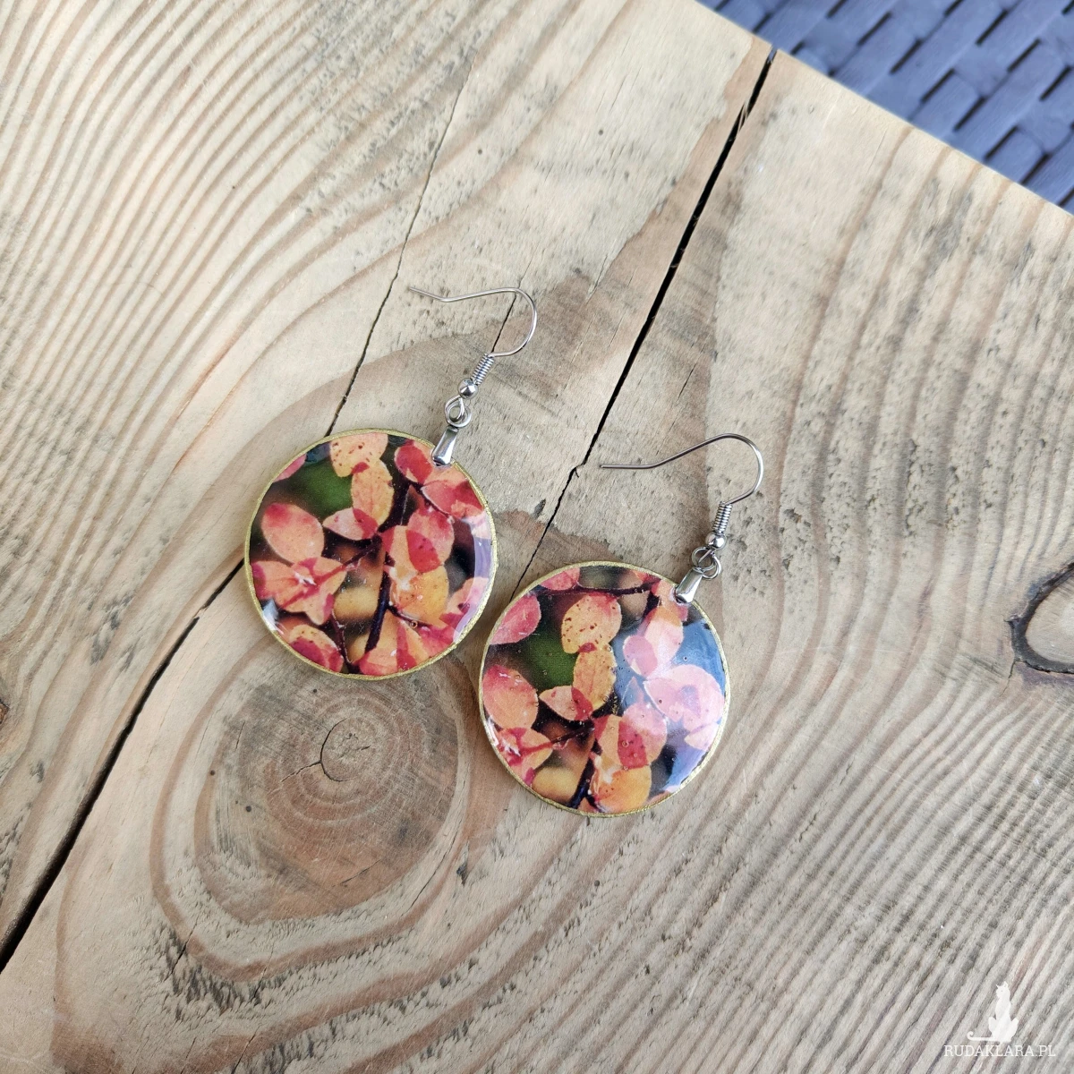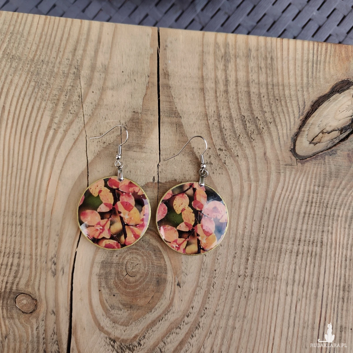 Kolczyki Jesienny Szept to wyjątkowe połączenie natury i sztuki. Okrągłe elementy ozdobione są grafiką przedstawiającą delikatne, różowo-złote liście na tle głębokiej zieleni — jak wspomnienie ciepłego, jesiennego popołudnia. Całość została pokryta warstwą błyszczącej żywicy, która nadaje im głębi i trwałości, a zarazem subtelnego połysku.