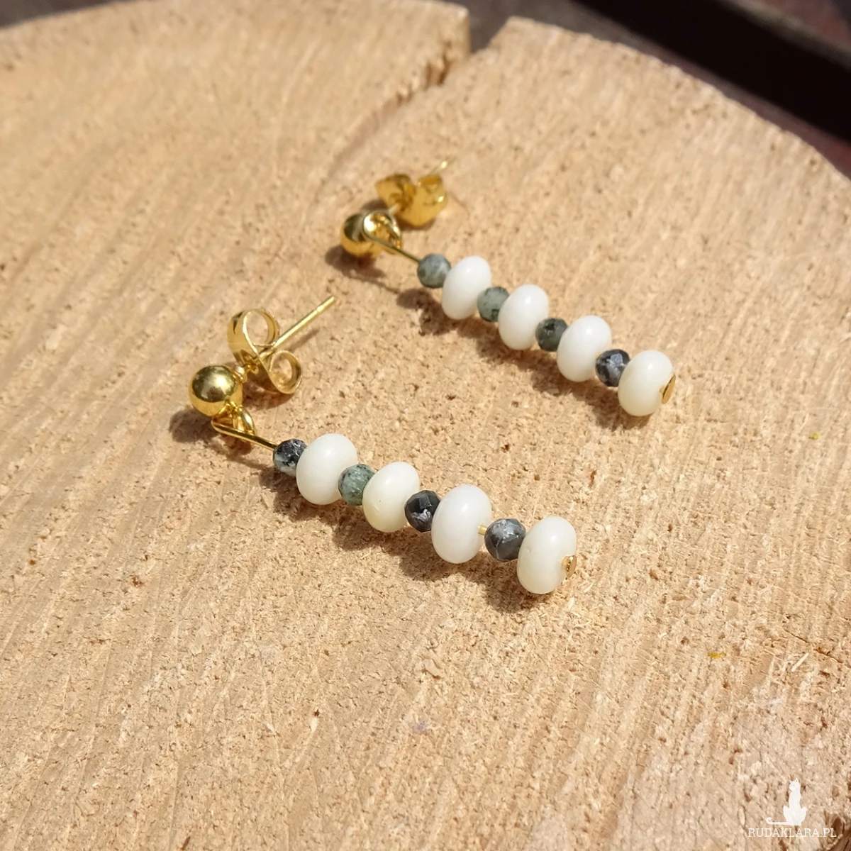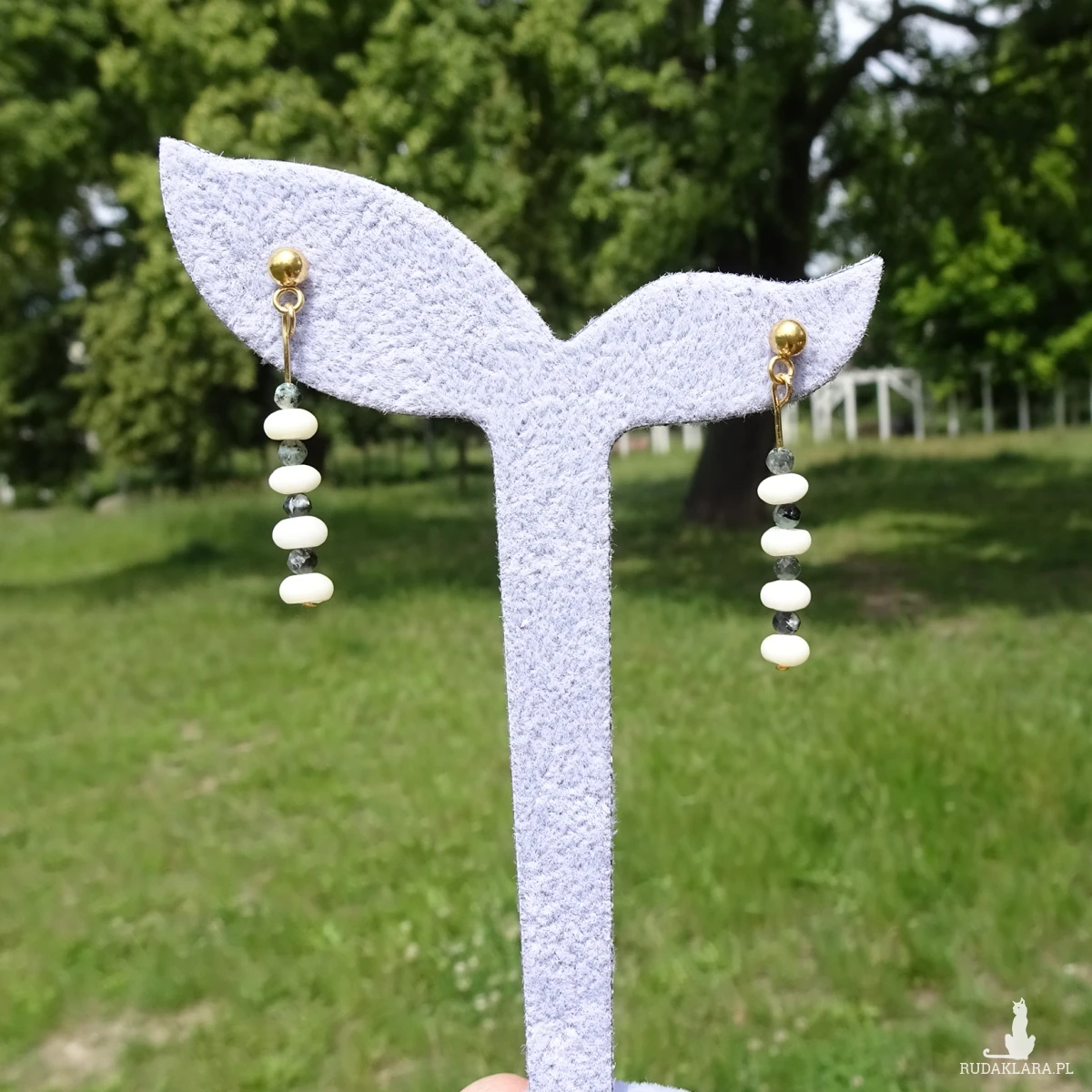 Kolczyki z białych korali i szmaragdów, na stalowych sztyftach w kolorze złotym. Długość całkowita ok. 3cm. Na zdjęciach sprzedawana para.