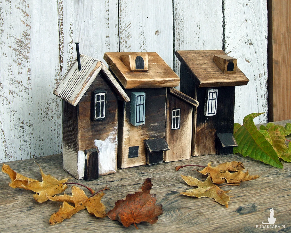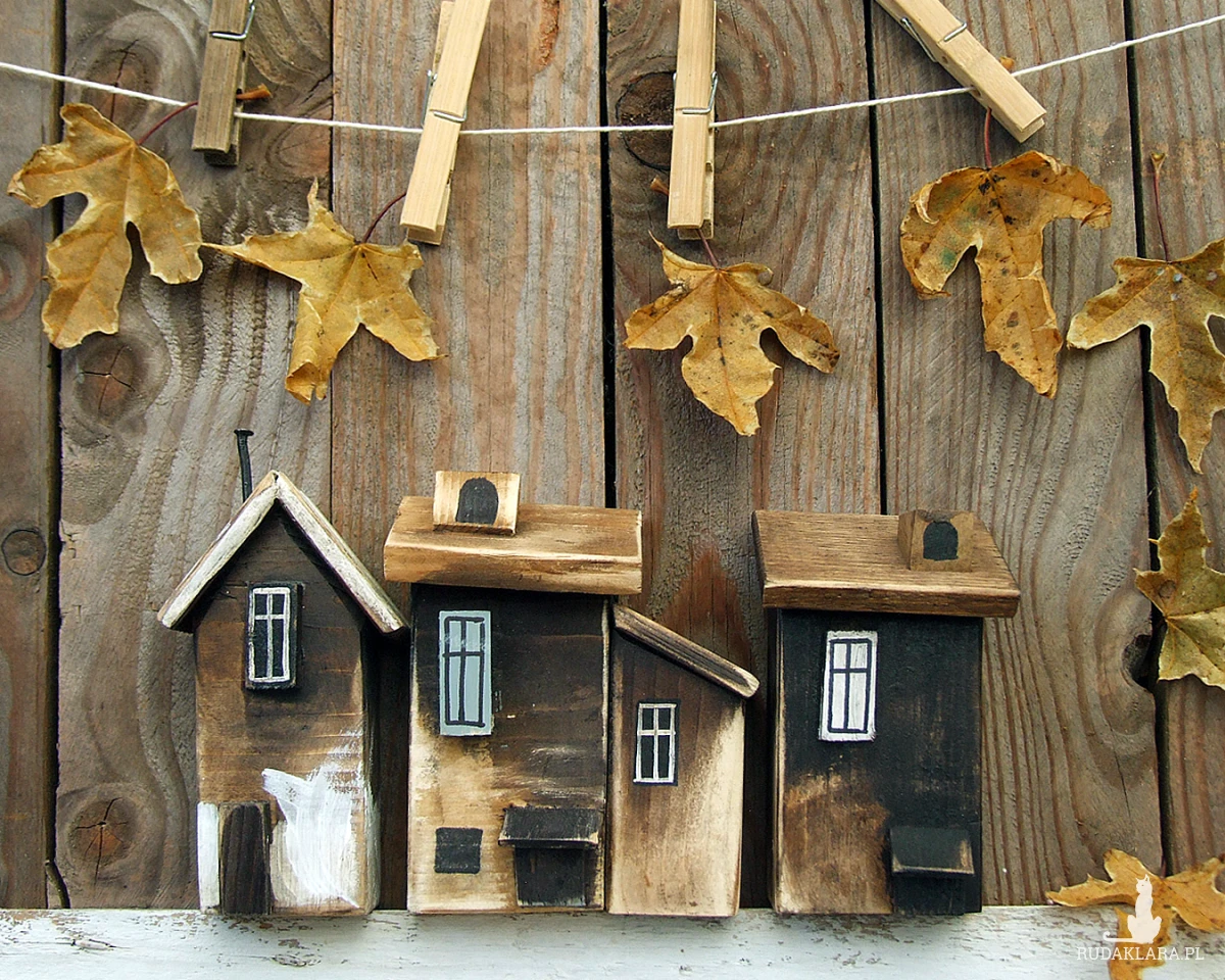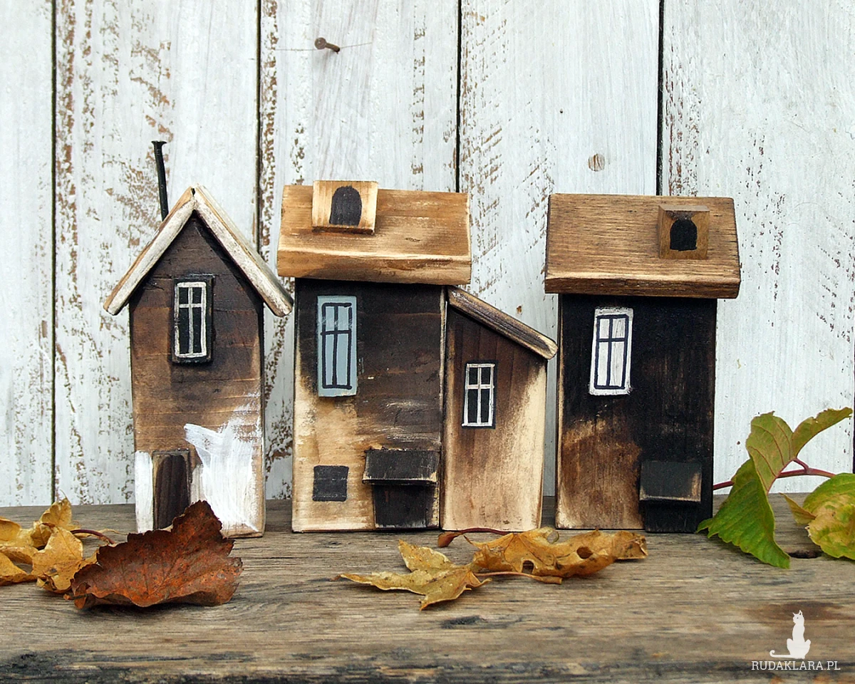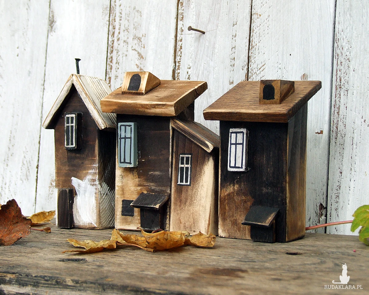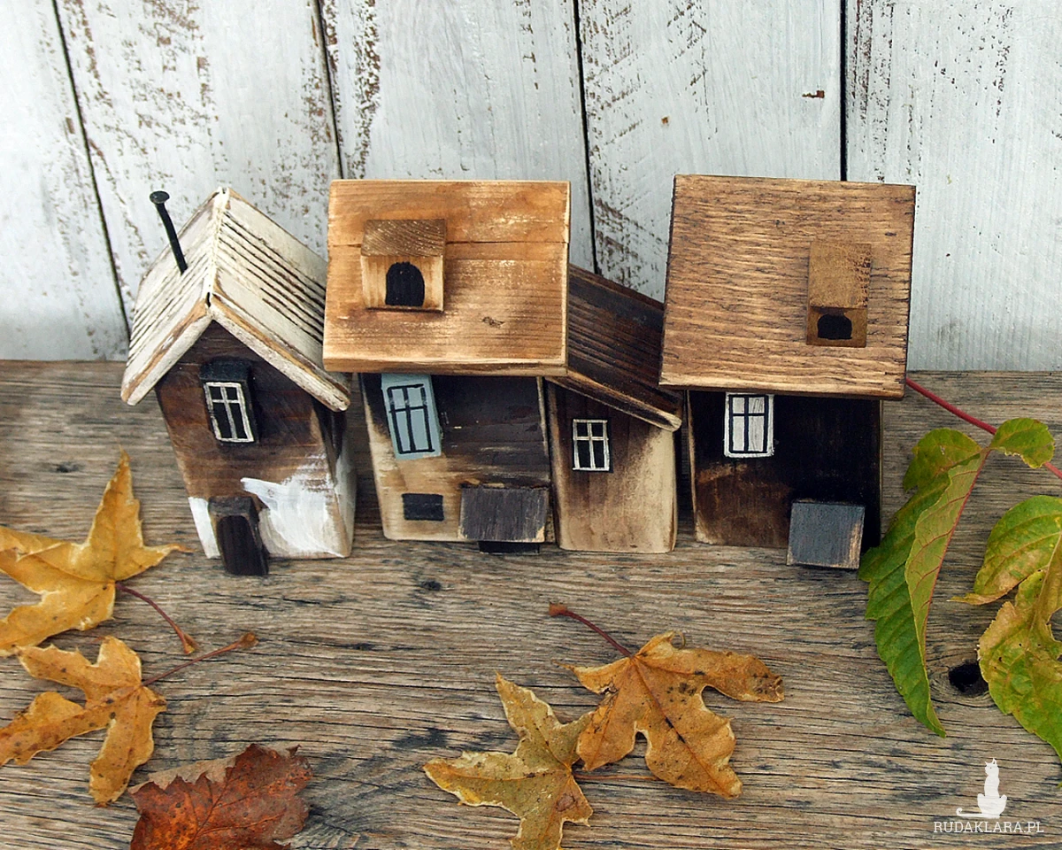 Domki z drewna sosnowego - do jesiennych dekoracji i aranżacji w domu. Pięknie wyglądają wśród kwiatów na parapecie, oryginalnie na półce z książkami, klimatycznie na kominku.