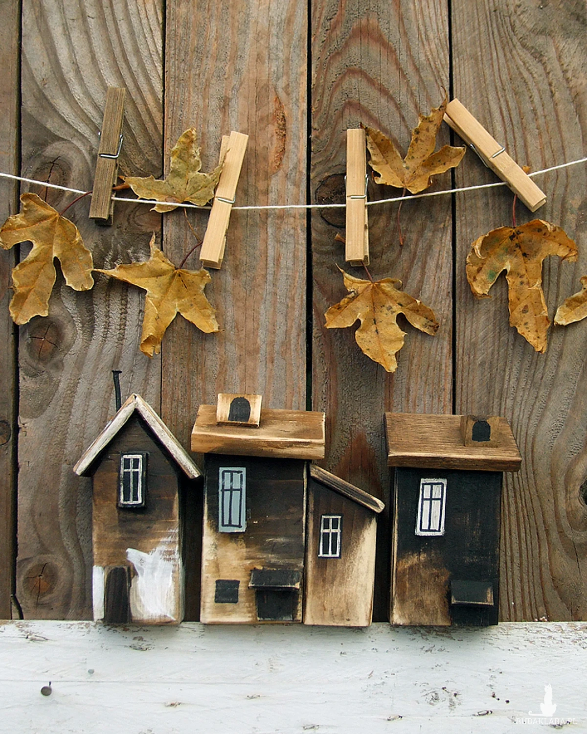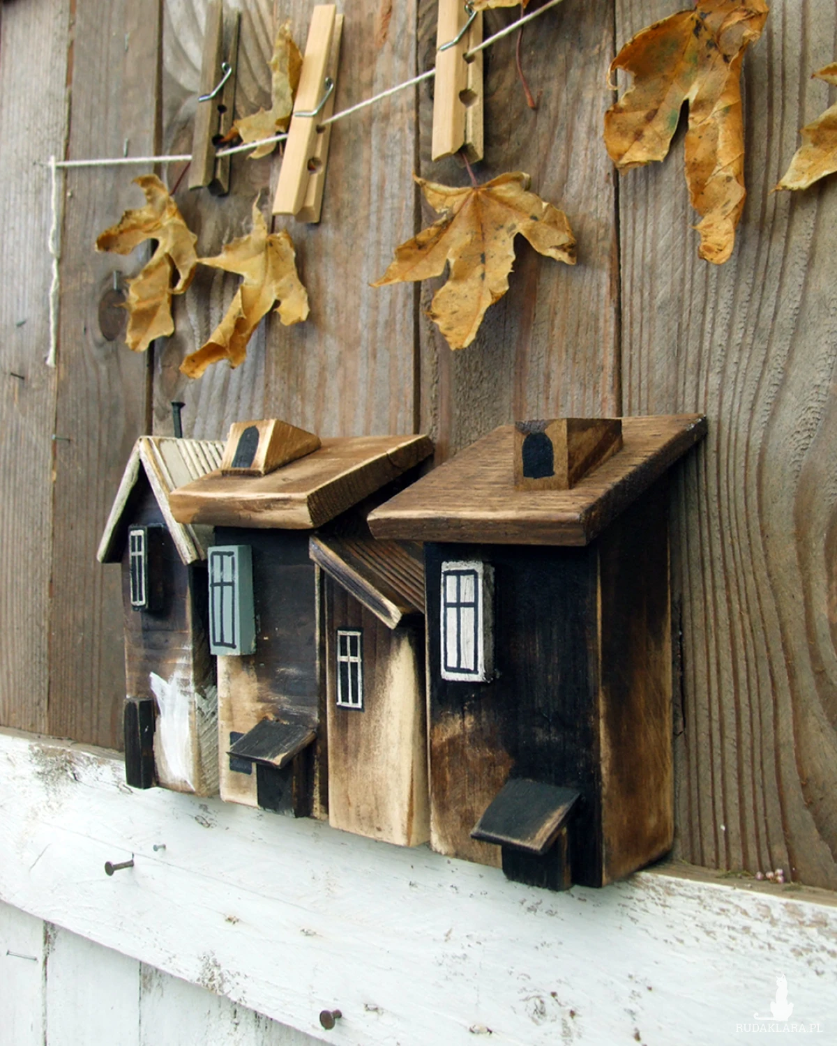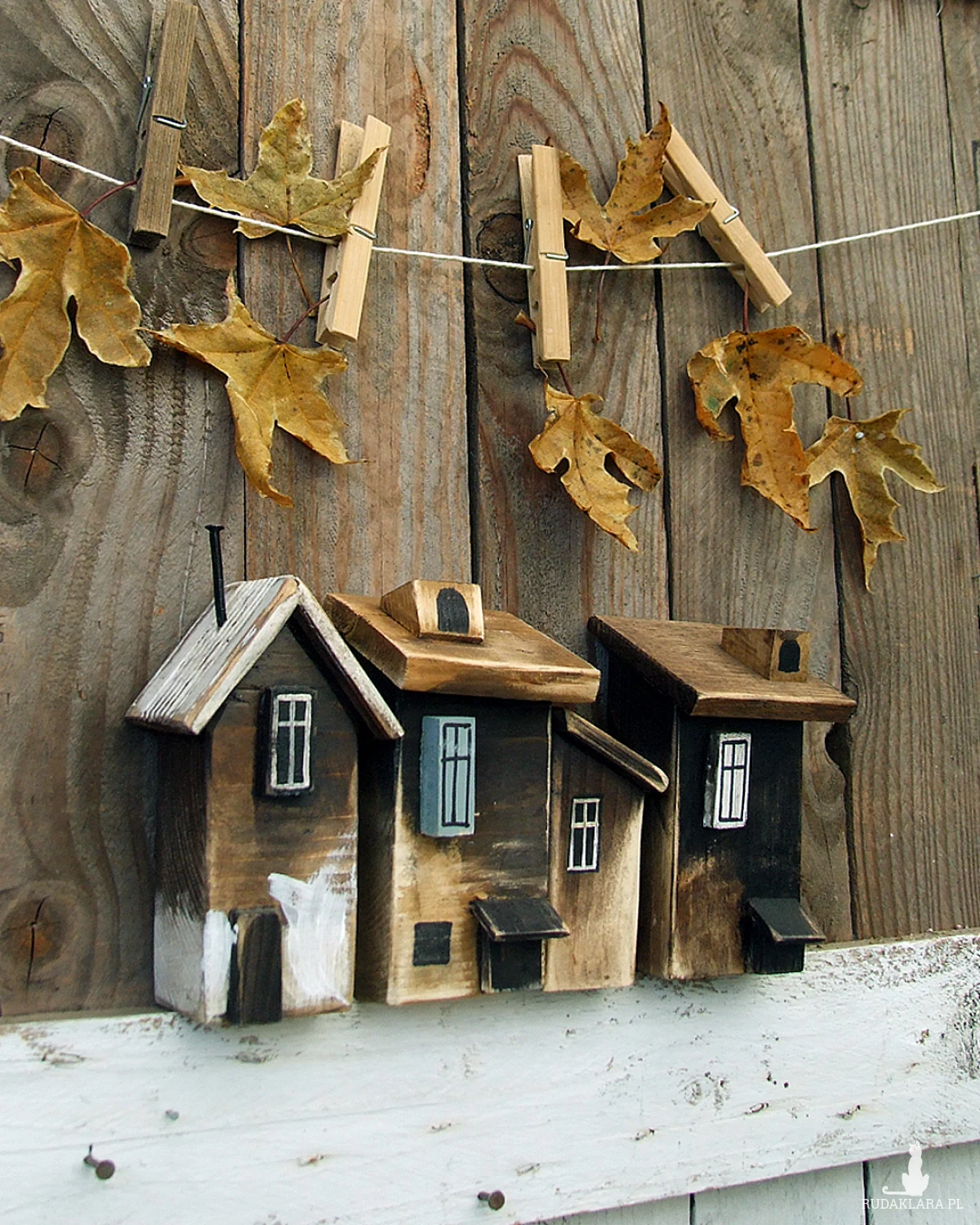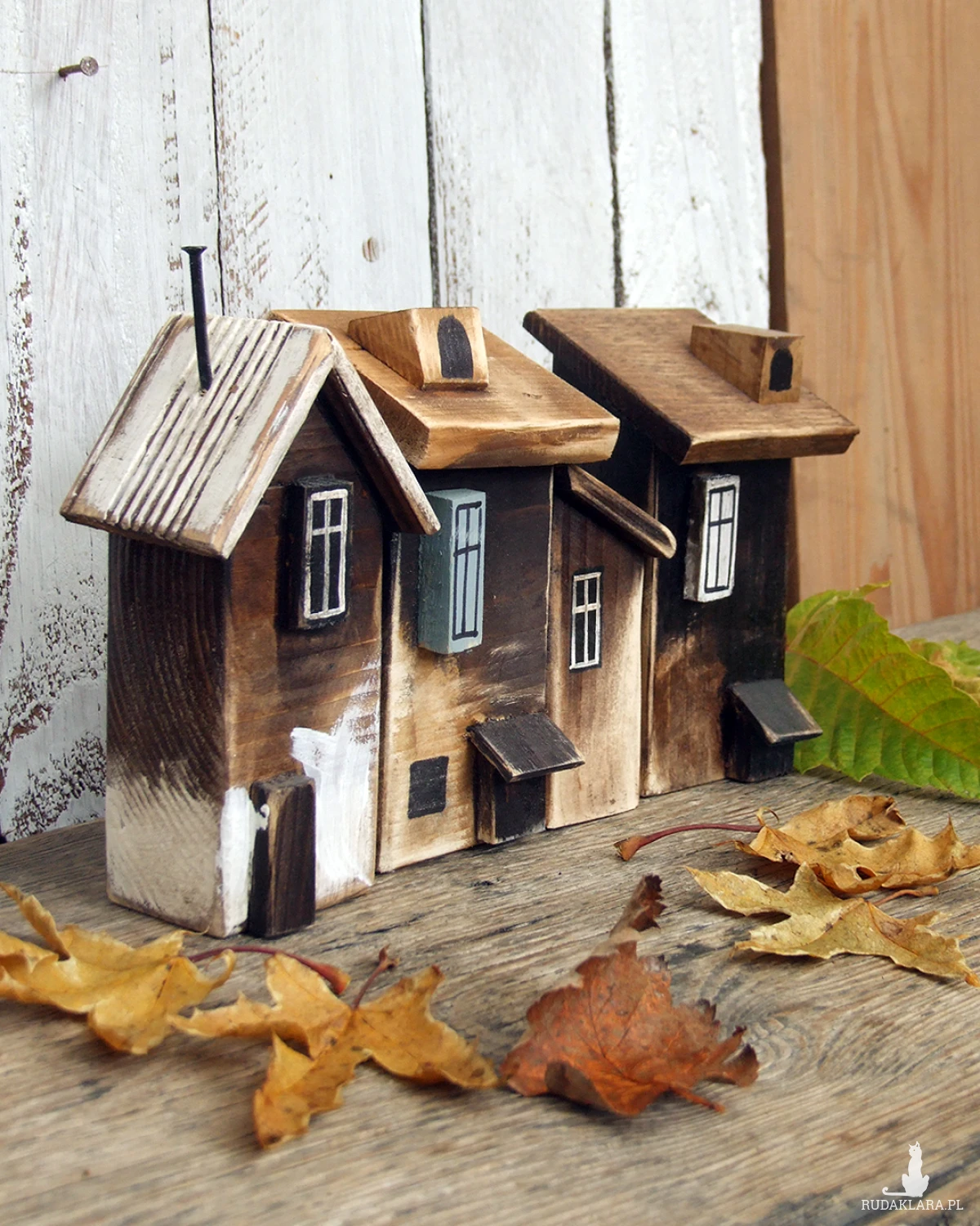Domki z drewna sosnowego - do jesiennych dekoracji i aranżacji w domu. Pięknie wyglądają wśród kwiatów na parapecie, oryginalnie na półce z książkami, klimatycznie na kominku.