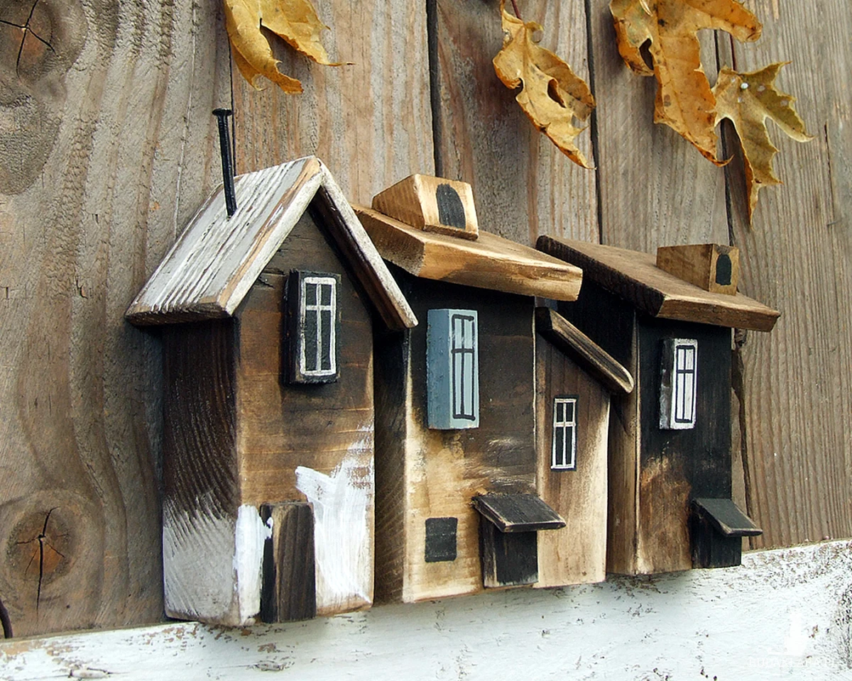 Domki są wykonane z drewna z odzysku - drewno często ma pęknięcia, ślady po gwoździach. Całość jest lekko szlifowana - drewno zachowuje swoją fakturę i jest lekko szorstkie w dotyku. Malowane są farbami akrylowymi i zabezpieczone matowym lakierem akrylowym, są to media wodoodporne i nietoksyczne).