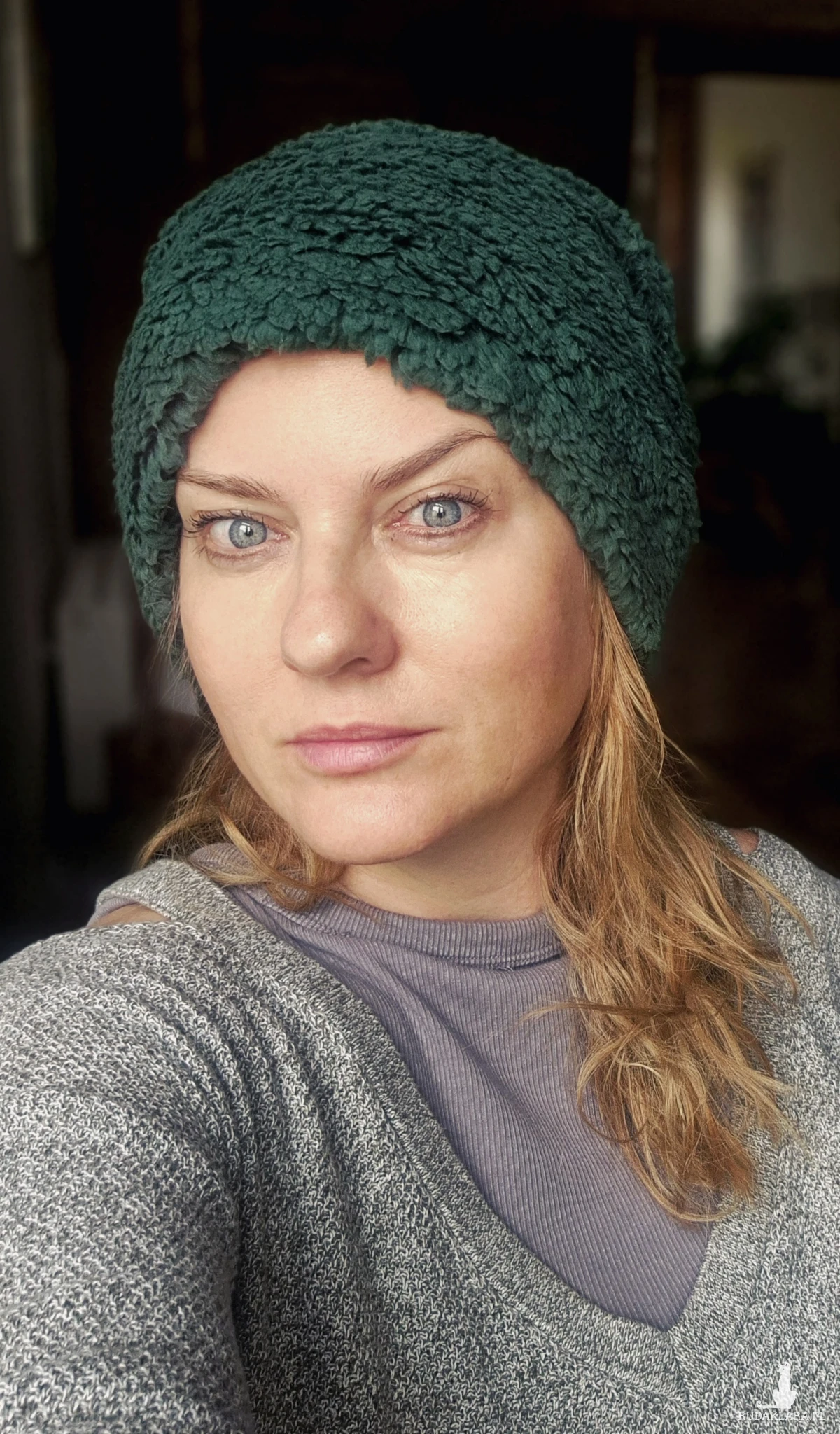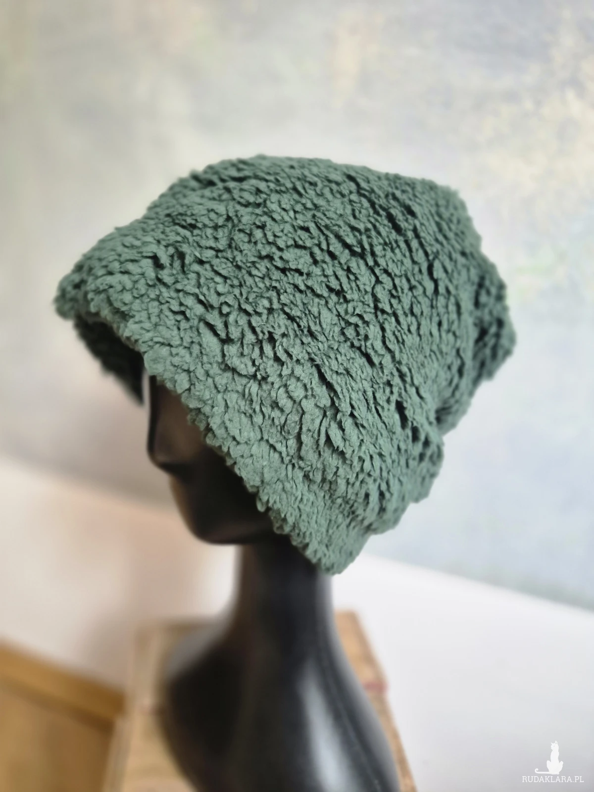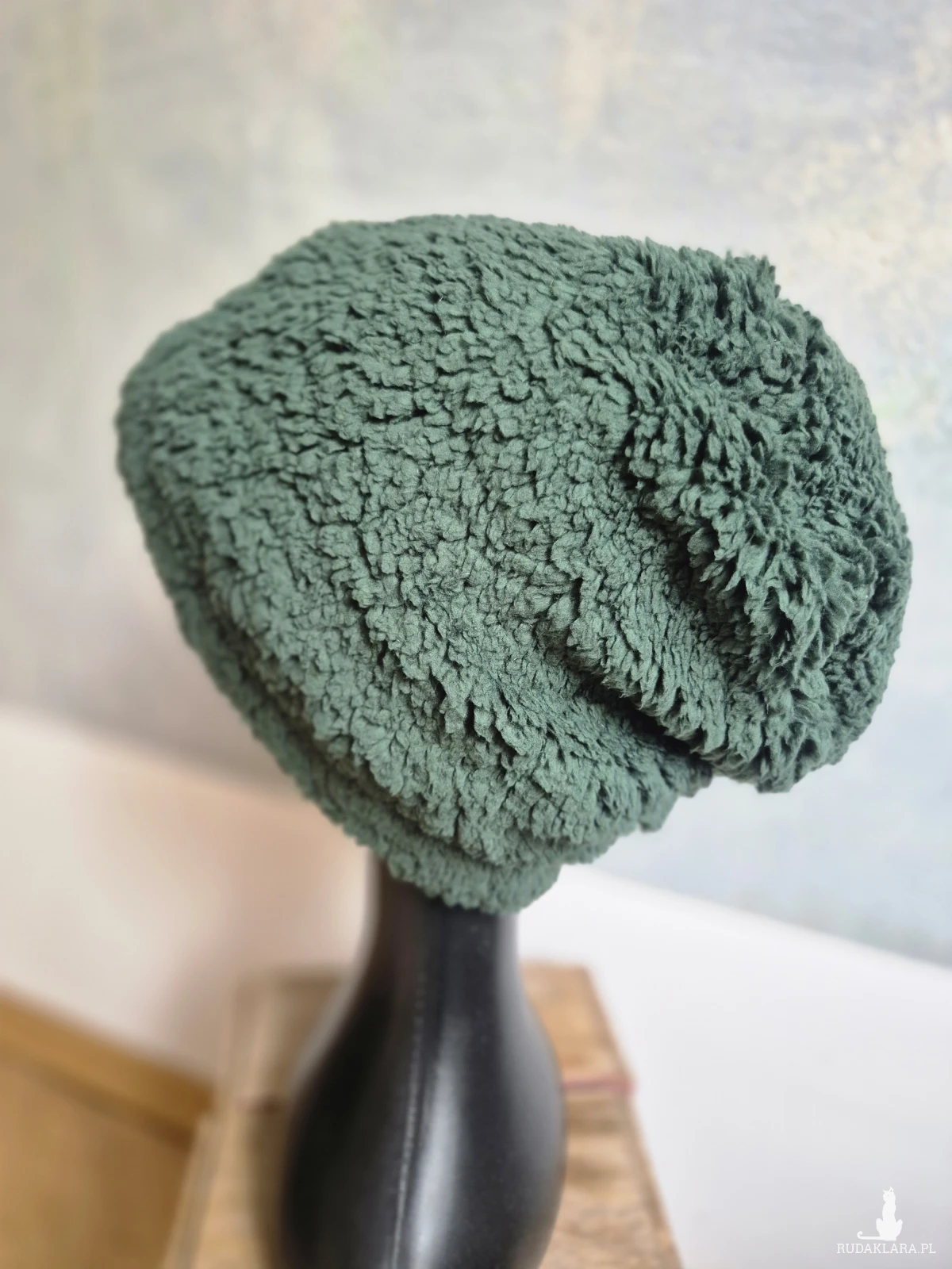 Ciepla  futrzana baranek bardzo miła na podszewce,ciemna zieleń, czapka dla artystki, rozmiar uniwersalny, nie zginiesz w tłumie  , box f1