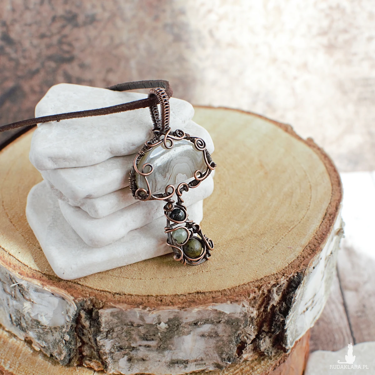 Wyjątkowy wisiorek ręcznie wykonany z użyciem agatu, turkusu afrykańskiego i naturalnej miedzi.