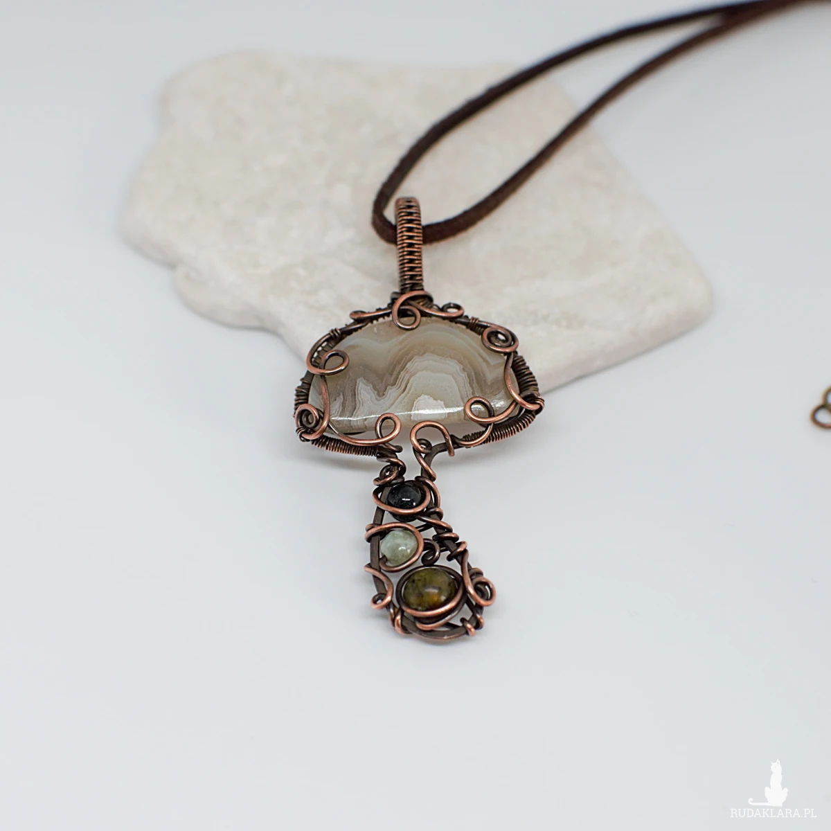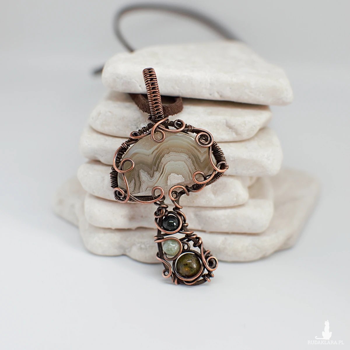 Materiały użyte: drut jubilerski miedziany, agat koronkowy, agat mszysty, turkus afrykański.