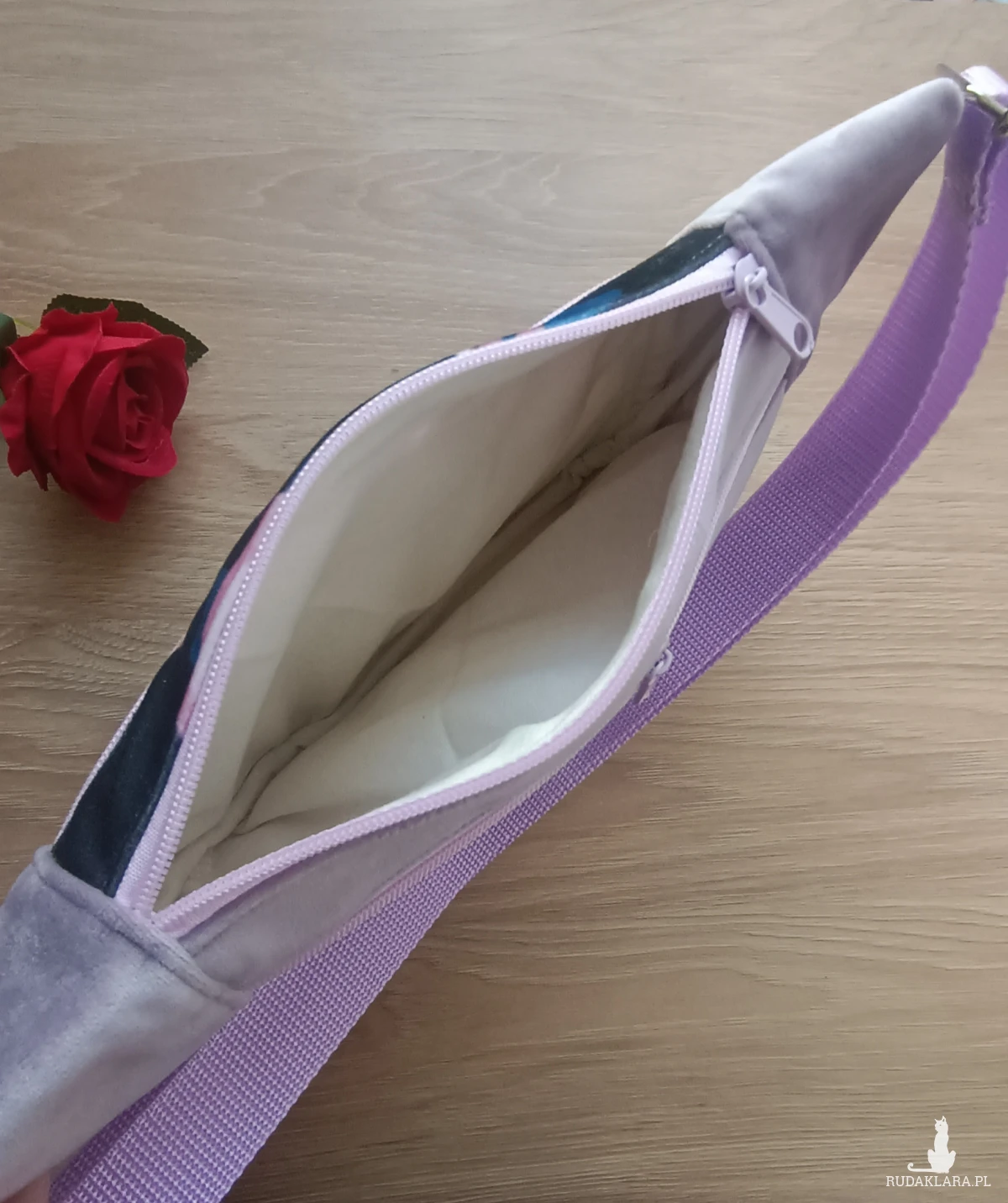 W środku znajduje się bawełniana podszewka. Całość uzupełnia jasnofioletowy suwak i pasek w tym samym kolorze, świetnie komponujące się z printem. Pasek jest regulowany, odpinany na karabińczyki, o maksymalnej długości ok. 88 cm.