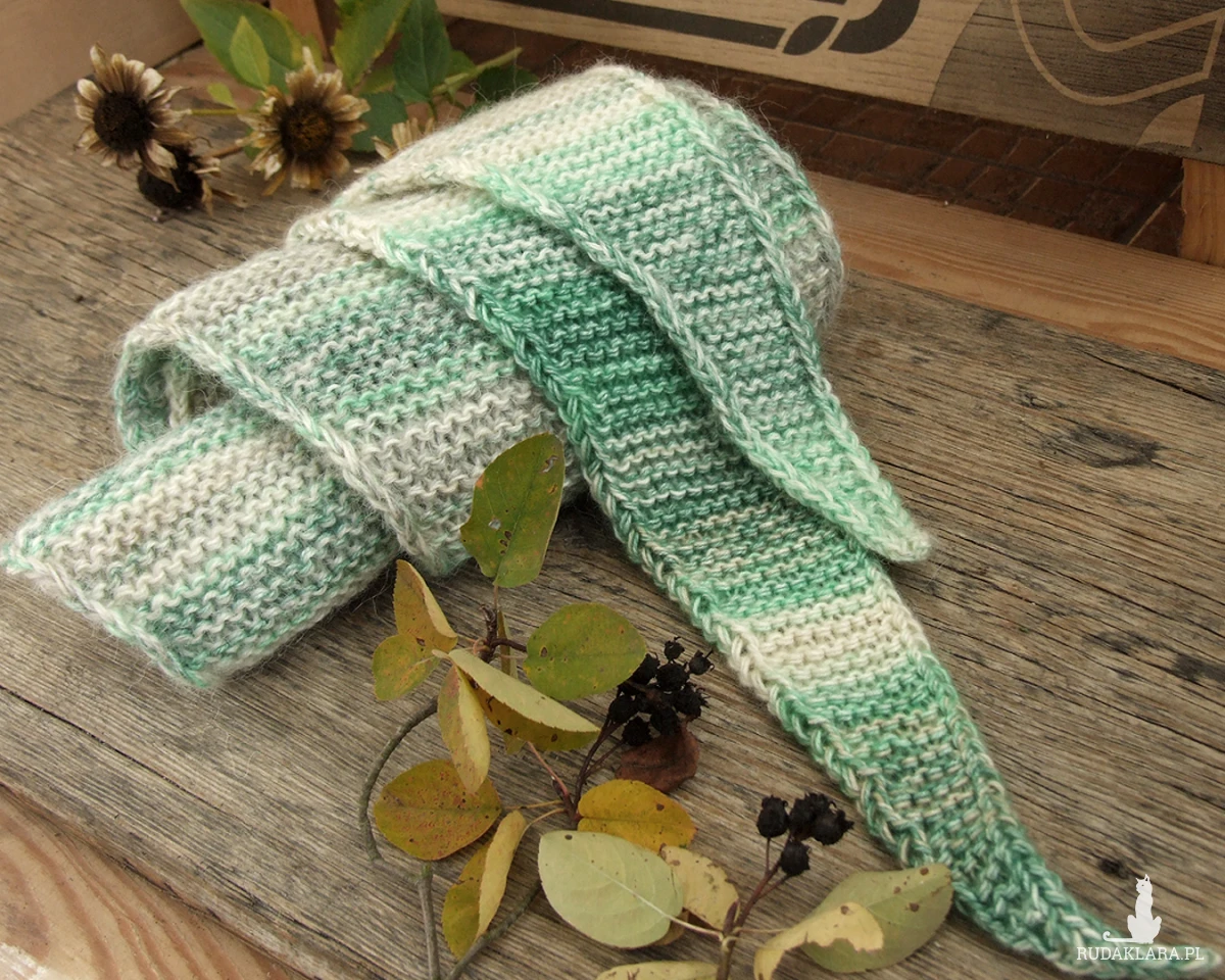 Szalik ma kształt trójkąta z bardzo długimi bokami, przypomina trochę wąską chustę. Dzięki temu bardzo ładnie i dokładnie otula szyję, a długie boki możemy fantazyjnie zawiązać.