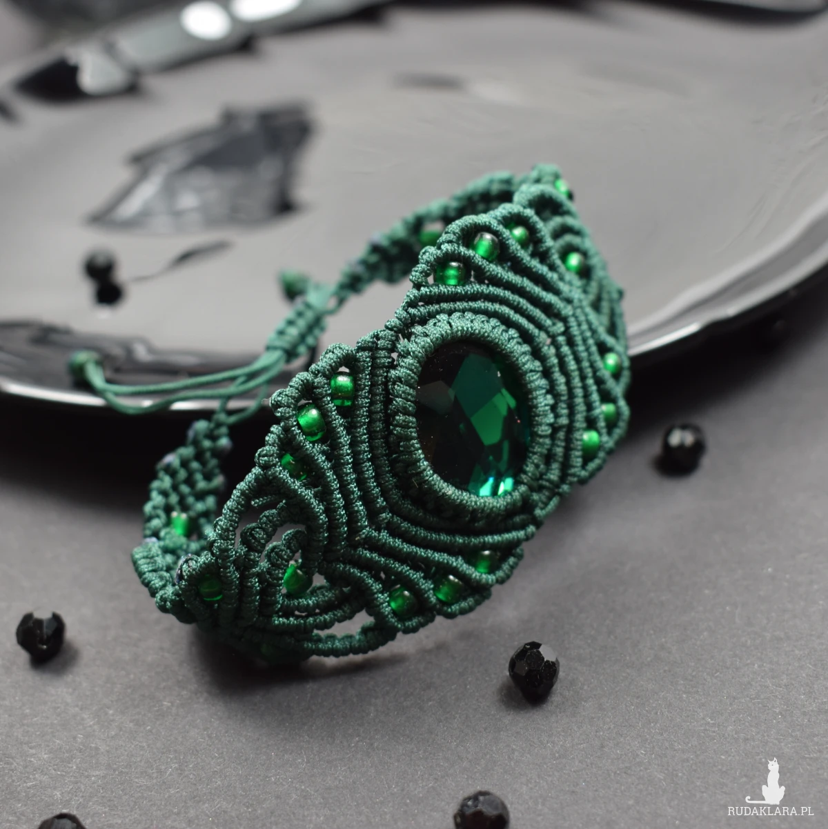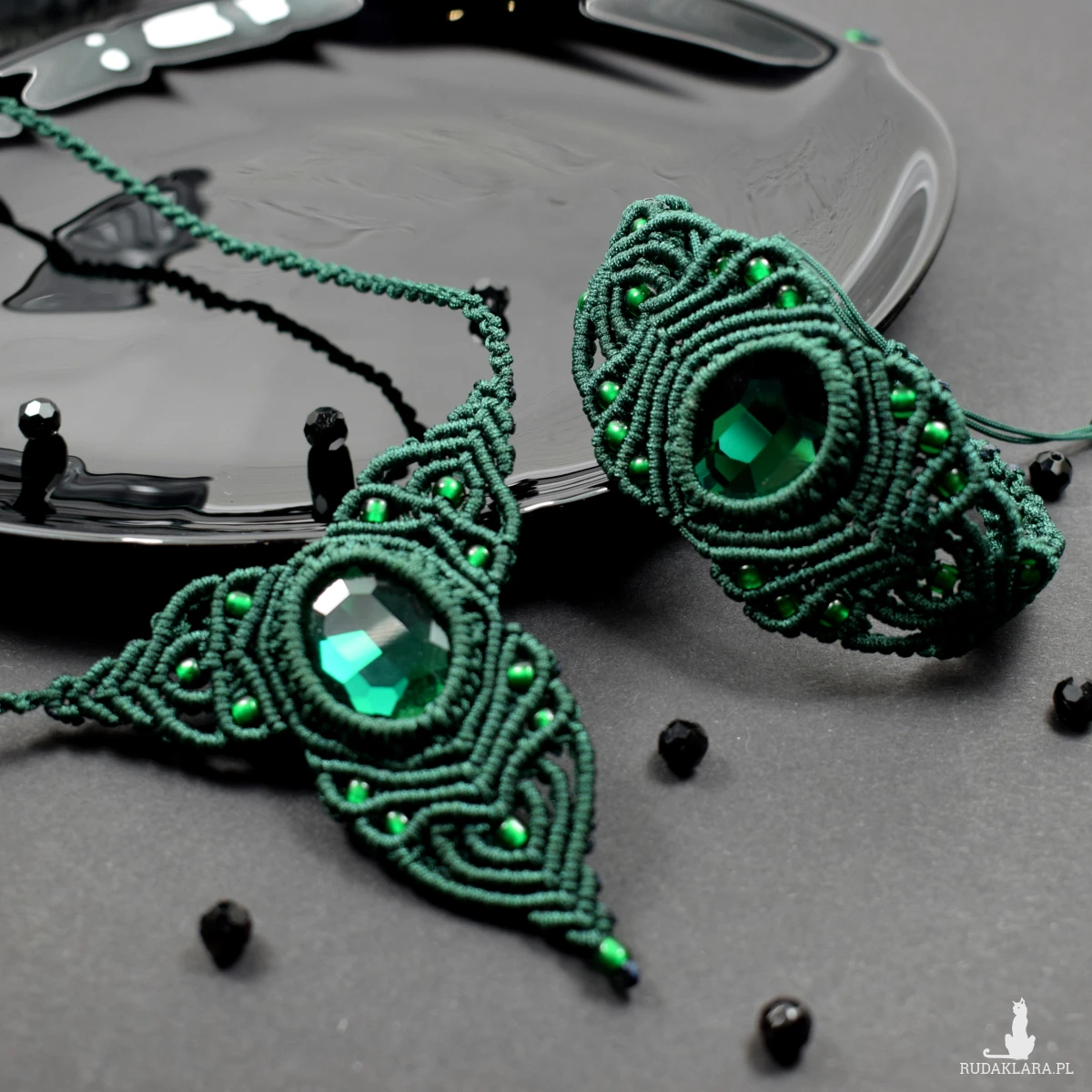 zieleni. W centrum kompozycji znajduje się szmaragdowy kryształ, który