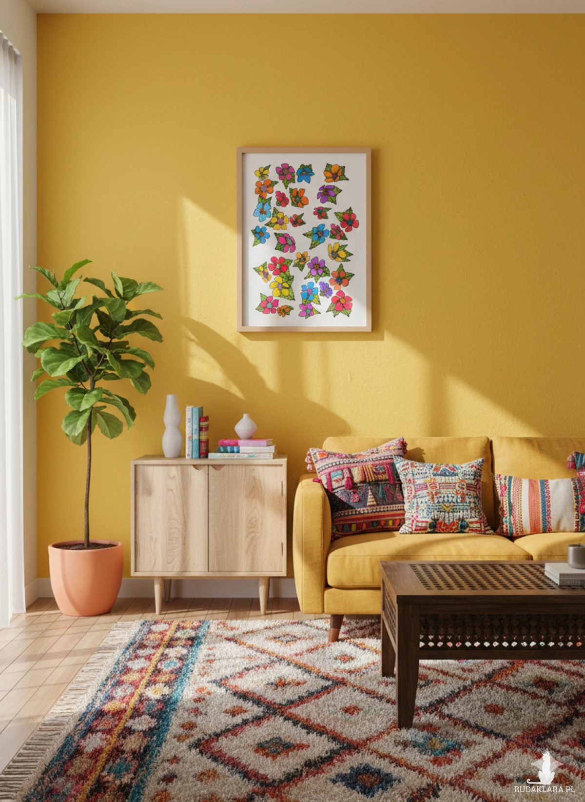 Kwiaty charakteryzują się nasyconymi, jaskrawymi kolorami (żółcie, róże, błękity, fiolety) i są otoczone grubym, czarnym konturem. Każdy element jest wypełniony delikatnymi, liniowymi wzorami (doodle art), co nadaje im teksturę i wibrację. Całość jest pełna lekkości i beztroskiego ruchu.