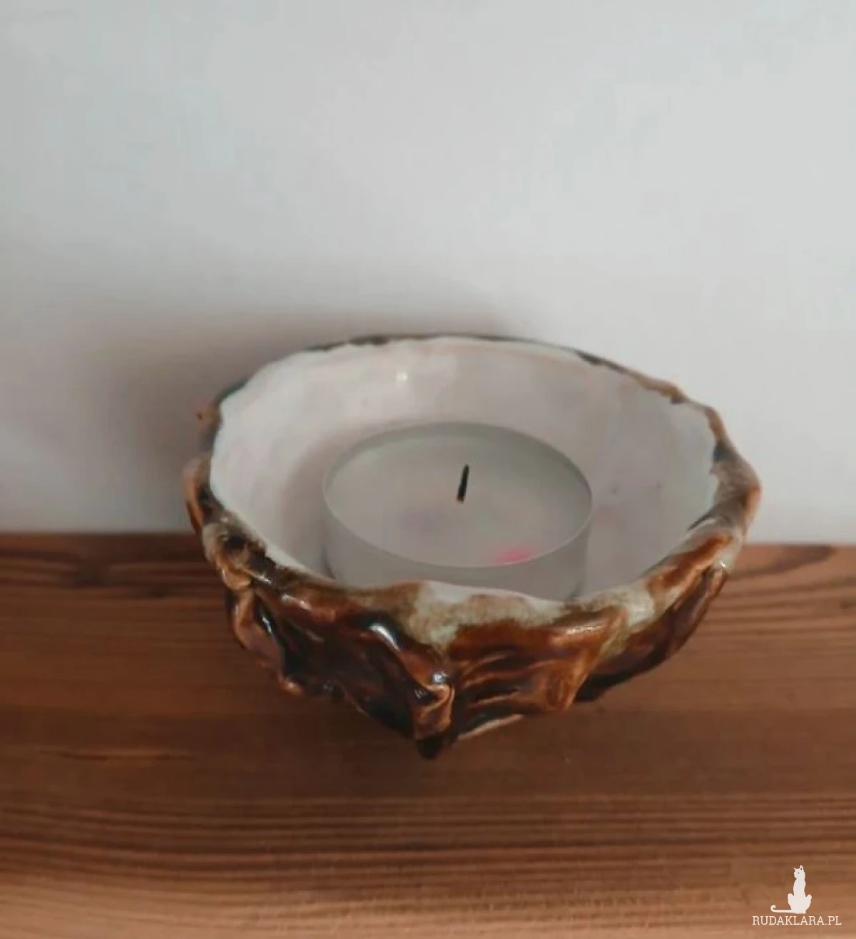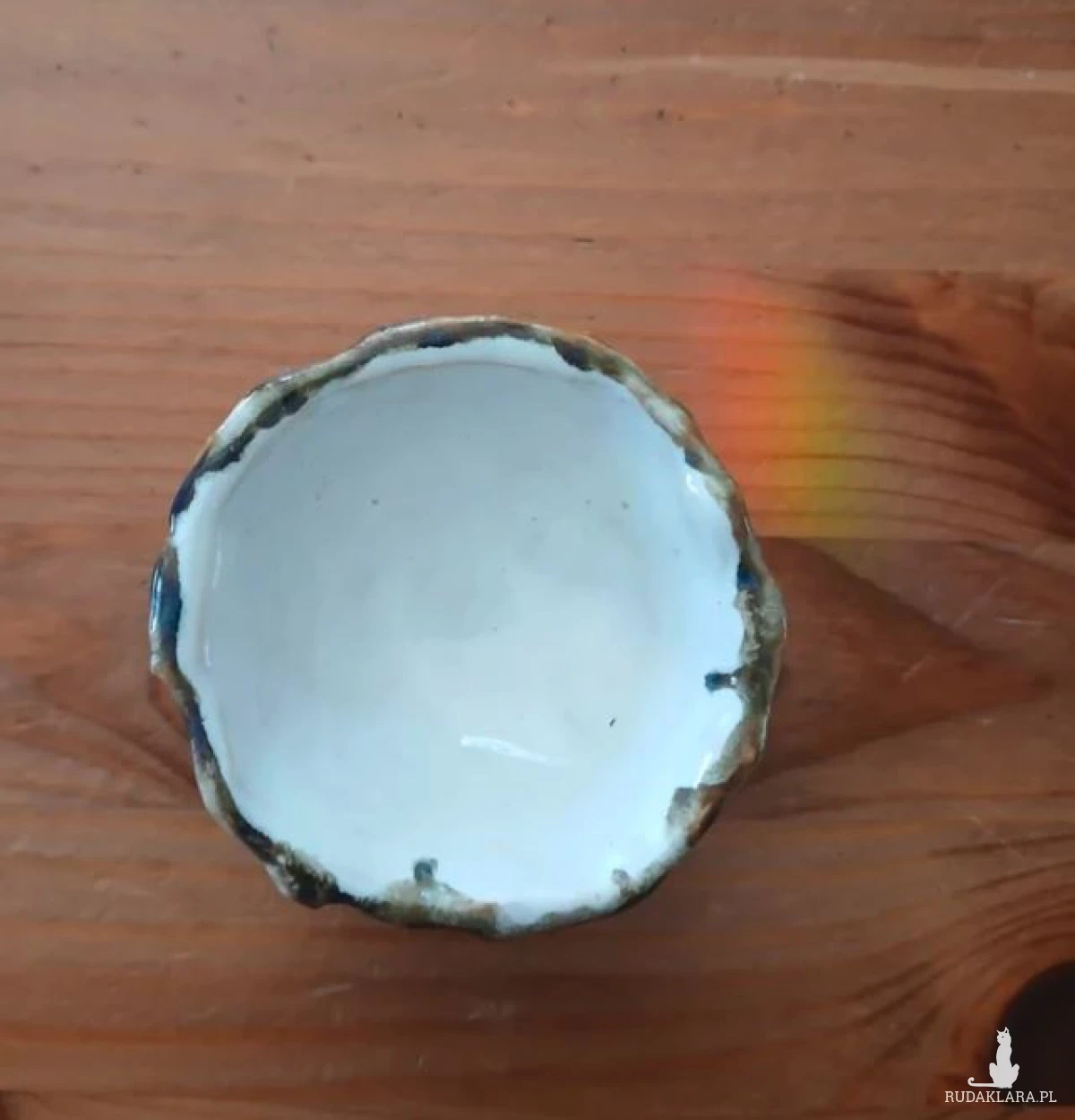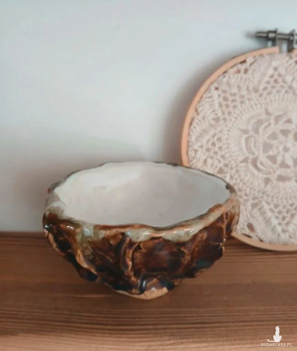 Ceramiczna miseczka ręcznie lepiona z gliny. Unikatowa ceramika użytkowa. Może posłużyć jako miseczka na drobiazgi, rustykalny świecznik na tealight, miseczka na sos sojowy do sushi, pojemnik na przyprawy, podstawka na biżuterię, talerzyk na kadzidełko. Orgnaniczna forma inspirowana naturą przypomina muszelkę lub koralowiec. Galeria sztuki.