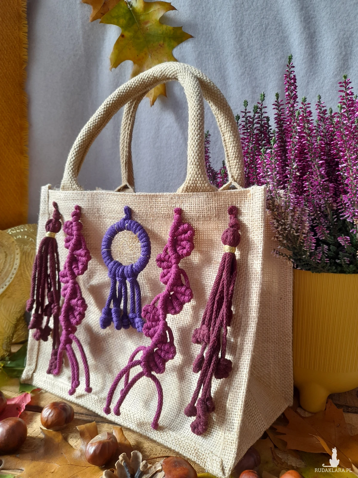 Każda torba wykonana jest z naturalnej, krochmalonej juty i ozdobiona ręcznie plecionym motywem makramy ze sznurka z recyklingowanej bawełny. To sprawia, że każda sztuka jest jedyna w swoim rodzaju.