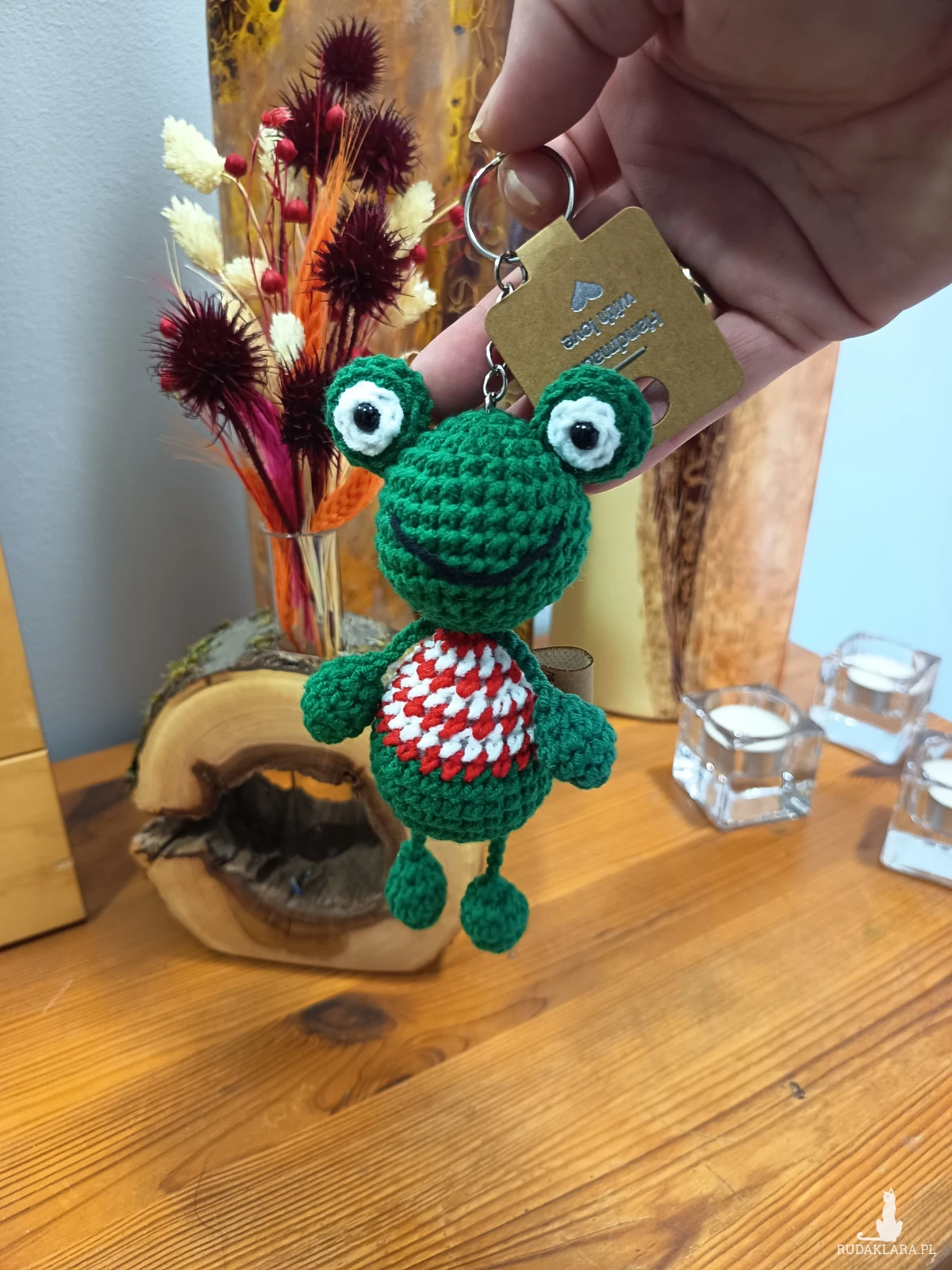Brelok szydełkowy żabka ciemnozielona w czerwonym sweterku