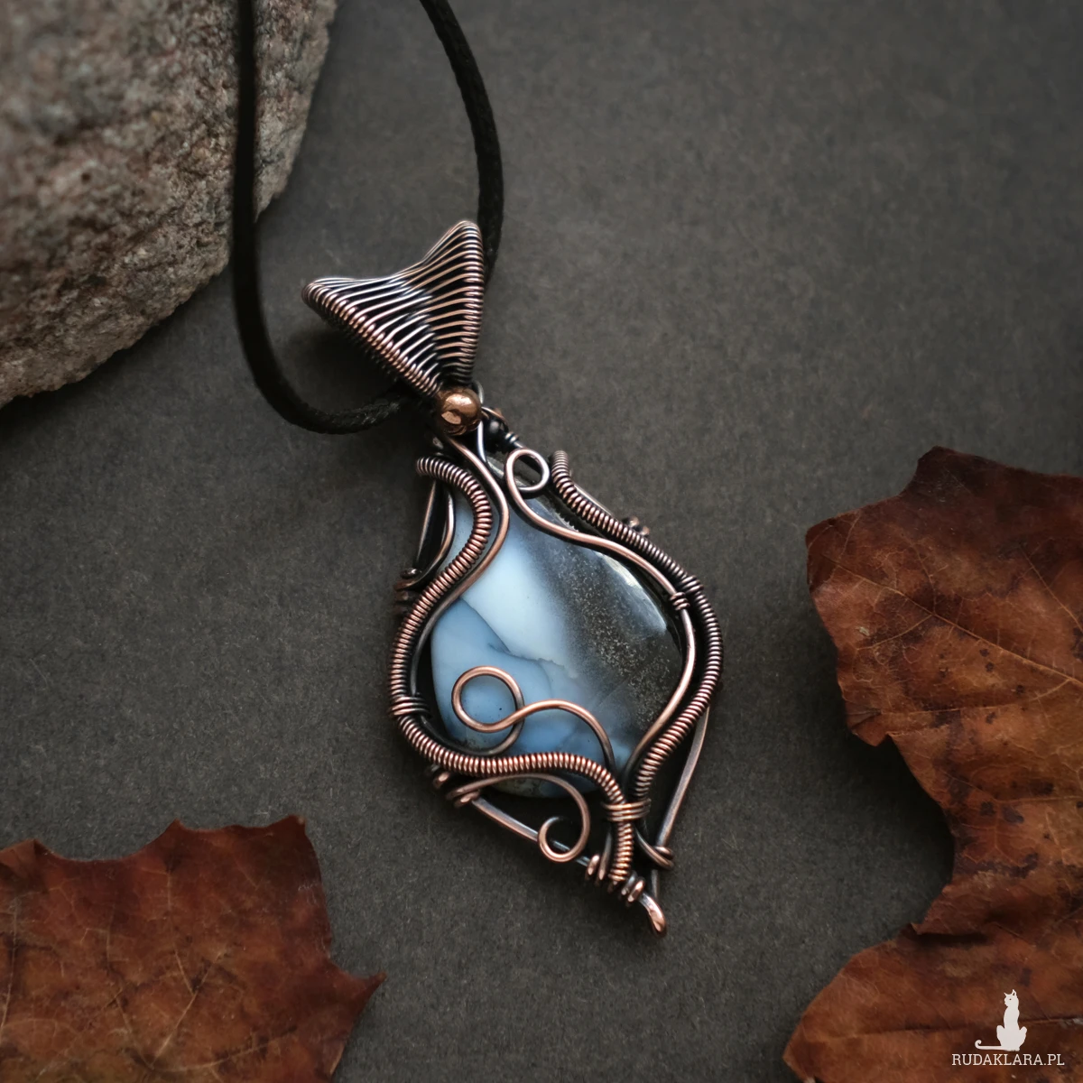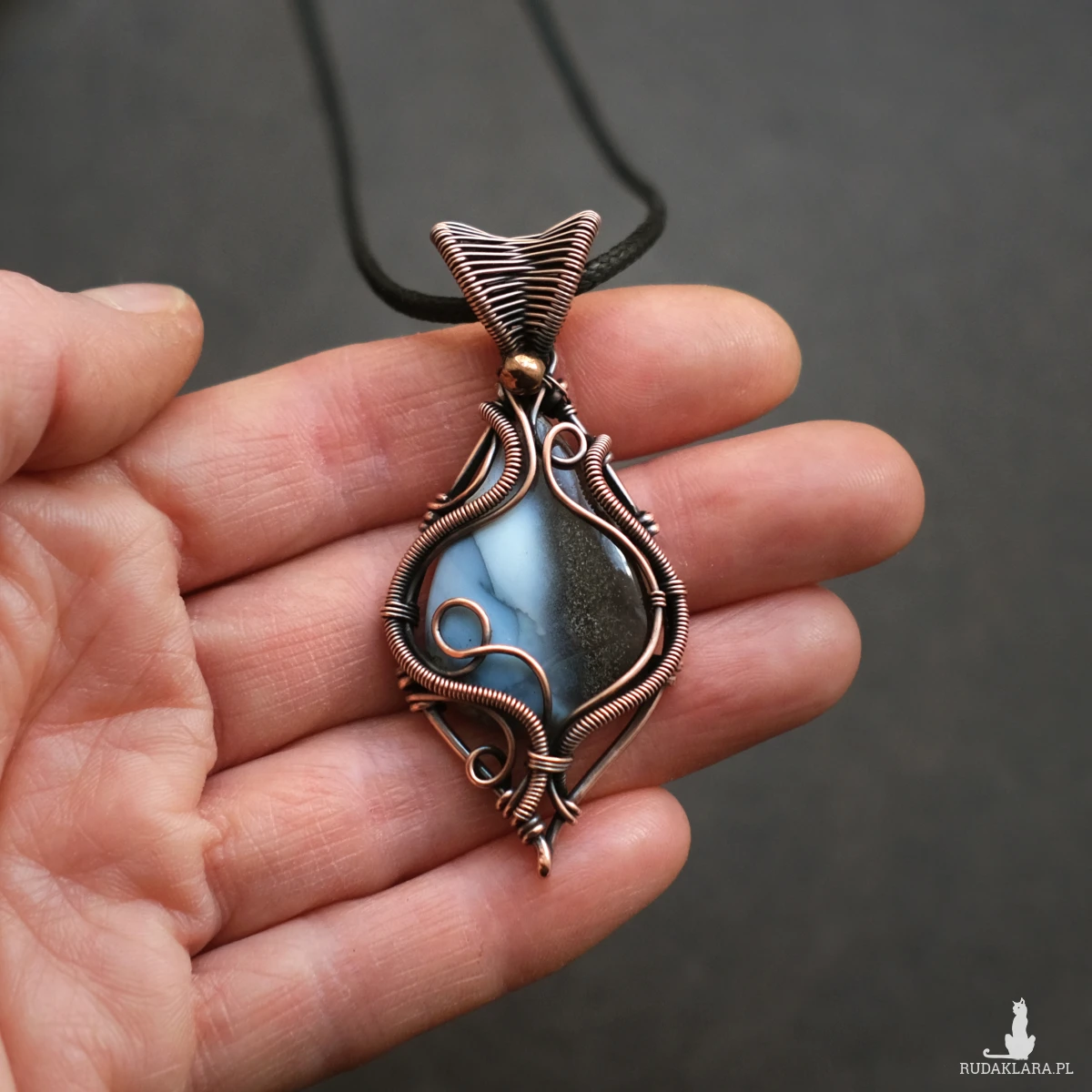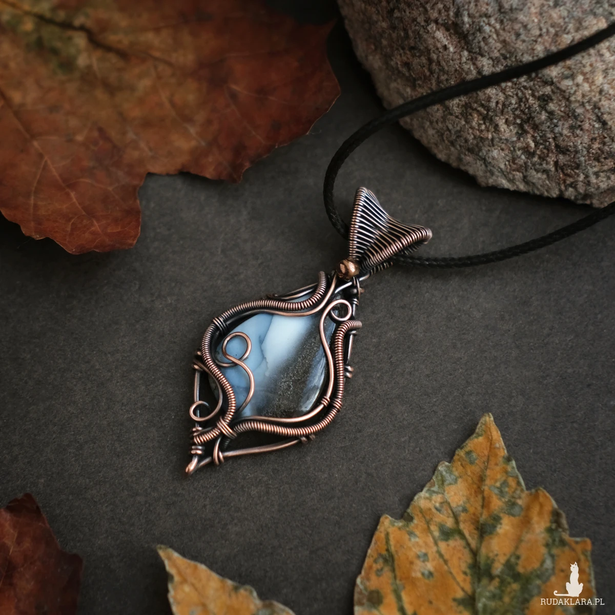 Piękny miedziany wisior w elfickim stylu mieści w sobie kamień niebieskiego opalu o ciekawym deseniu dzielącym go na dwie części - błękitną oraz ciemnoszarą.