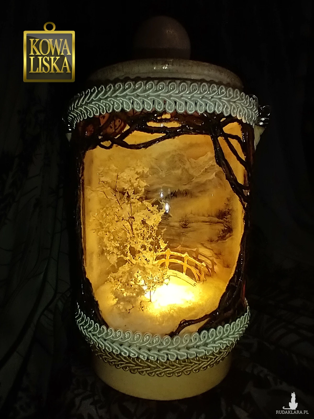 Umieszczone w środku trójwymiarowe elementy (np. mostek, studnia, płot, krzewy) tonące w śniegu, stanowią pierwszy plan dla krajobrazu naklejonego metodą decoupage'u.