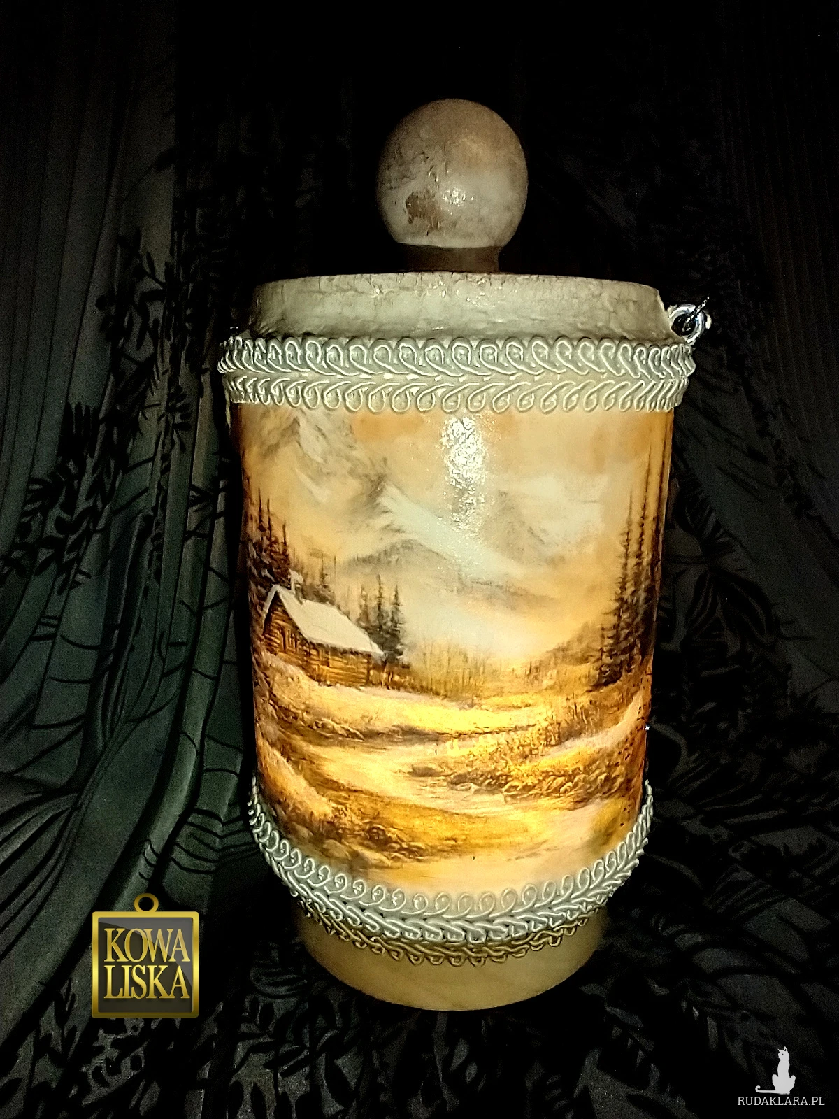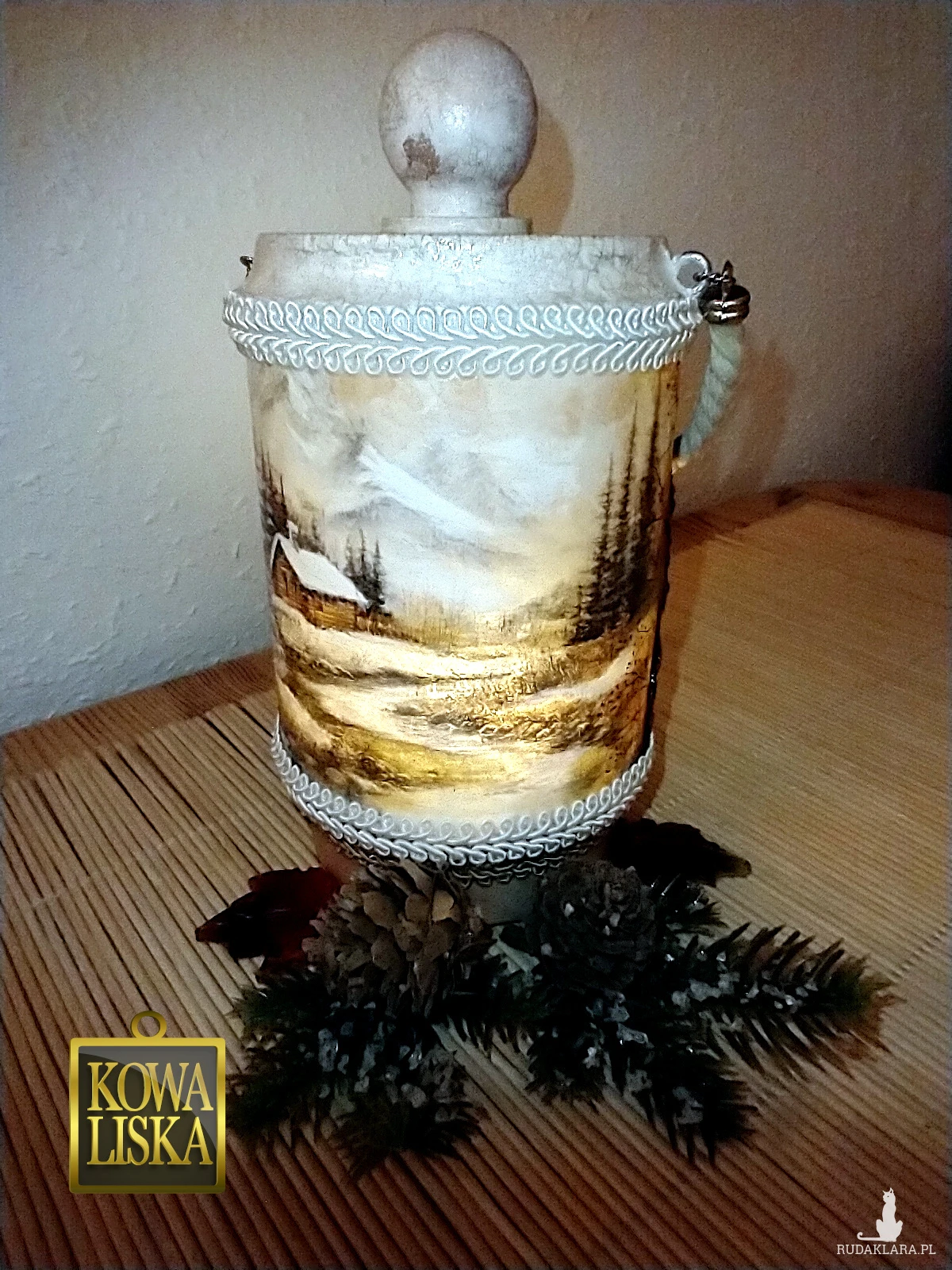 Umieszczone w środku trójwymiarowe elementy (np. mostek, studnia, płot, krzewy) tonące w śniegu, stanowią pierwszy plan dla krajobrazu naklejonego metodą decoupage'u.