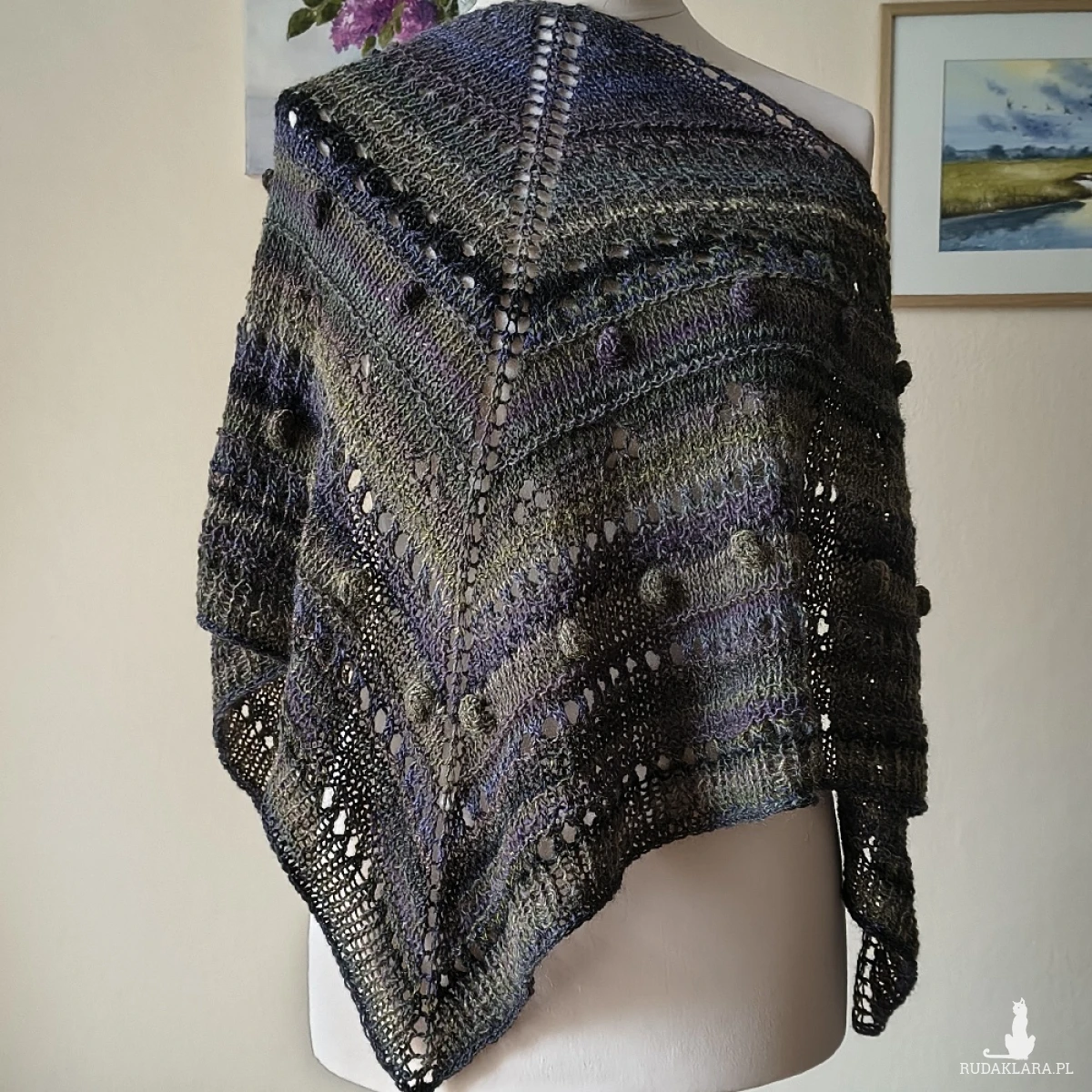 Chusta wykonana ręcznie na drutach z doskonałej hiszpańskiej włóczki, będącej mieszanką wełny i akrylu (przewaga wełny). Chusta jest przyjemna dla skóry, lekka i ciepła. Ciekawe wzory i faktura, w połączeniu z kolorystyka dają urokliwy efekt rustico. Chusta świetnie sprawdzi się o każdej porze roku. Wymiary chusty: ok. 173 cm. bok najdłuższy, ok. 78 cm wysokość trójkąta. Pranie ręczne.