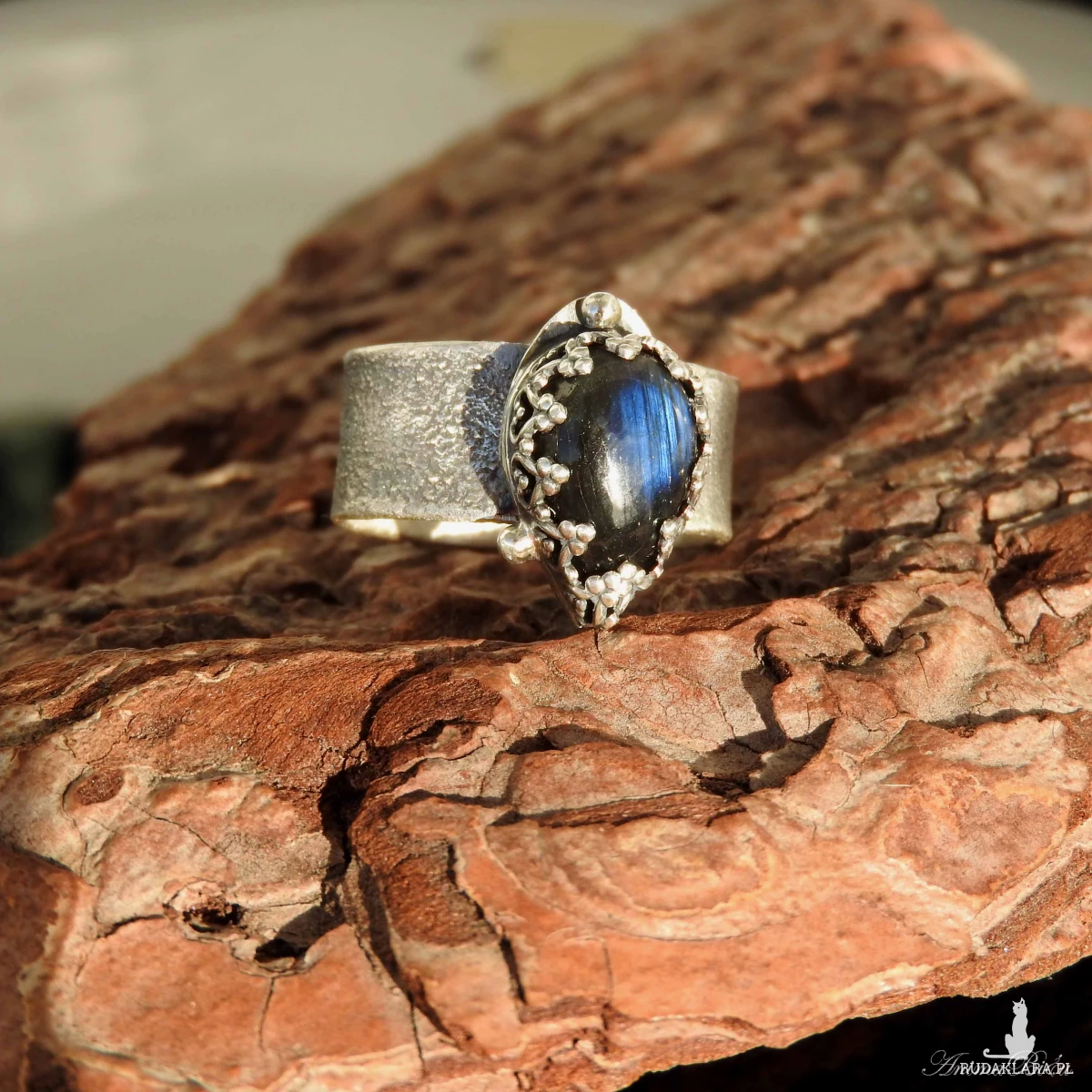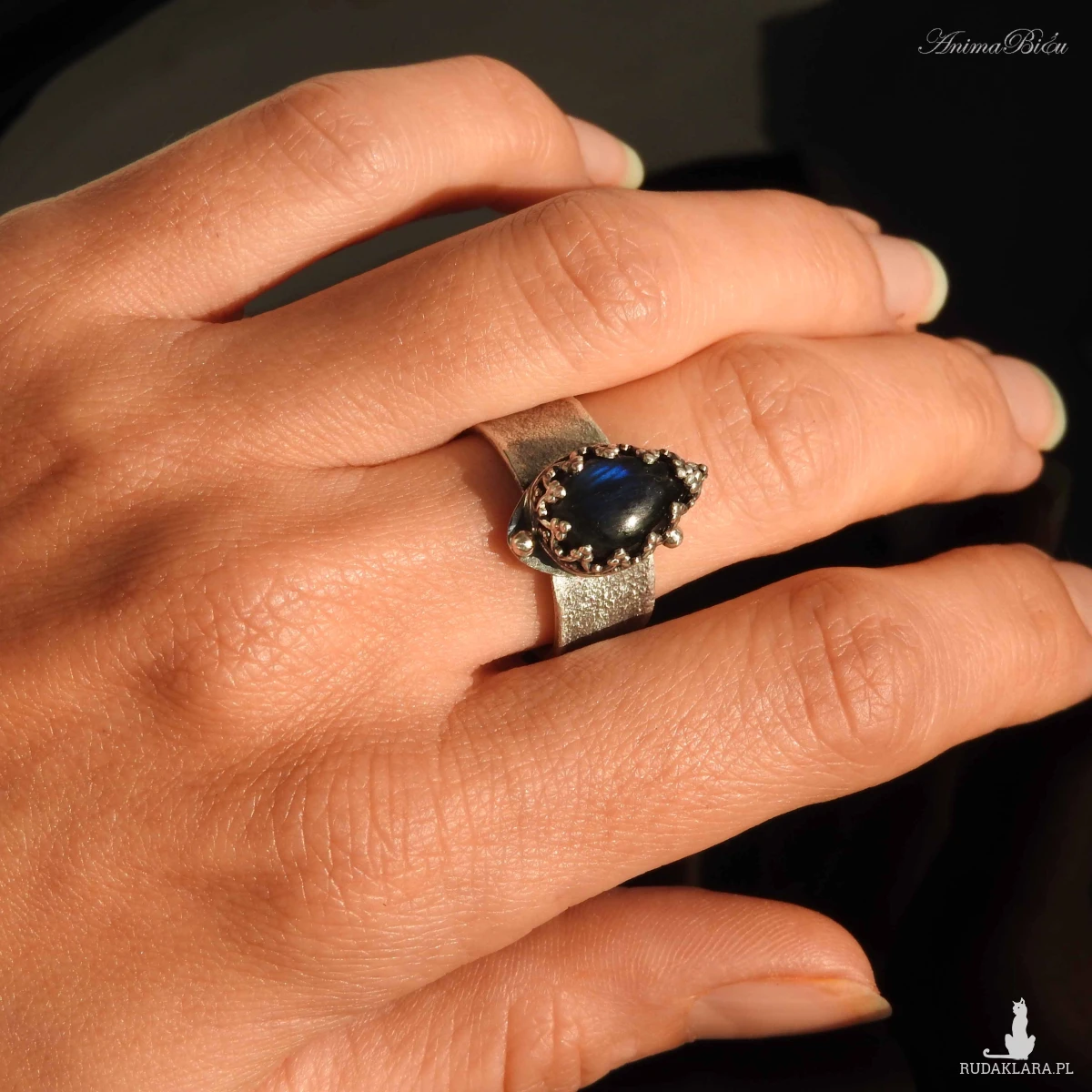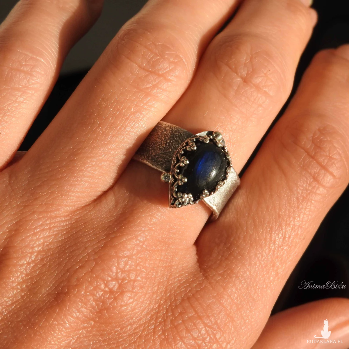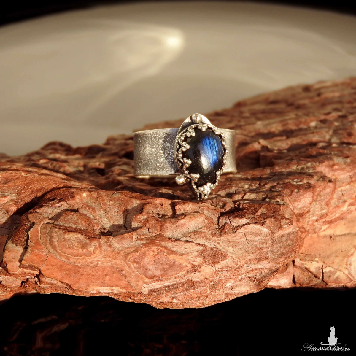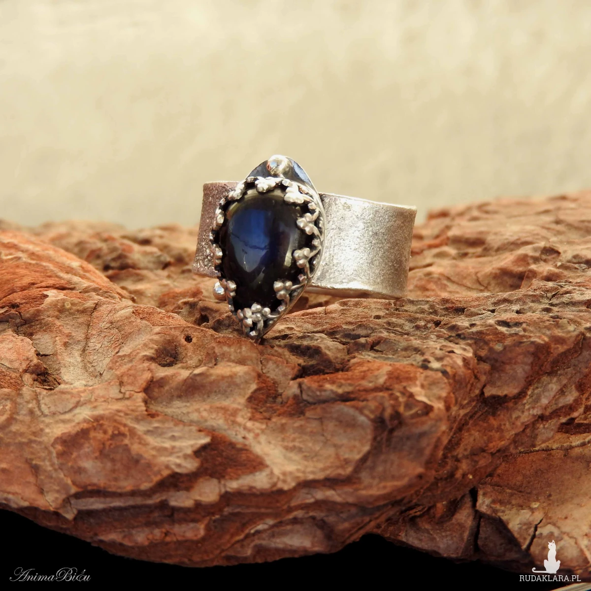 Obrączka srebrna z labradorytem. Tajemniczy, bardzo ciemny,