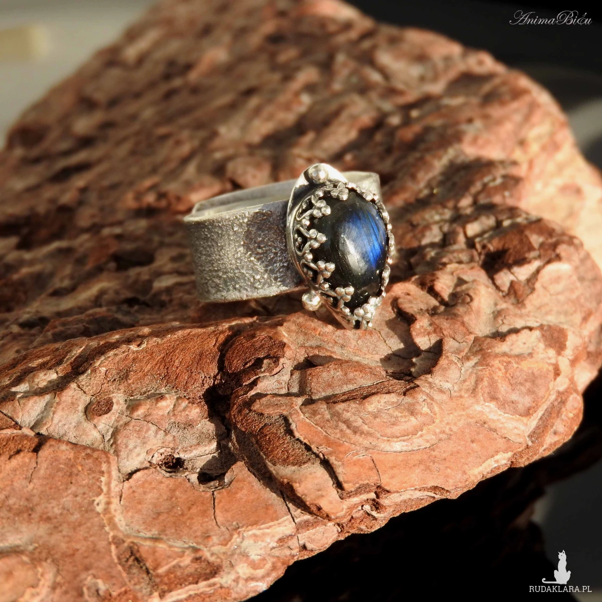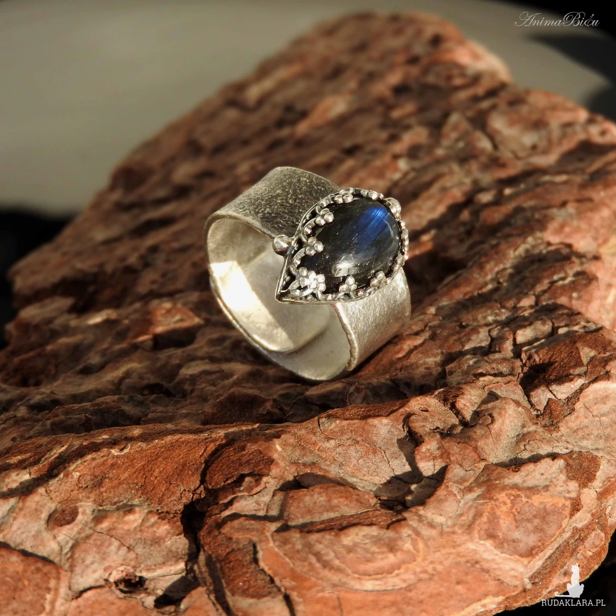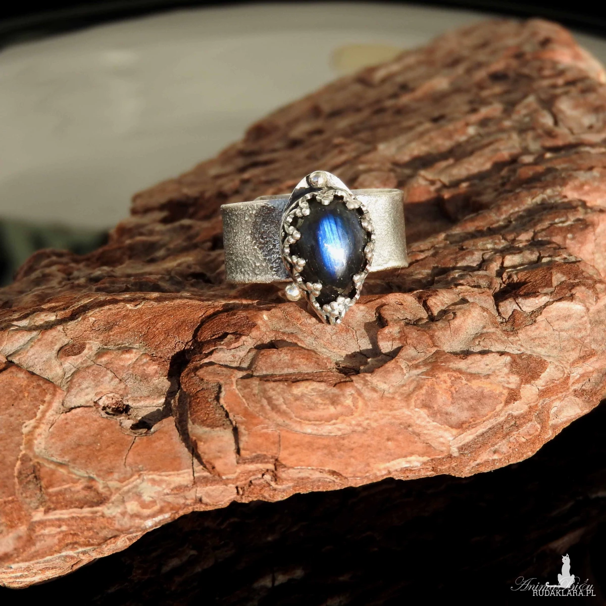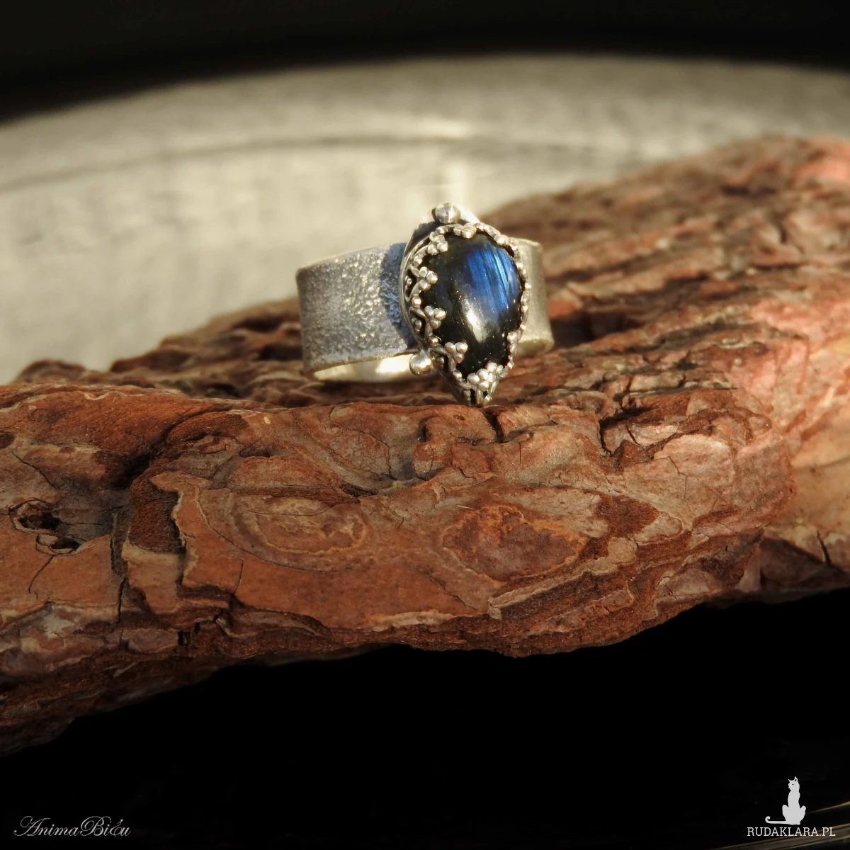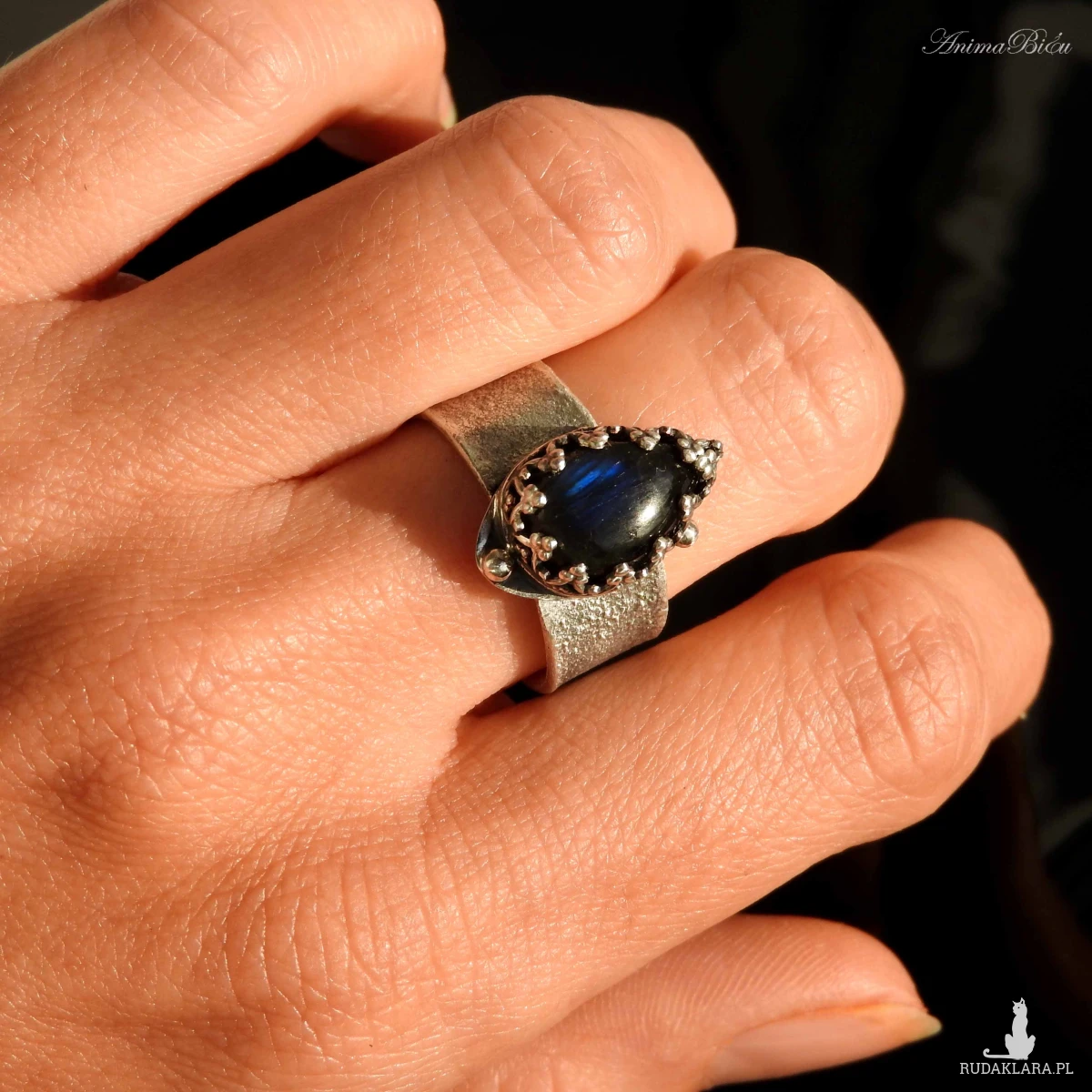 Obrączka srebrna z labradorytem. Tajemniczy, bardzo ciemny,