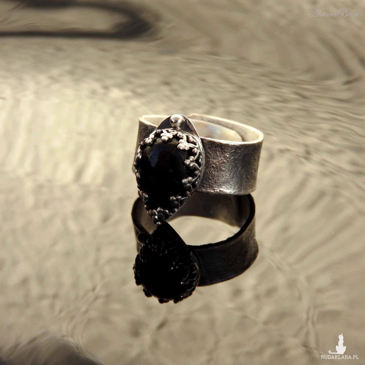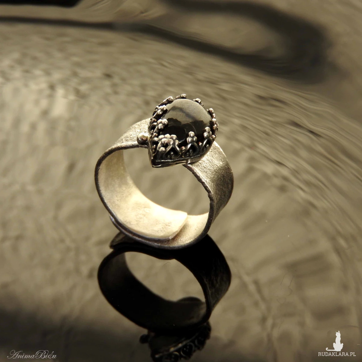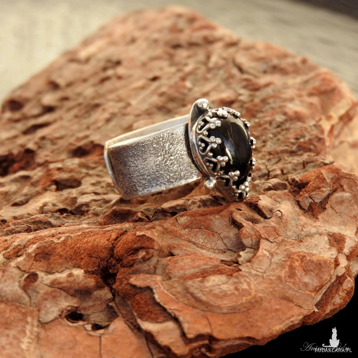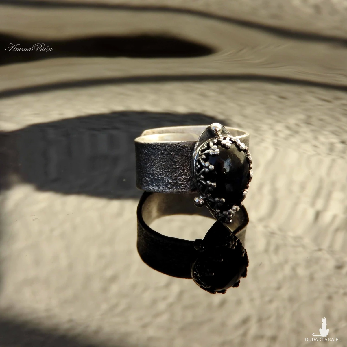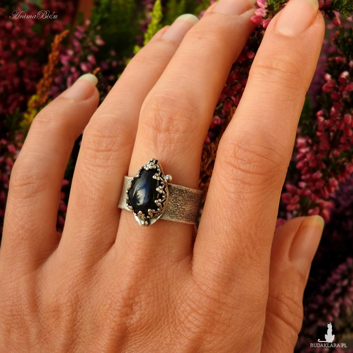 Obrączka srebrna z labradorytem. Tajemniczy, bardzo ciemny,