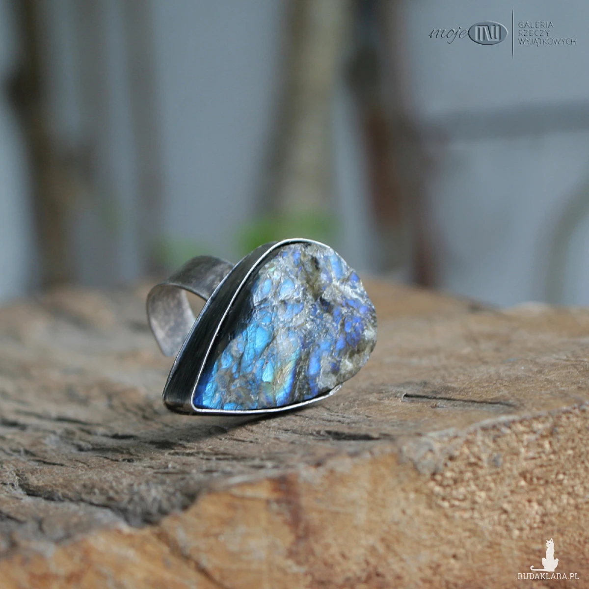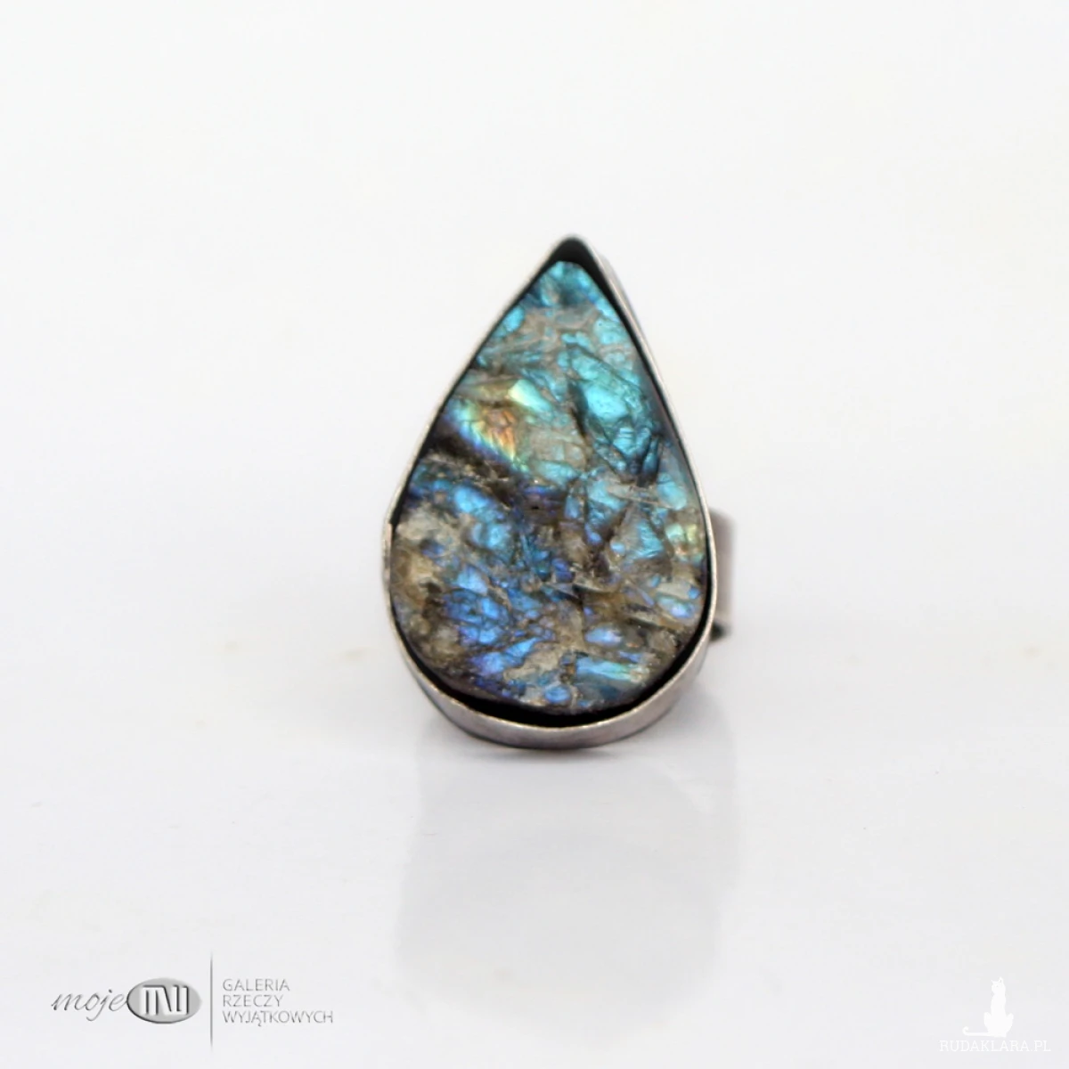 Pierścionek z surowym labradorytem w kształcie łzy. Kamień oprawiony jest prosto w srebro - szeroka obrączka i minimalistyczna oprawa.