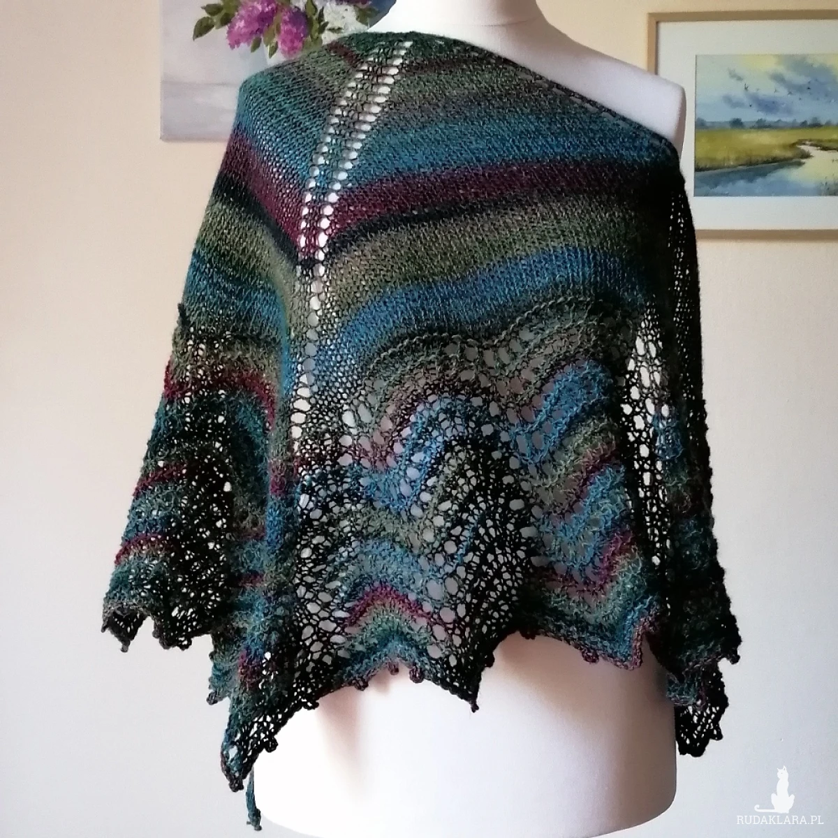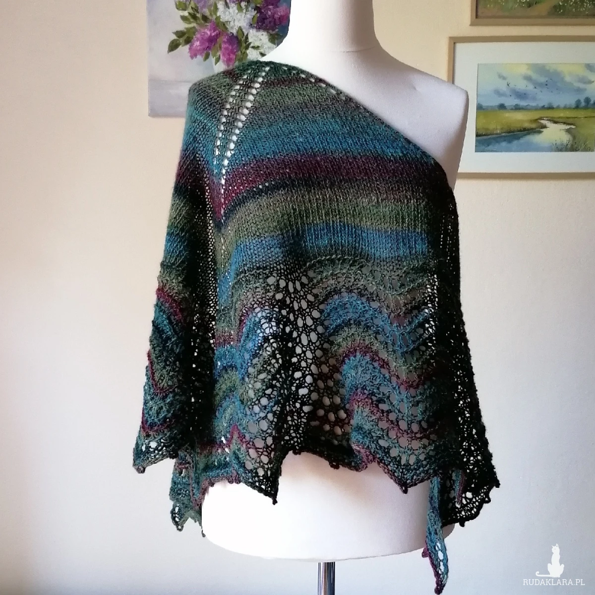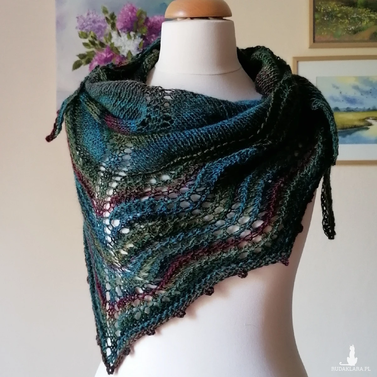 Miła, lekka, świetnie układająca się chusta wykonana ręcznie na drutach z doskonałej hiszpańskiej włóczki wełniano - akrylowej (przewaga wełny). Chusta jest przyjemna dla skóry, a ciekawy układ kolorystyczny czyni ją interesującą dla oka. Wymiary chusty: 174 cm. bok najdłuższy, 74 cm wysokość trójkąta. Pranie ręczne.