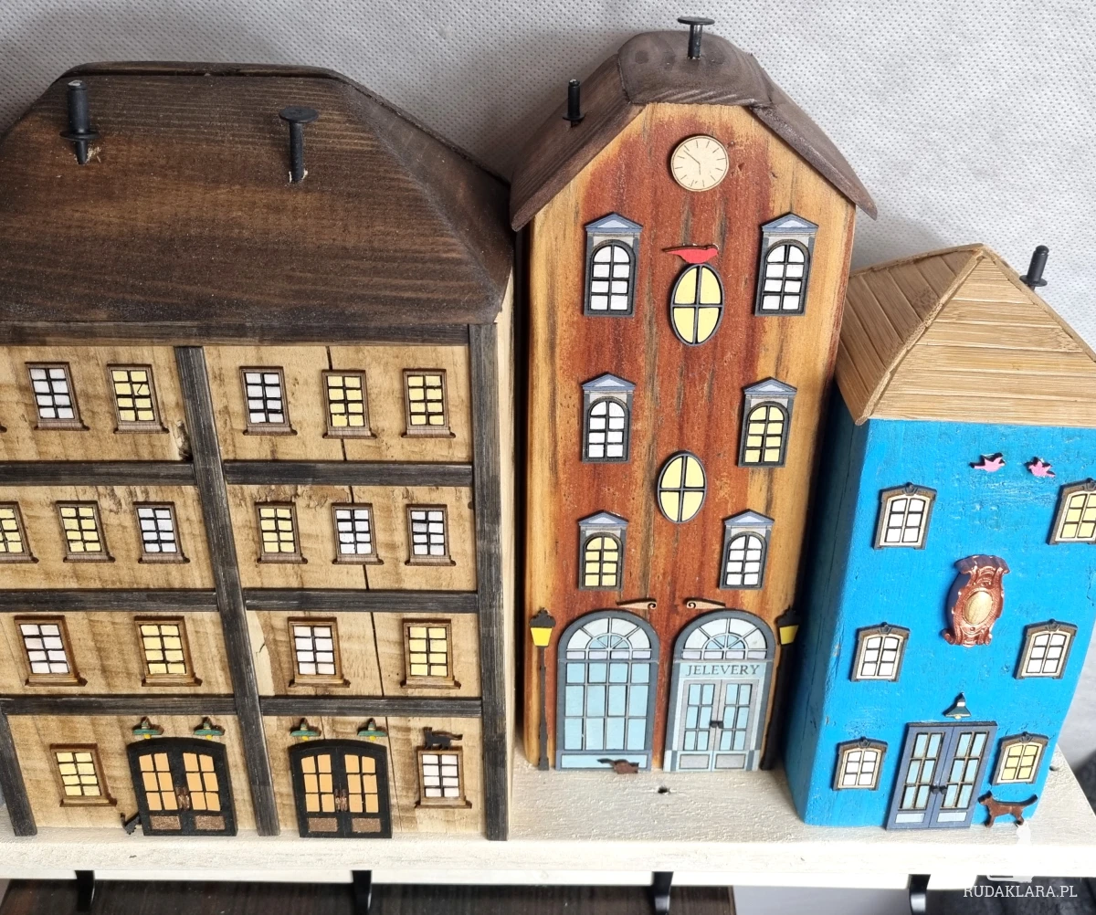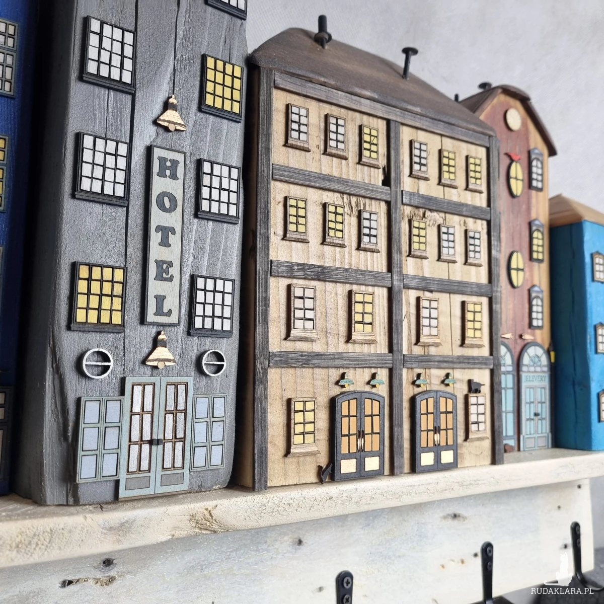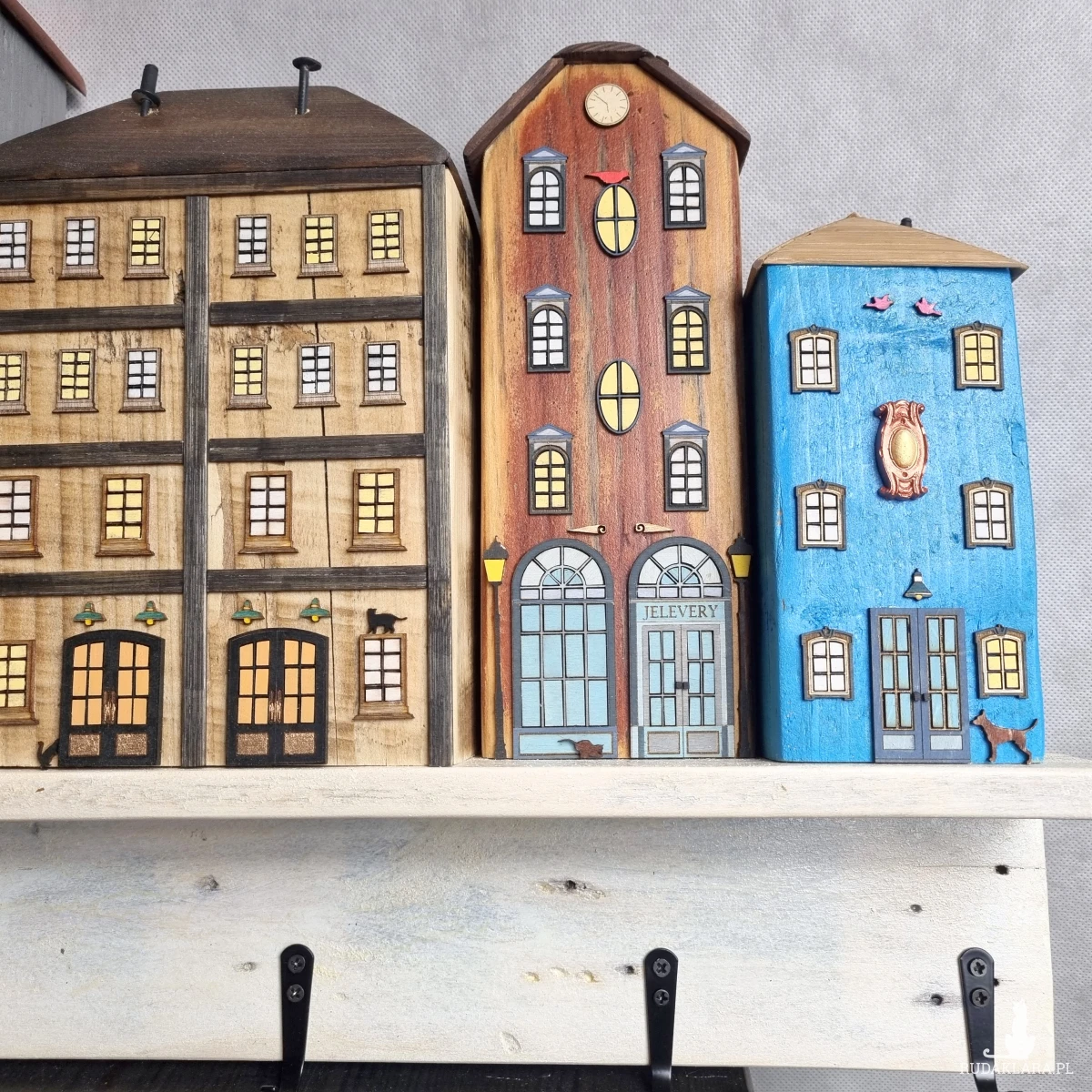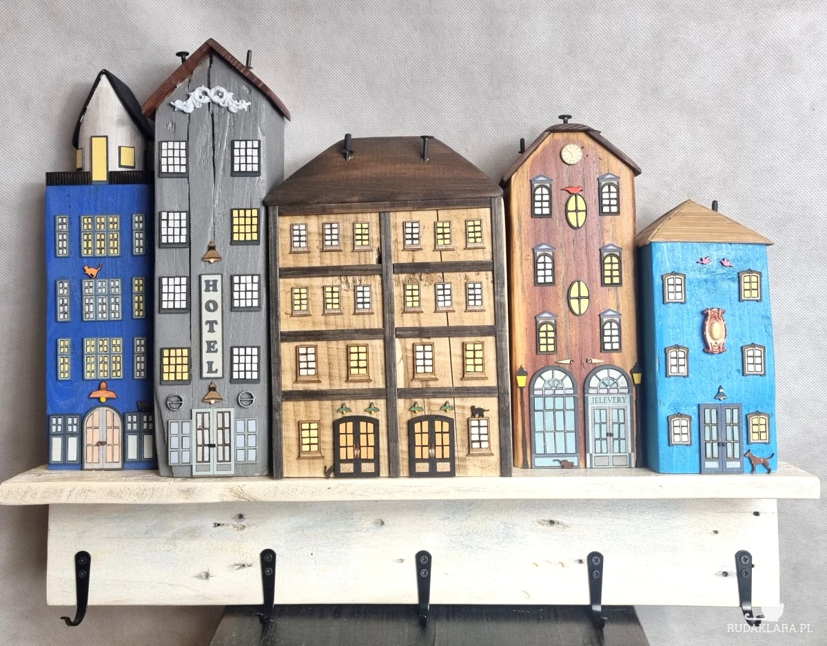 Drewniane domki handmade, mogące służyć jako wieszak na klucze (5), ręczniki inne drobiazgi. Domki wykonane desek ze starych palet z odzysku. Drewno bejcowane, woskowane, malowane w różnych odcieniach - ładnie podkreślające starość drewna - malowane bezbarwną farbą akrylową. Drewniane, wycinane okna i drzwi, również inne detale. Długość 53 cm, wysokość 41 cm, grubość 9 cm . Całość do zawieszenia na ścianie na 2 hakach. (9.)