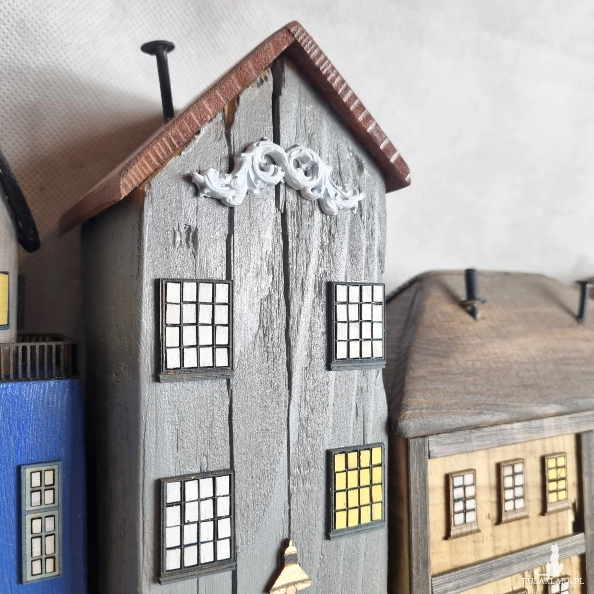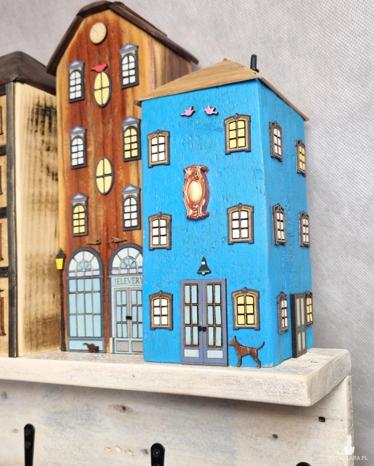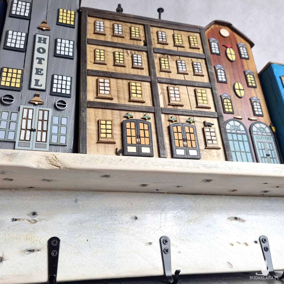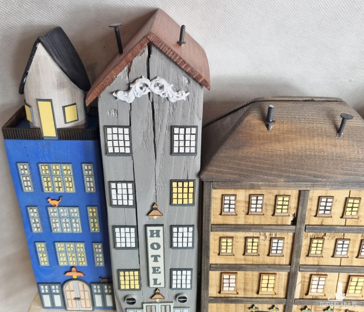 Drewniane domki handmade, mogące służyć jako wieszak na klucze (5), ręczniki inne drobiazgi. Domki wykonane desek ze starych palet z odzysku. Drewno bejcowane, woskowane, malowane w różnych odcieniach - ładnie podkreślające starość drewna - malowane bezbarwną farbą akrylową. Drewniane, wycinane okna i drzwi, również inne detale. Długość 53 cm, wysokość 41 cm, grubość 9 cm . Całość do zawieszenia na ścianie na 2 hakach. (9.)