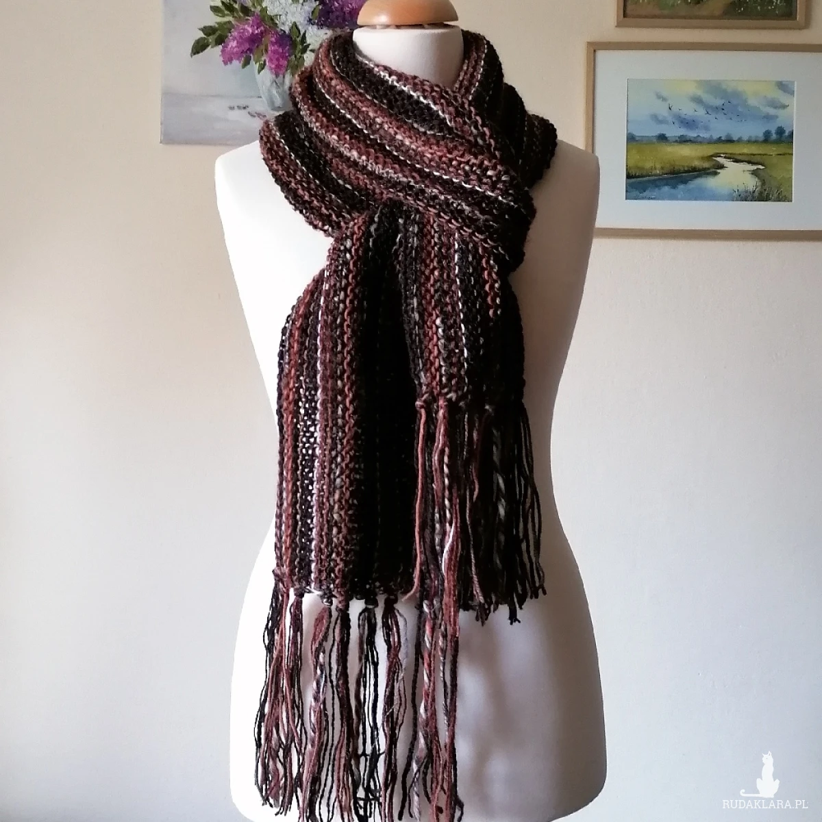 Dwustronny, mięsisty szal wykonany ręcznie na drutach z indywidualnie dobranych, delikatnych, a przy tym ciepłych włóczek, o składzie: wełna, wełenka merino, jedwab, alpaka, niewielka ilość akrylu. Niezwykle miękki, pięknie się układający. Wymiary bez frędzli: dł. 240 cm., szer. na płasko 22 cm. Zdjęcia nie oddają miękkości i faktury (zgrubienia, melanże) użytych włóczek. Polecam zarówno paniom, jak i panom. Pranie ręczne.