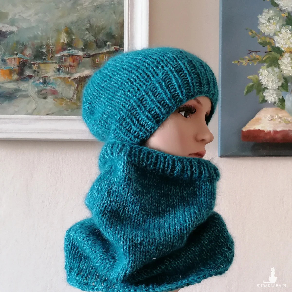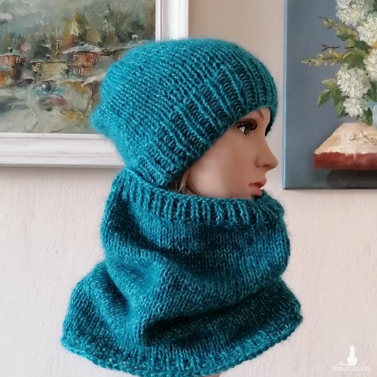 Puszysty, miły, ciepły, lekki, bezszwowy komplet, wykonany ręcznie na drutach z indywidualnie dobranych włóczek o składzie: wełna, jedwab, moher, alpaka, akryl. Sztucznych włókien ok. 10%. Komplet utrzymany w ciekawym, głębokim odcieniu szmaragdu z nutą turkusu. Włóczki są cudownie miękkie, a komplet oryginalny i bardzo twarzowy. Wymiary: czapka dł. 26 cm. polecam dla obwodów głowy 56-57, komin szer. 54 (góra), 62 (dół), dł. 38 cm.