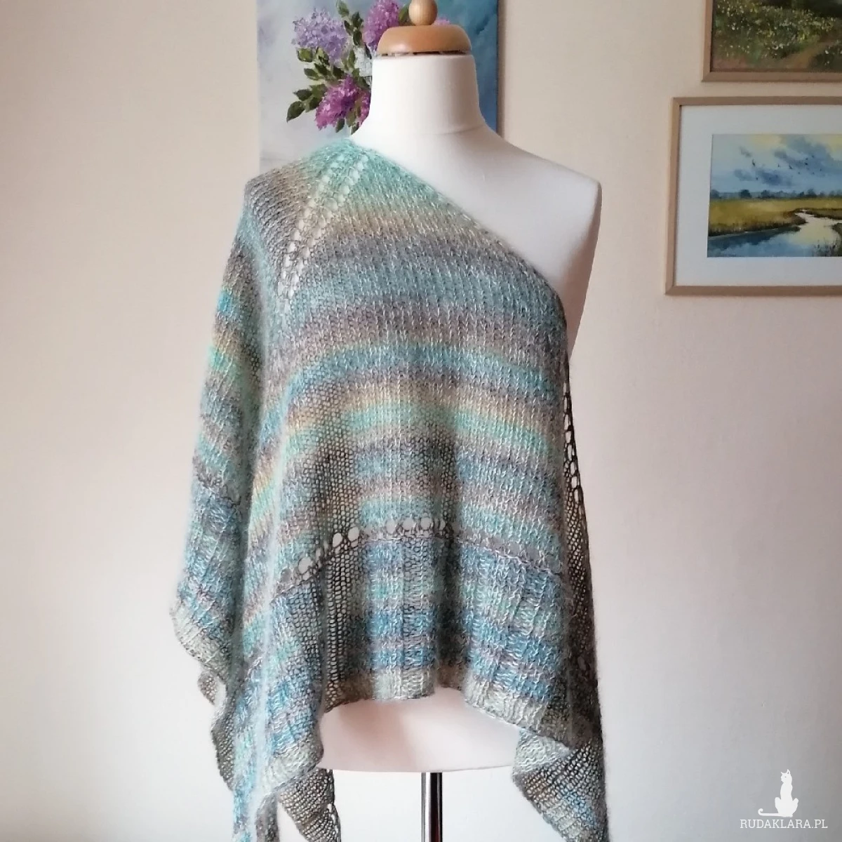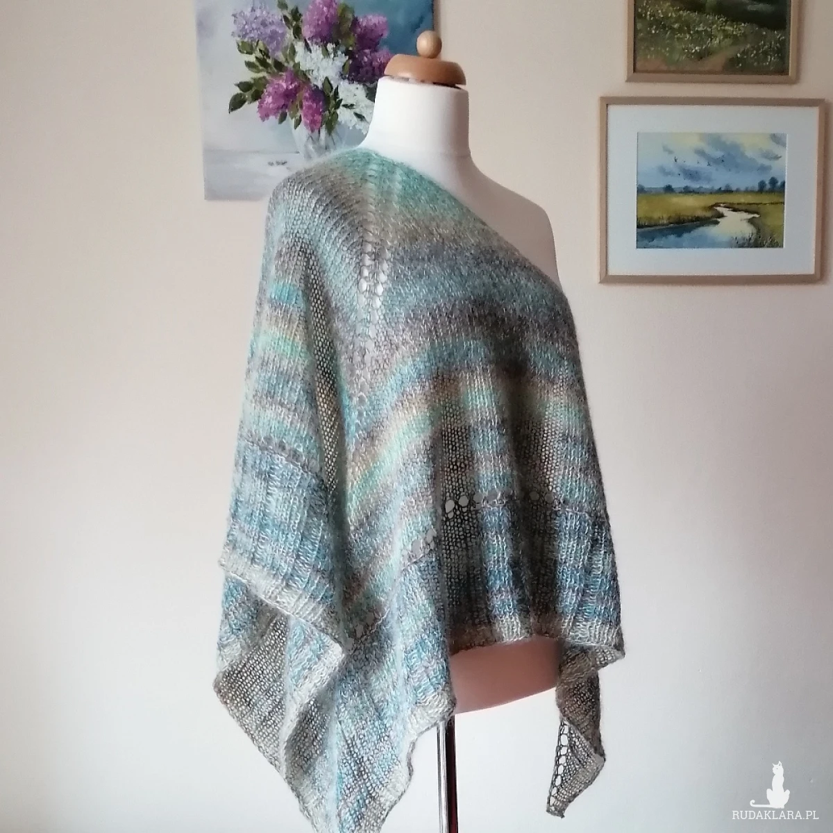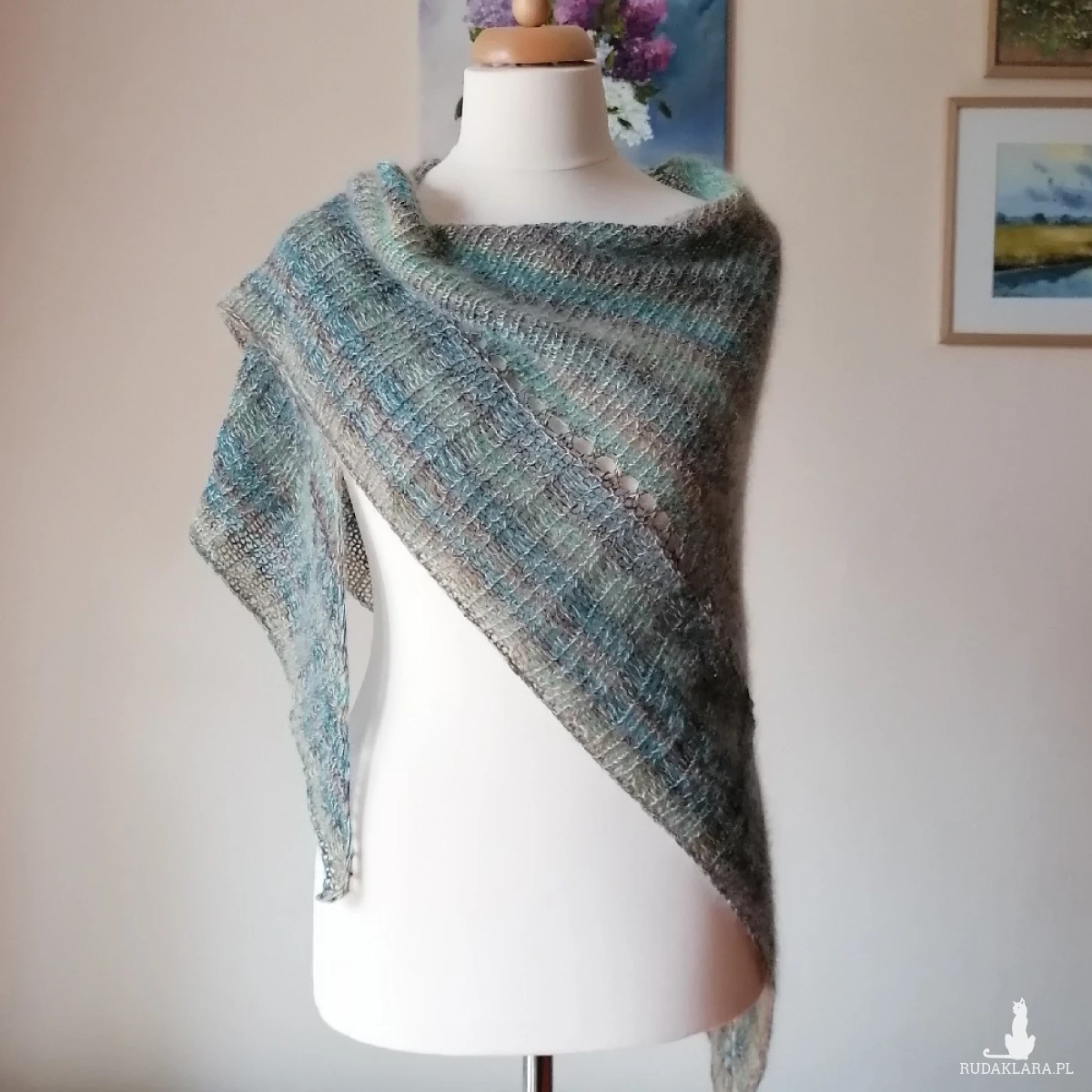 Bardzo duża ekskluzywna chusta wykonana ręcznie na drutach podwójną nitką z najwyższej jakości włóczek: cudownie miękkiego francuskiego moheru z jedwabiem (75%/25%) i niezwykłej, certyfikowanej (niestety znacznie droższej) włóczki niemieckiego producenta (wełenka pochodzi z Patagonii) o składzie: 85% merino, 15% poliamid. Kombinacja włóczek dała nie tylko wyjątkowy efekt kolorystyczny (brak srebrnych nitek!), ale też twarzowe odcienie, pasujące do różnych typów urody. Chusta jest bardzo ciepła, miła, delikatnie puchata i przede wszystkim lekka. Latem z powodzeniem zastąpi wierzchnie okrycie, a w chłodniejszych miesiącach będzie świetnym dodatkiem do dowolnych stylizacji. Chustą można otulić nią cała sylwetkę. Wymiary: 202 cm. bok najdłuższy, 102 wysokość trójkąta. Pranie wyłącznie ręczne.