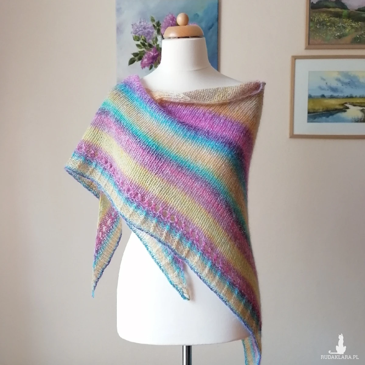 Bardzo duża chusta wykonana ręcznie na drutach podwójną nitką z uroczych włóczek: moheru z poliamidem (75%/25%) i włóczki niemieckiego producenta, utrzymanej w uroczo-pastelowej (ale nie mdłej) tonacjach o składzie: wełna, wełenka merino i niewielka ilość akrylu. Kombinacja włóczek dała ciekawy efekt kolorystyczny. Chusta jest bardzo ciepła, puchata, a przy tym lekka. Jest lejąca i pięknie się układa. To ciepła chusta, która otulając latem i wiosną sylwetkę, zastąpi okrycie wierzchnie, a zimą i jesienią przytulnie ogrzeje. Wymiary: 224 cm. bok najdłuższy, 108 wysokość trójkąta. (Brak jakichkolwiek srebrnych nitek, jeśli są widoczne, to efekt odbicia światła w soczewce aparatu). Pranie wyłącznie ręczne.