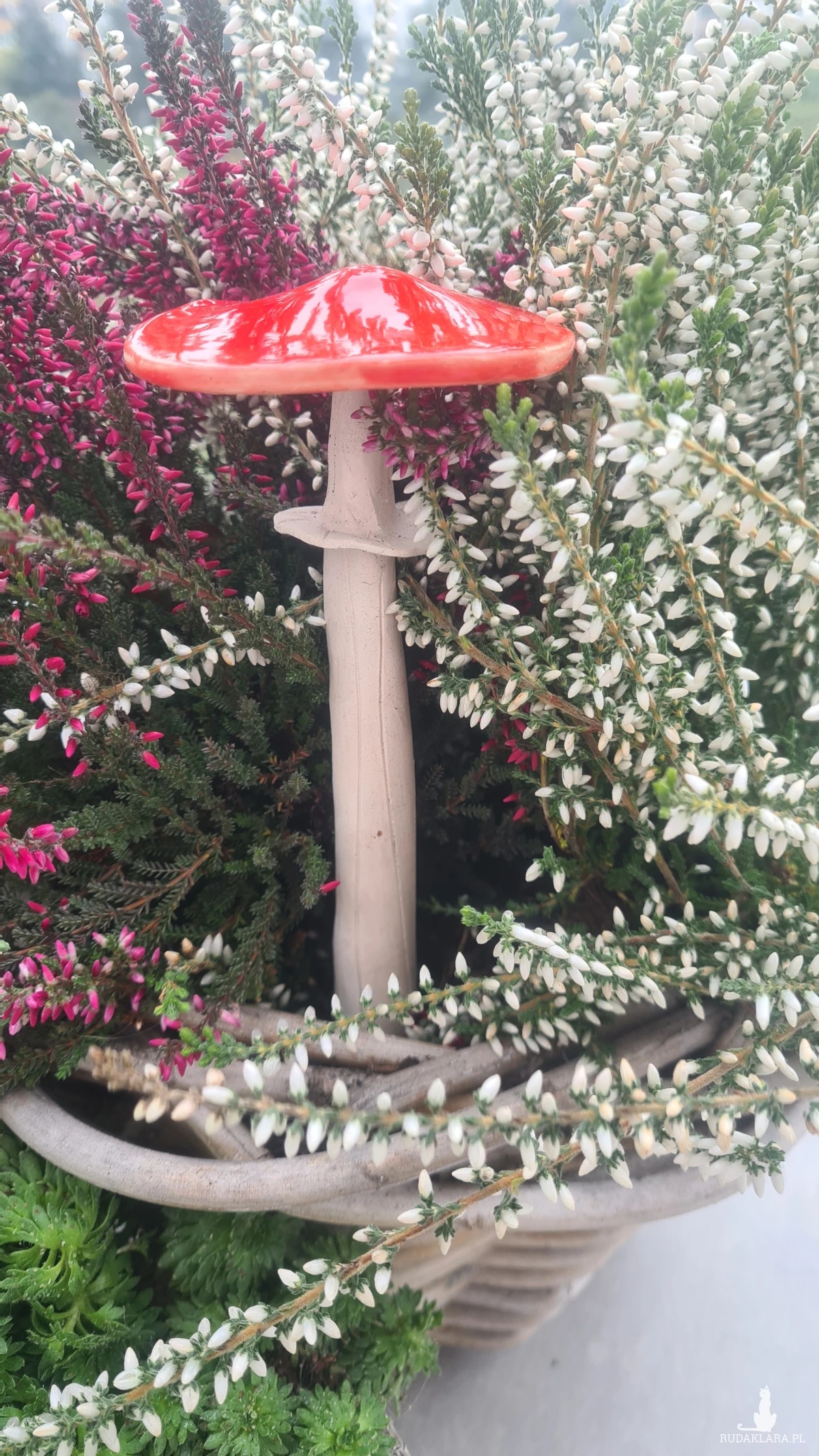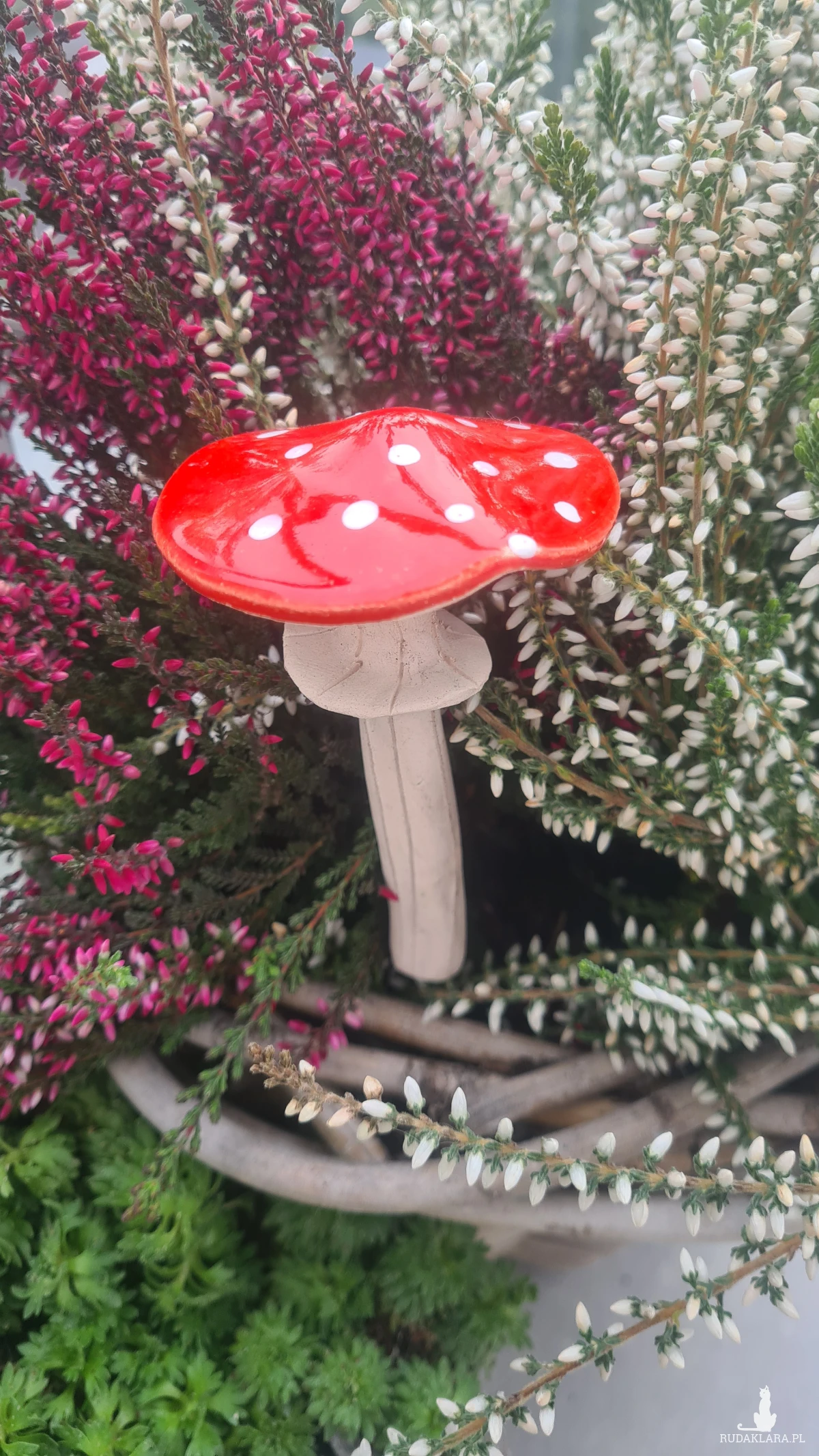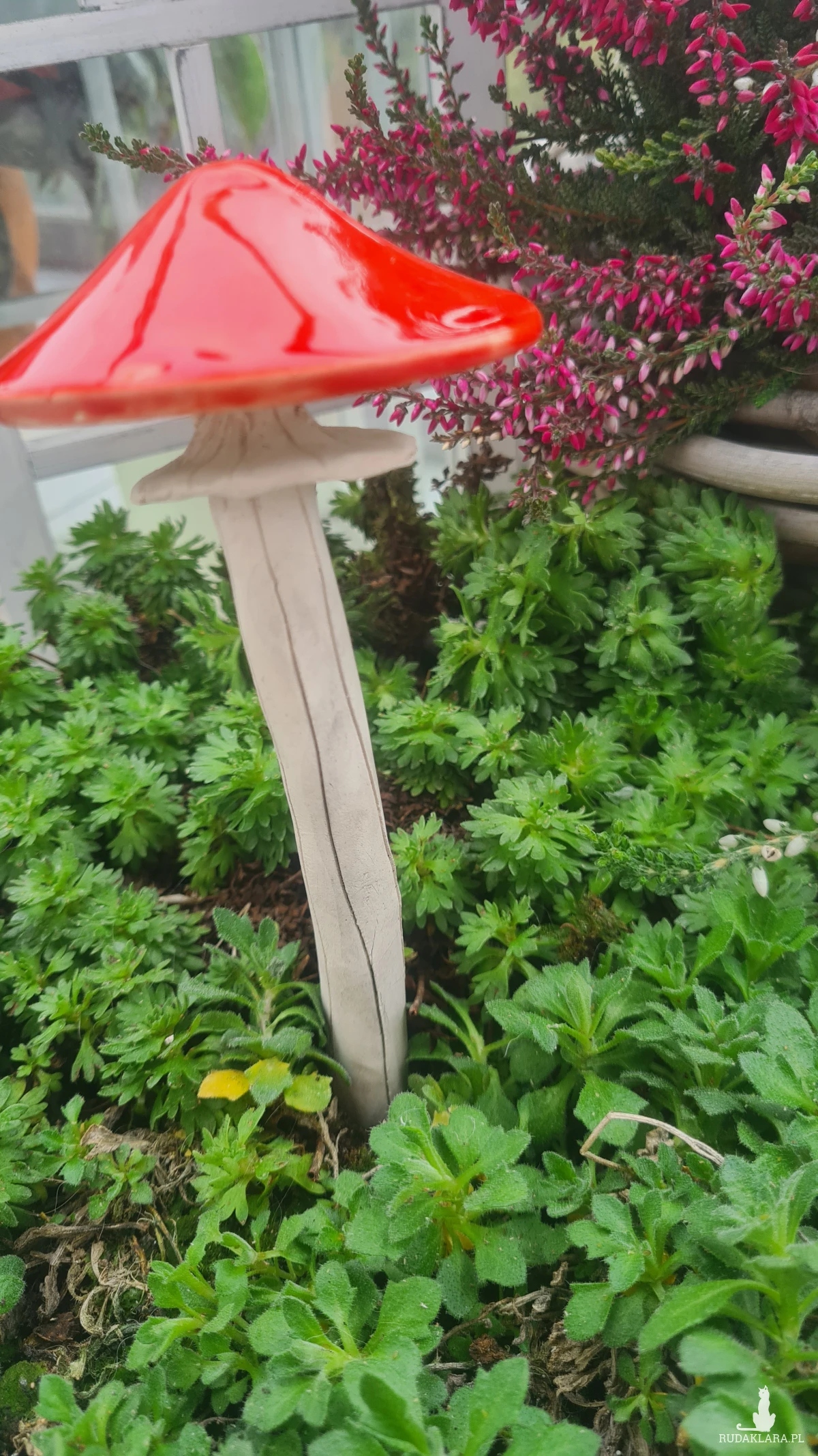 Ręcznie wykonany grzybek ceramiczny na druciku do wbicia np. w doniczkę, szkliwiony i dwukrotnie wypalany w piecu ceramicznym. Wielkość około 10 - 15 cm, średnica kapelusza około 8 cm.