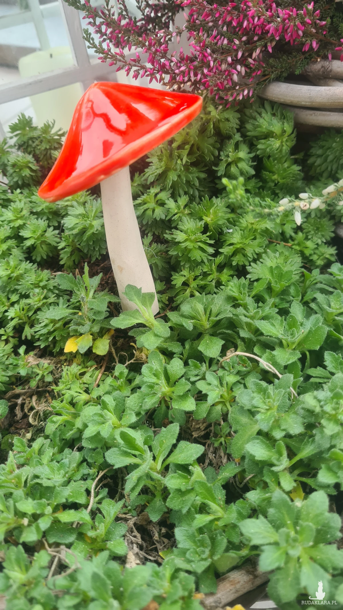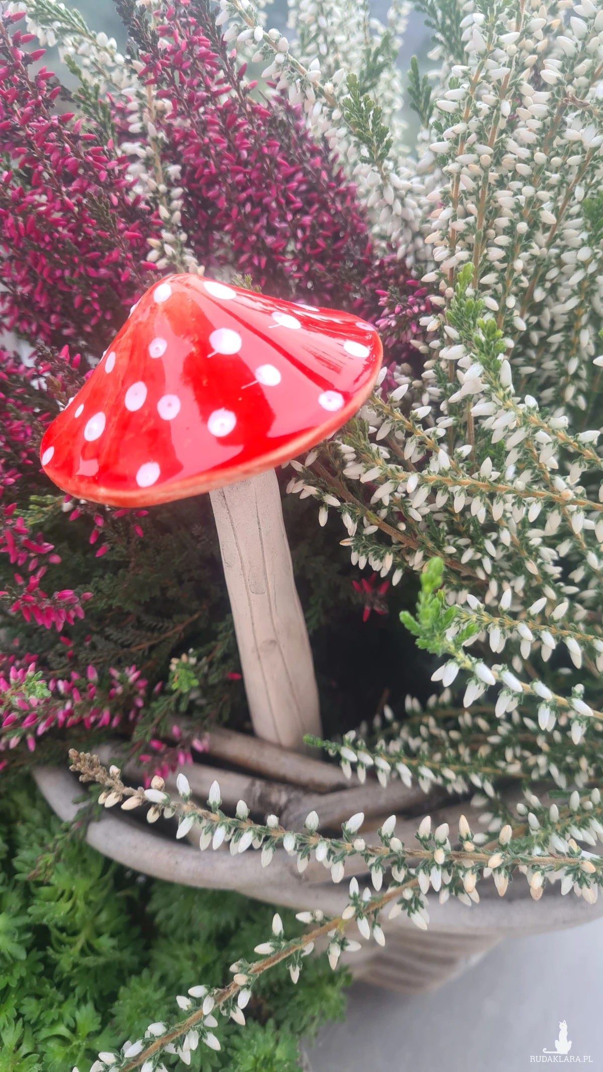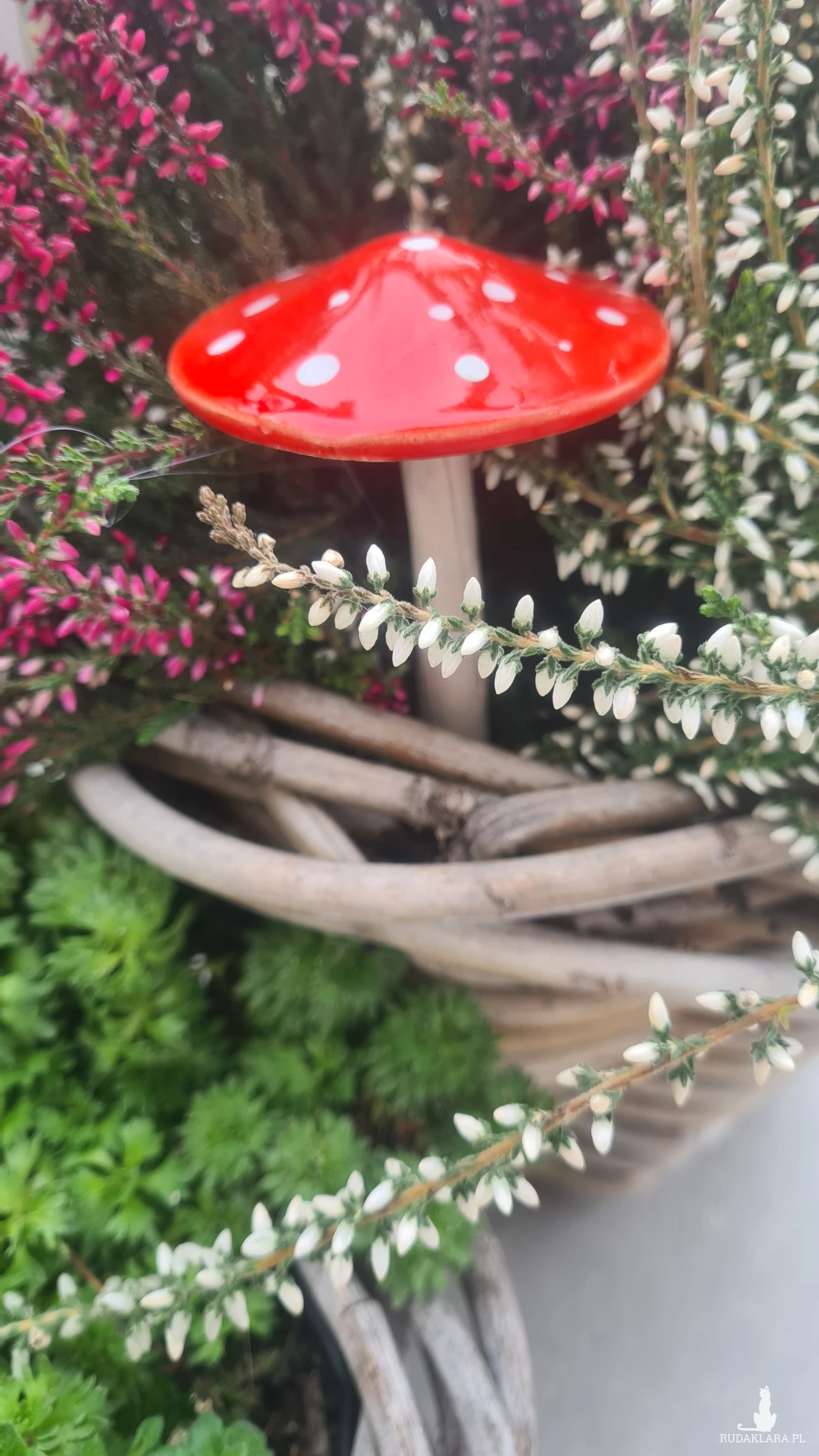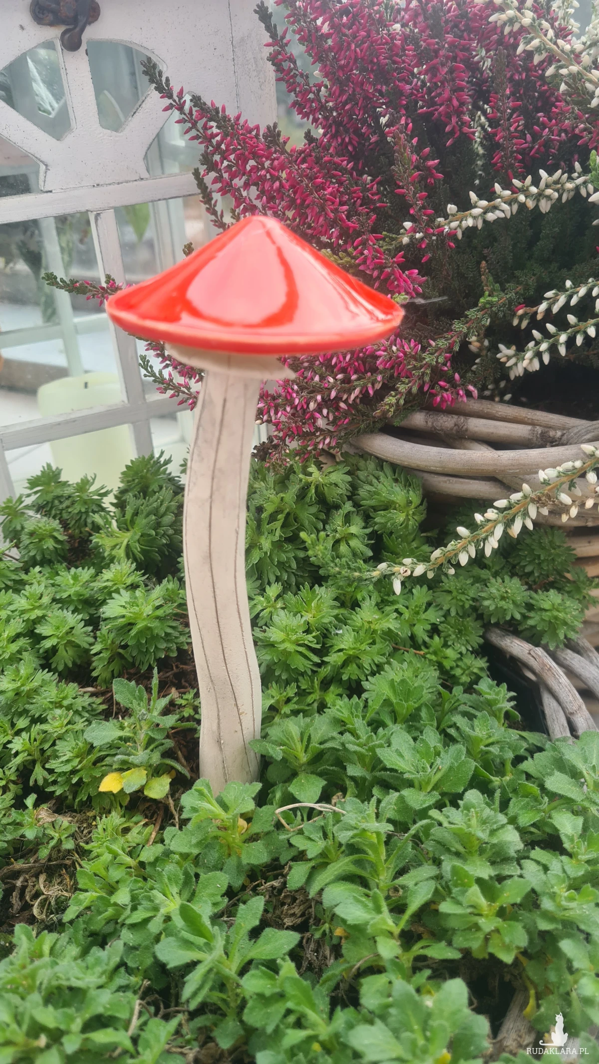 Ręcznie wykonany grzybek ceramiczny na druciku do wbicia np. w doniczkę, szkliwiony i dwukrotnie wypalany w piecu ceramicznym. Wielkość około 10 - 15 cm, średnica kapelusza około 8 cm.