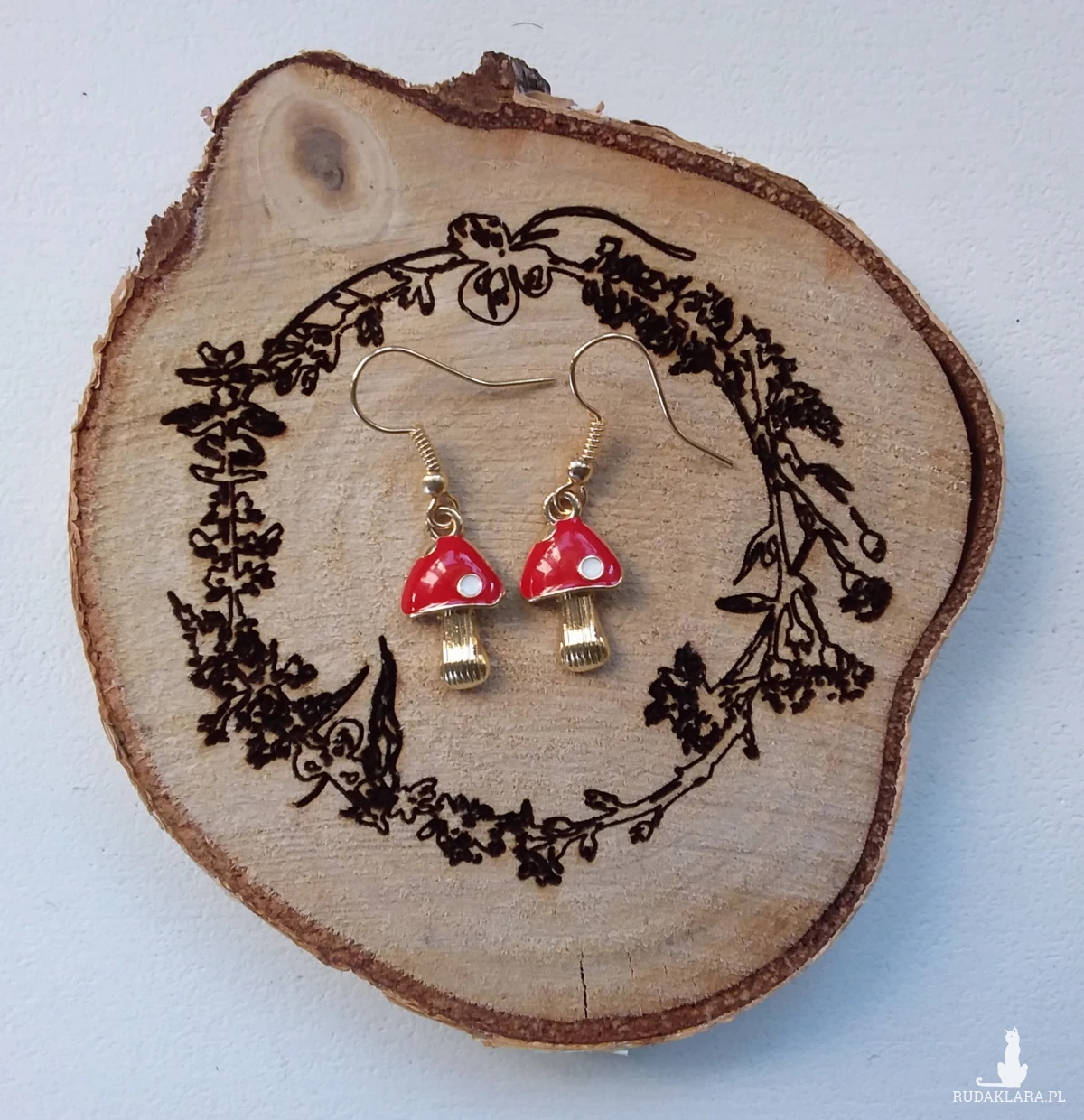 Kolczyki z motywem muchomorków, stal chirurgiczna. Dł. z biglem ok. 3,5 cm