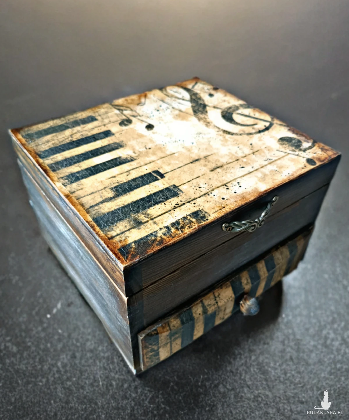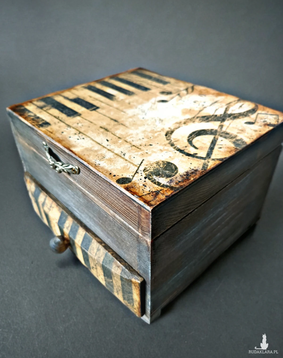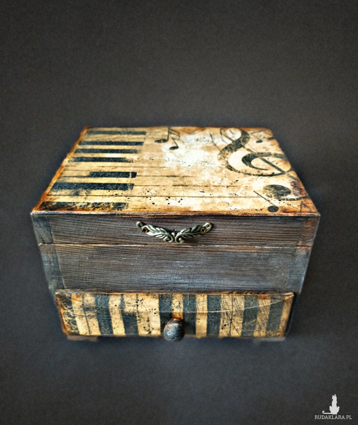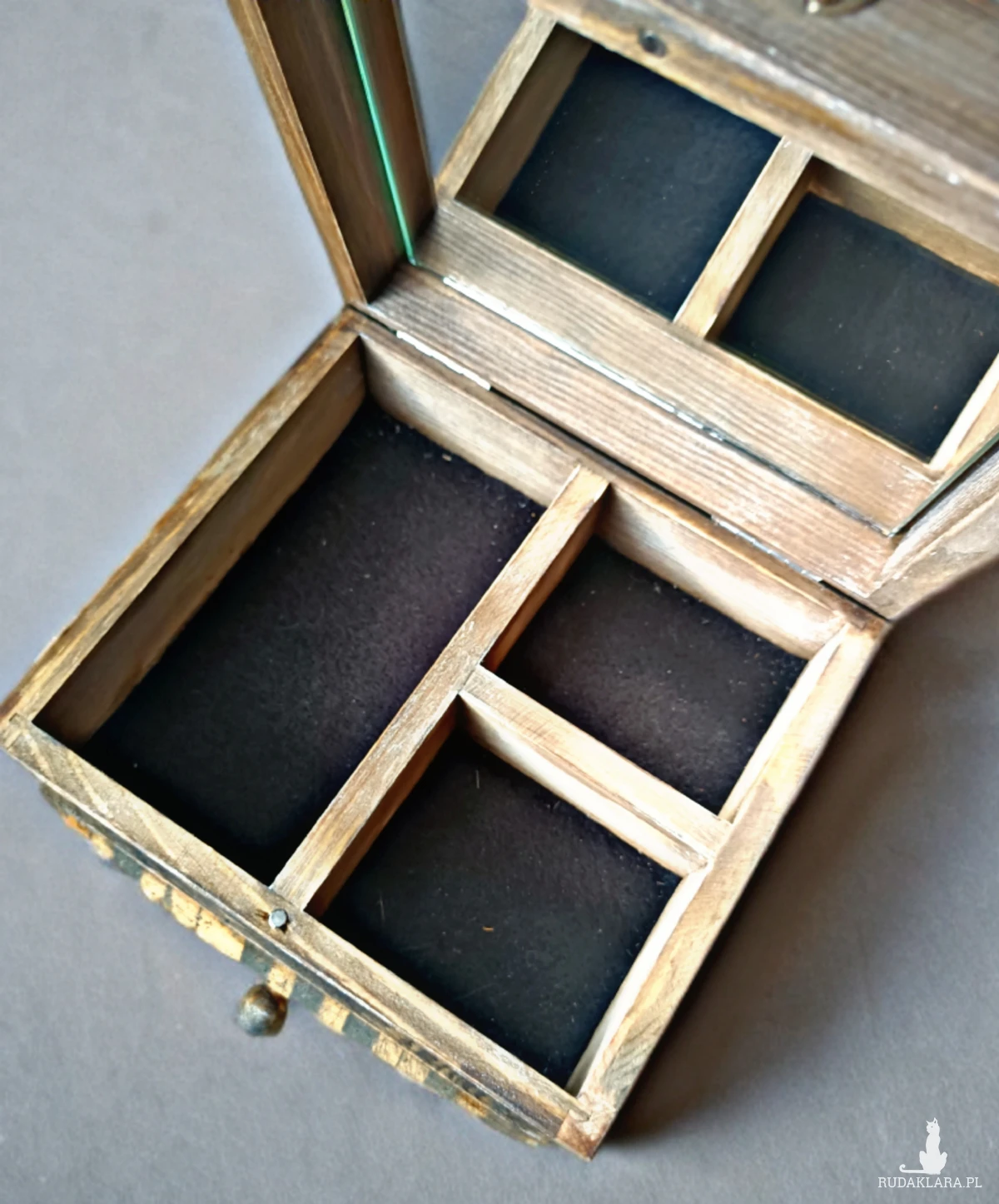 Drewniana skrzyneczka na biżuterię, z przegródkami, dodatkową szufladką i lusterkiem.