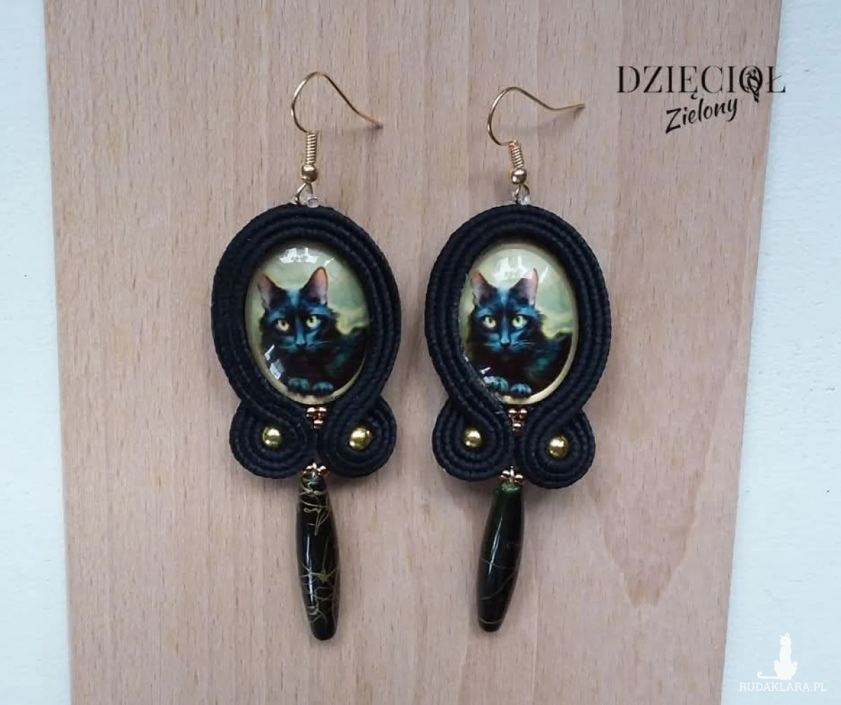 Kolczyki sutasz z motywem kota, bigle antyalergiczne. Wymiary 8,5 z 2,5 cm, waga 6 g (1 kolczyk)