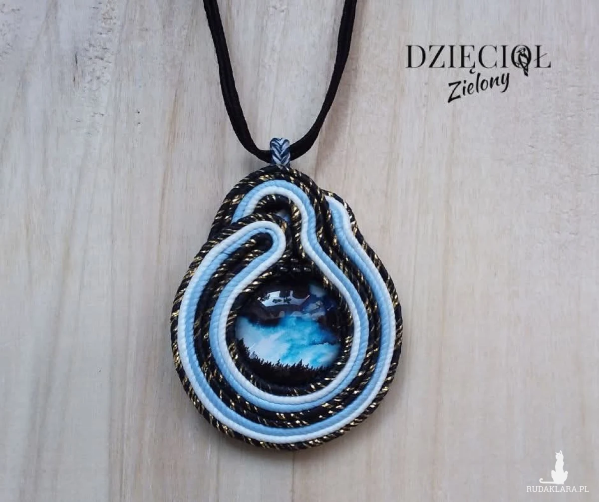 Ręcznie szyte wisiorek sutasz z motywem nocnego pejzażu. Wymiary 6 x 4,5 cm, waga 9 go.