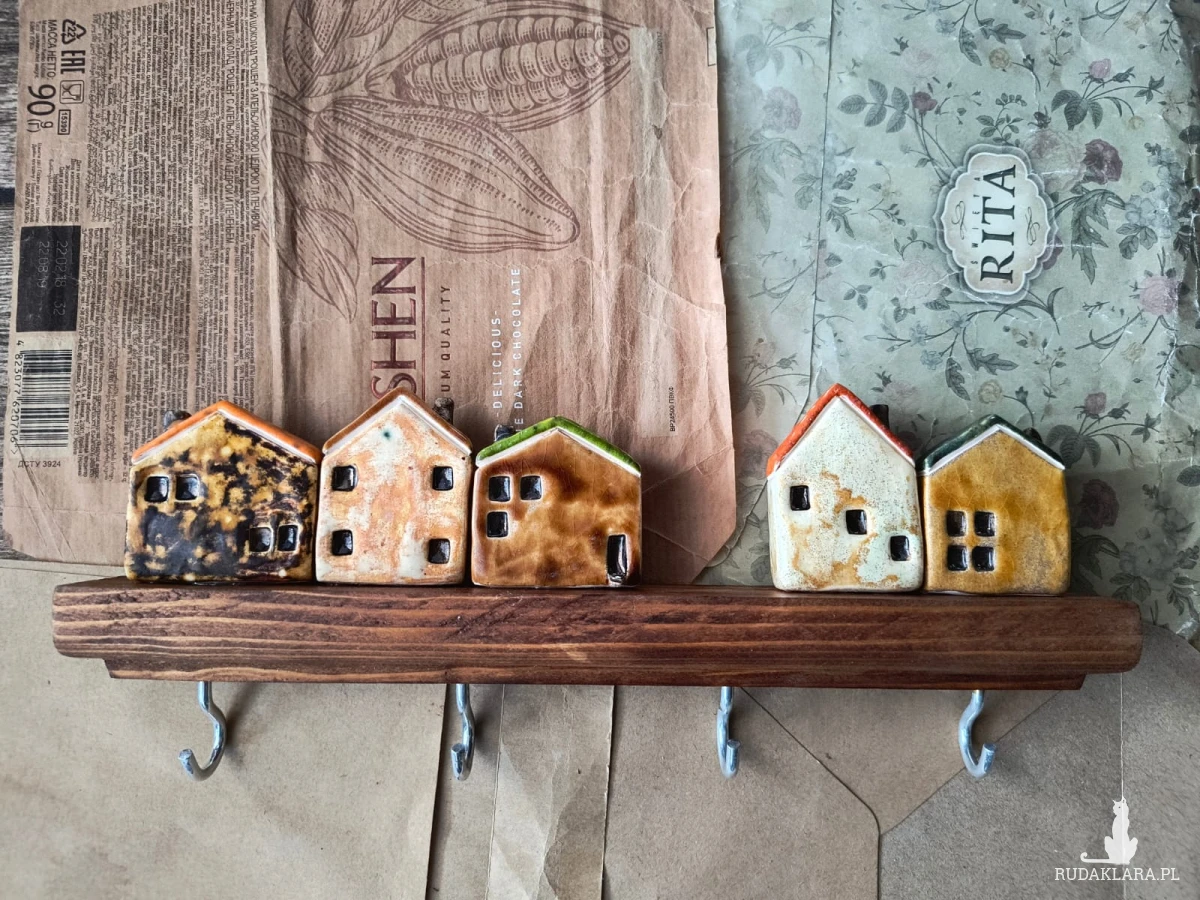 Wieszak z brązowo-beżowymi domkami, wykonanymi z ceramiki i wypalonymi w temp ok 1260 stopni C. O długości 25 cm. Polecam serdecznie.