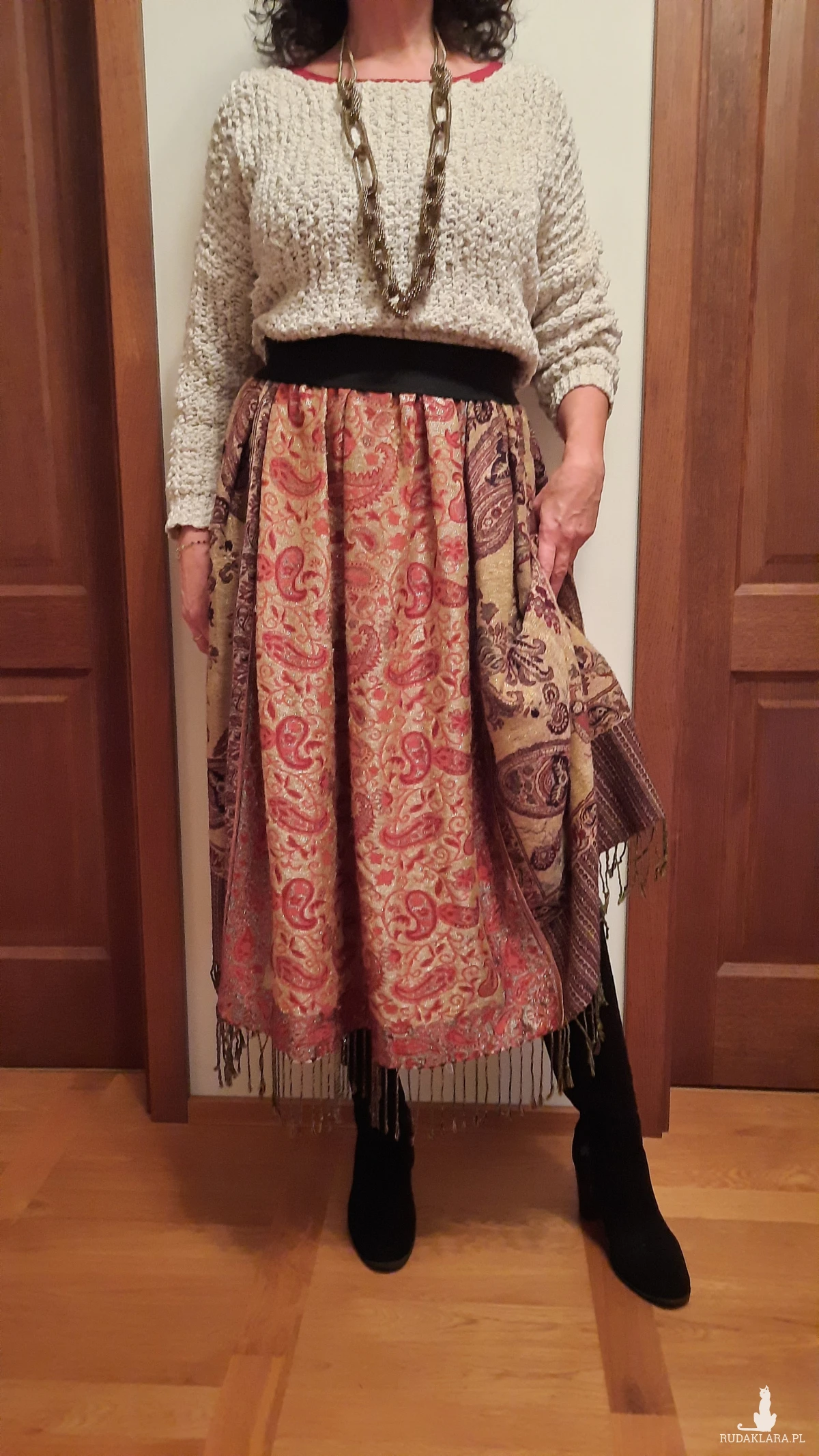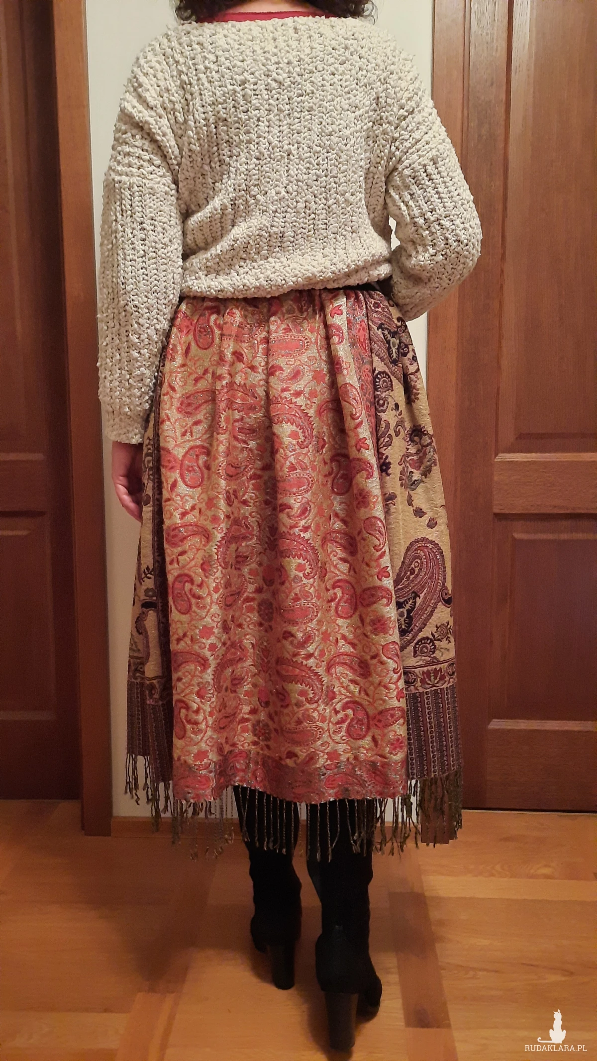 Sprzedam autorską spódnicę uszytą z dwóch cudownych szali ze złotą nitką i frędzlami. Spódnica jest DWUSTRONNA! . Jest na gumie ,guma 2x39, długość 86+5cm guma. Oryginał, jedyna, bardzo polecam! Zrób sobie prezent! Piękne kolory ! DAJĘ RZECZOM DRUGIE ŻYCIE!!!